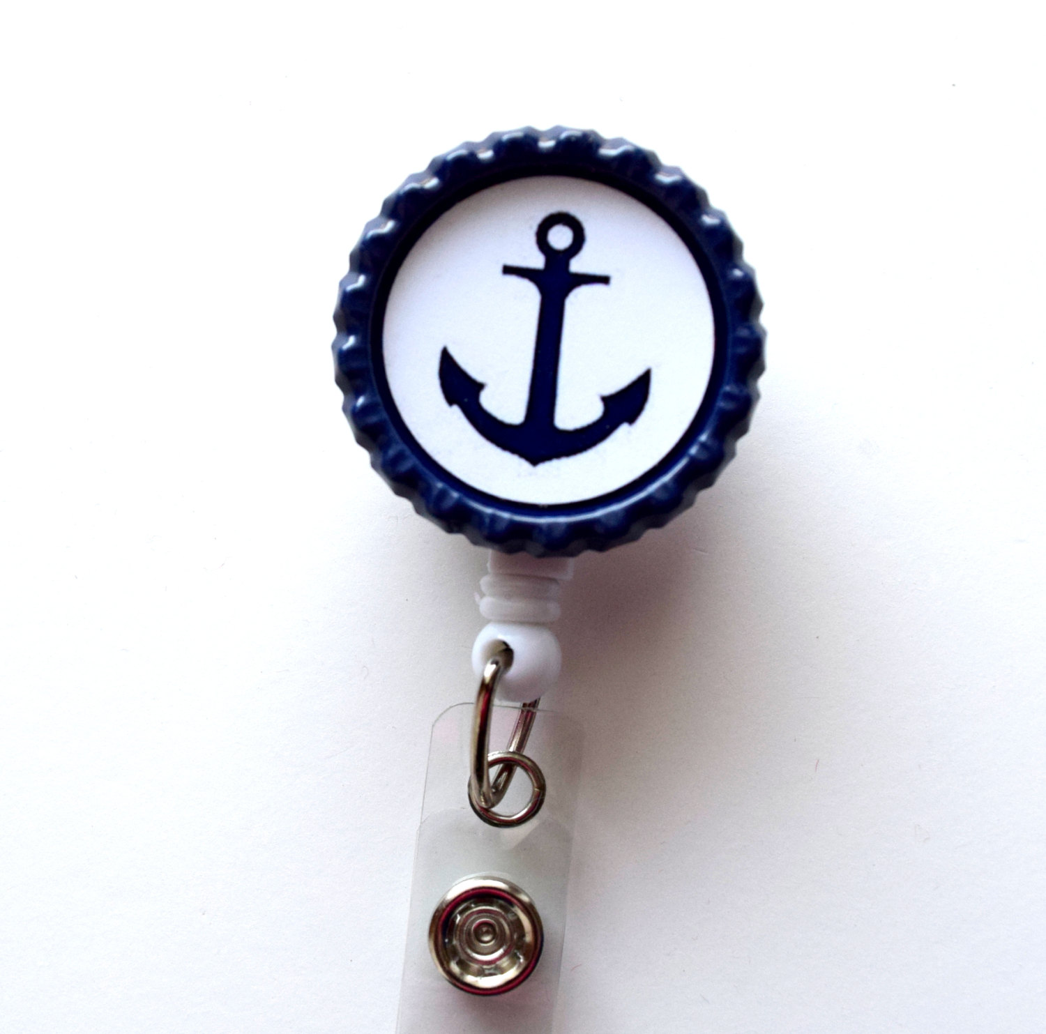 This ID Badge holder features a white and navy anchor graphic which sits on a white bottle cap. Graphic is sealed with an epoxy sealant. Perfect for anyone going on a cruise!