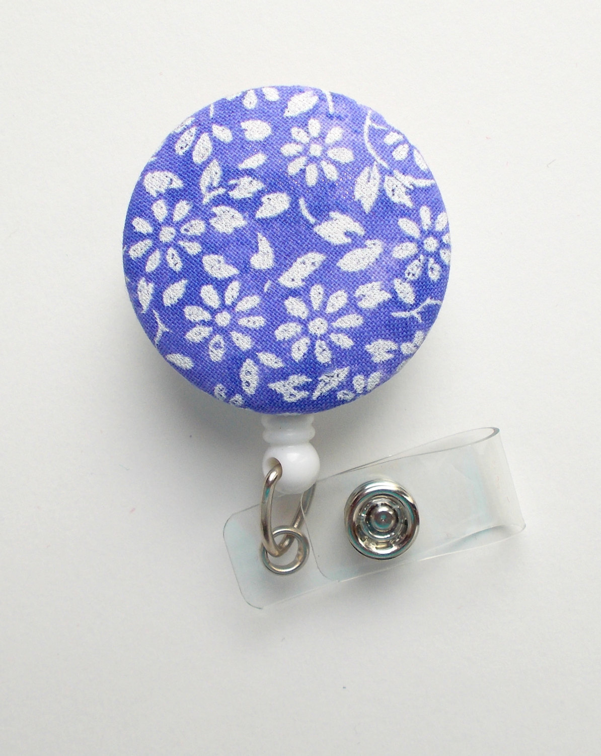 This ID badge reel features a purple and white floral fabric covered button. Button sits on a white, hard plastic badge reel.