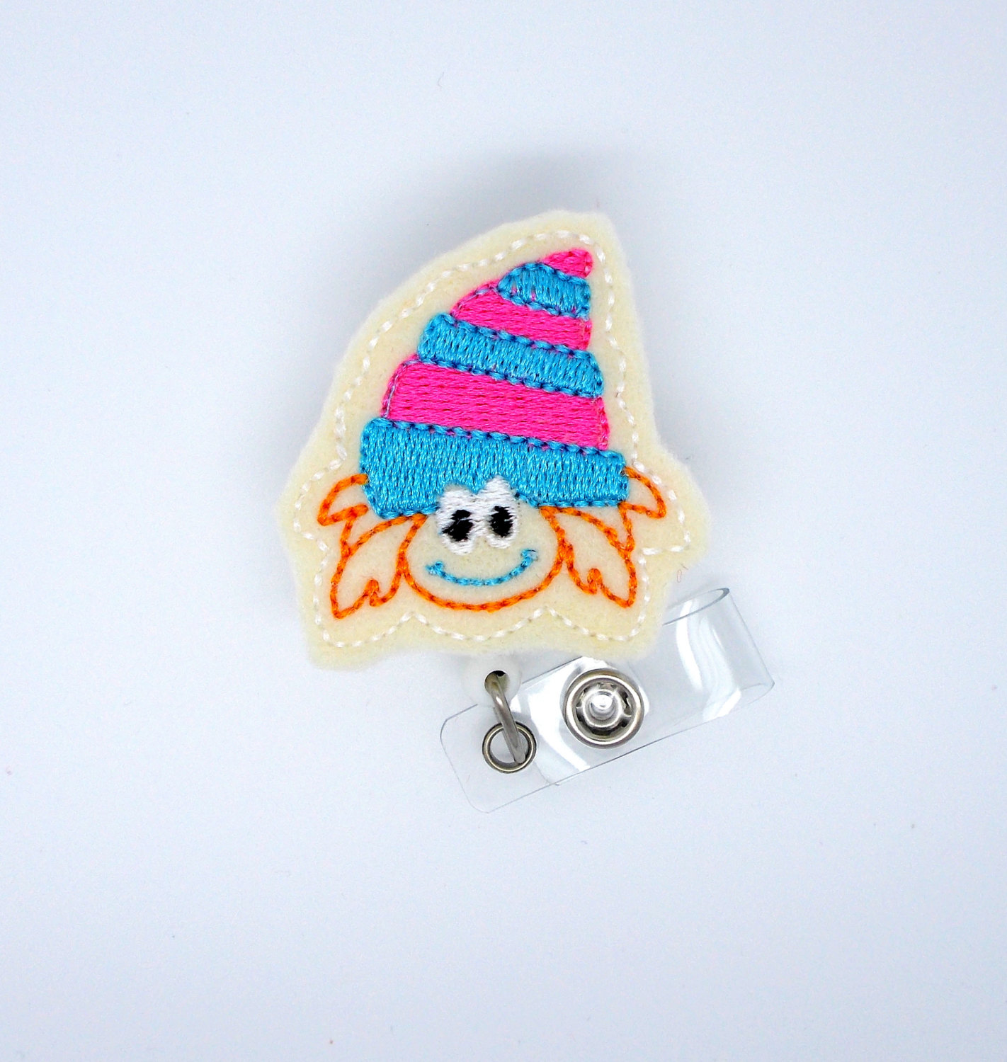 This retractable ID felt badge holder features a colorful crab felt applique, can be accented with a pink and white polka dot bow. Sits on a white badge reel.