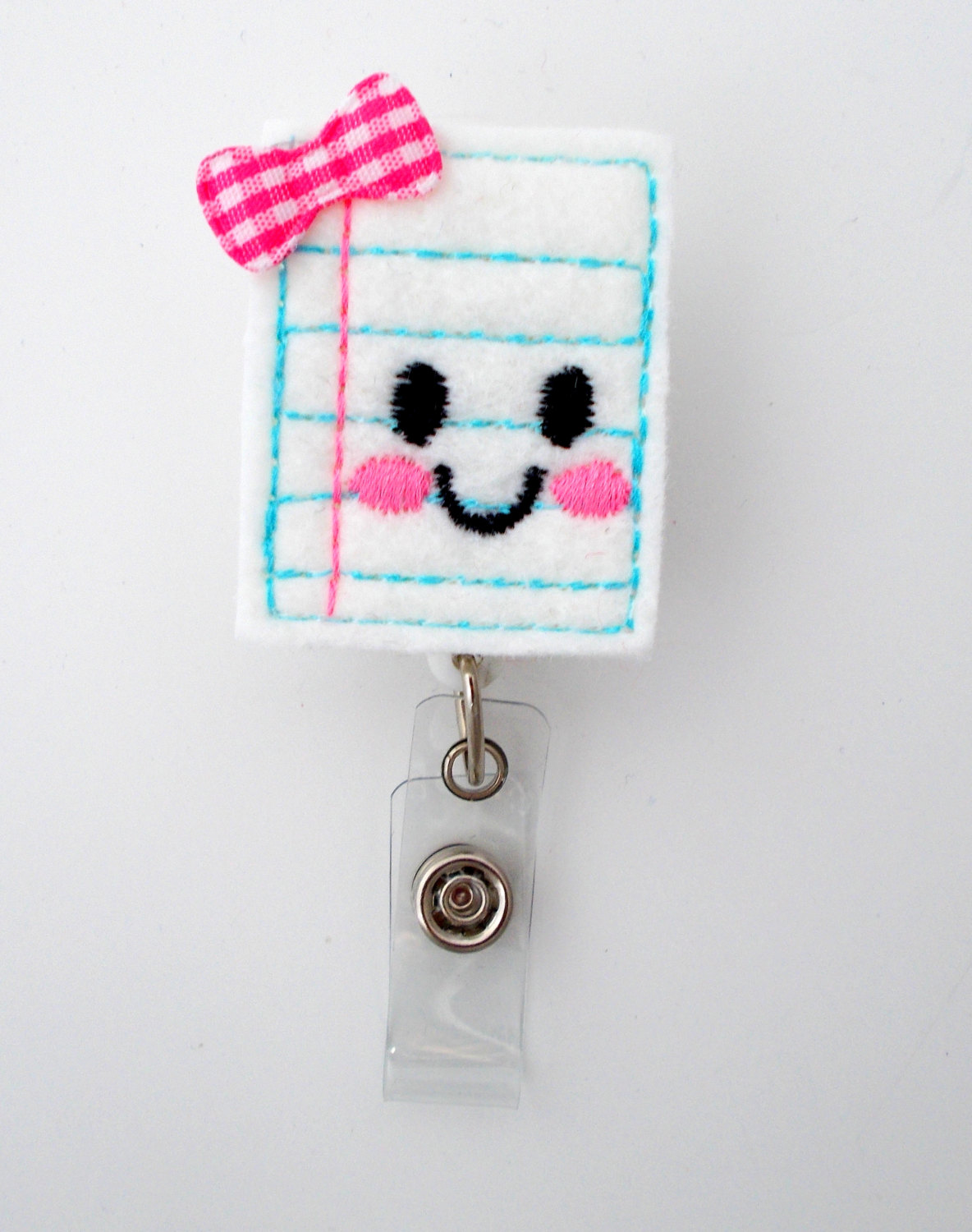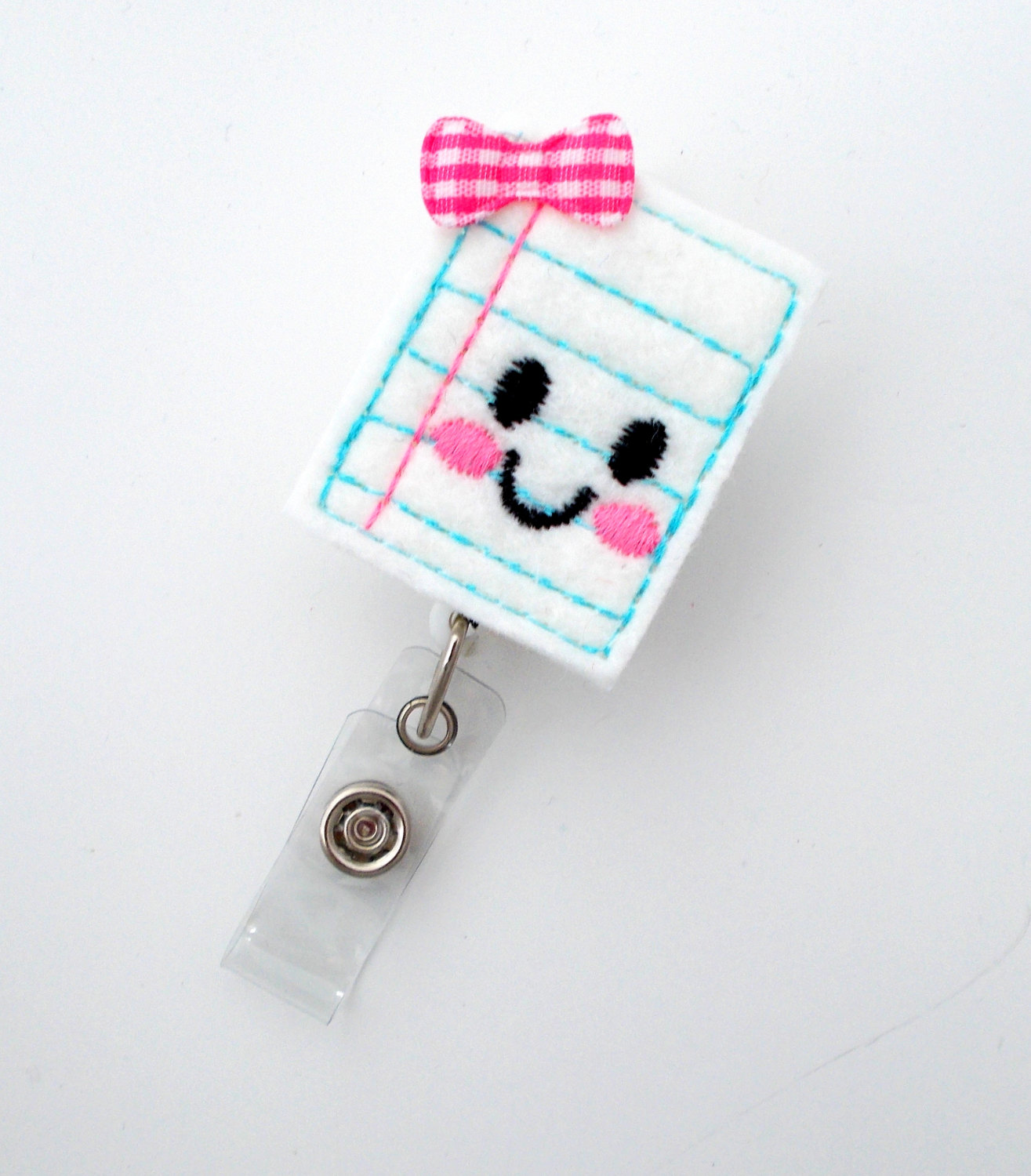 This retractable ID felt badge holder features a smiling notebook paper felt applique. It is embellished with a pink and white gingham checked bow. Sits on a hard plastic, white badge reel.