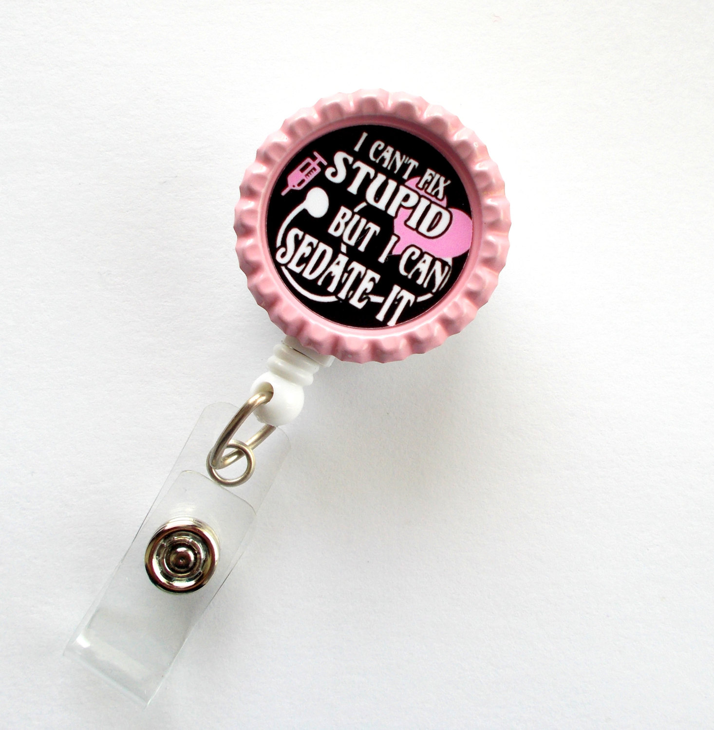 This badge reel features the phrase I Can't Fix Stupid But I Can Sedate It which is surrounded by a stethoscope and syringe. Graphic has pink accents and is glued to a pink bottle cap. Bottle cap is glued to a white, hard plastic badge reel.