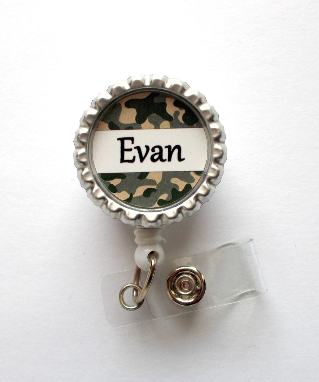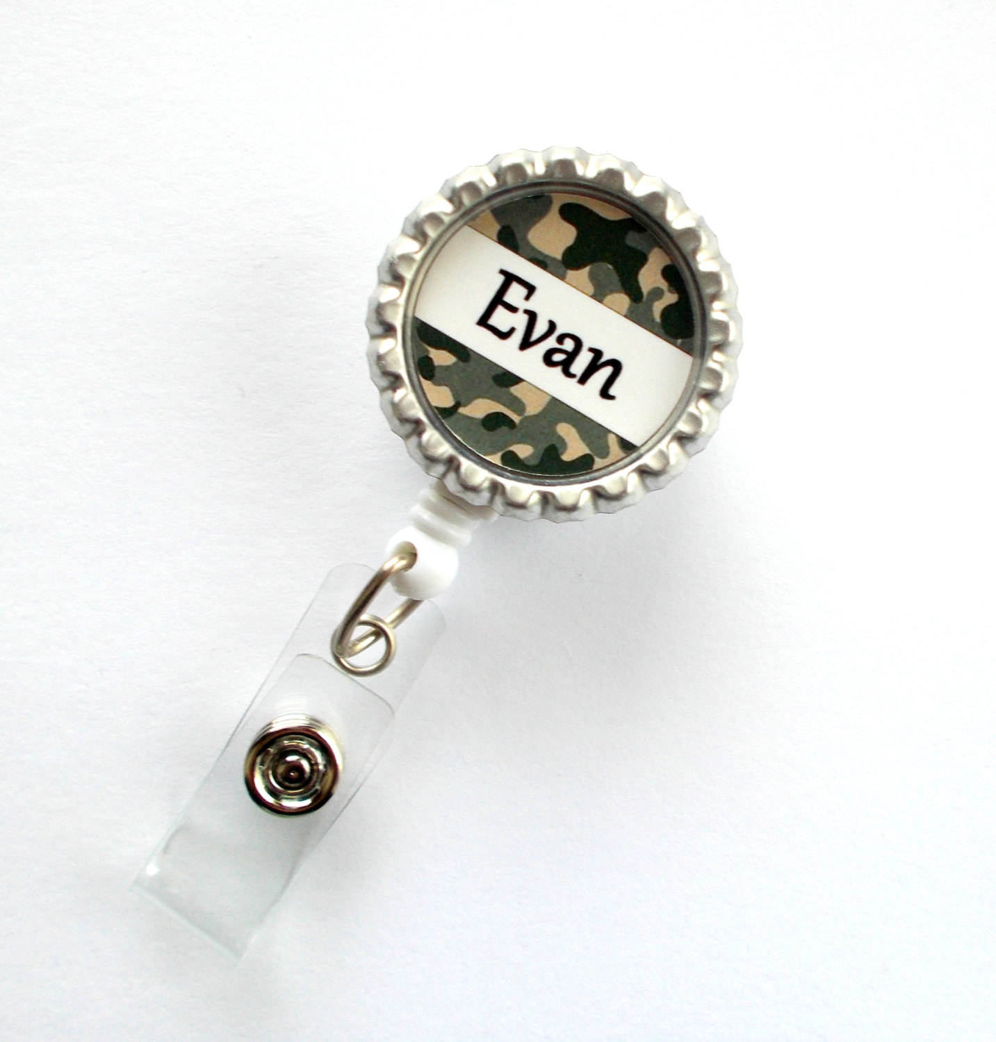 Personalized Camouflage Green Bottle Cap Badge Reel - Male Badge Reel - Teacher Badge - Dr Badge Reel - Camo Badge Reel - Male Nurse Badge