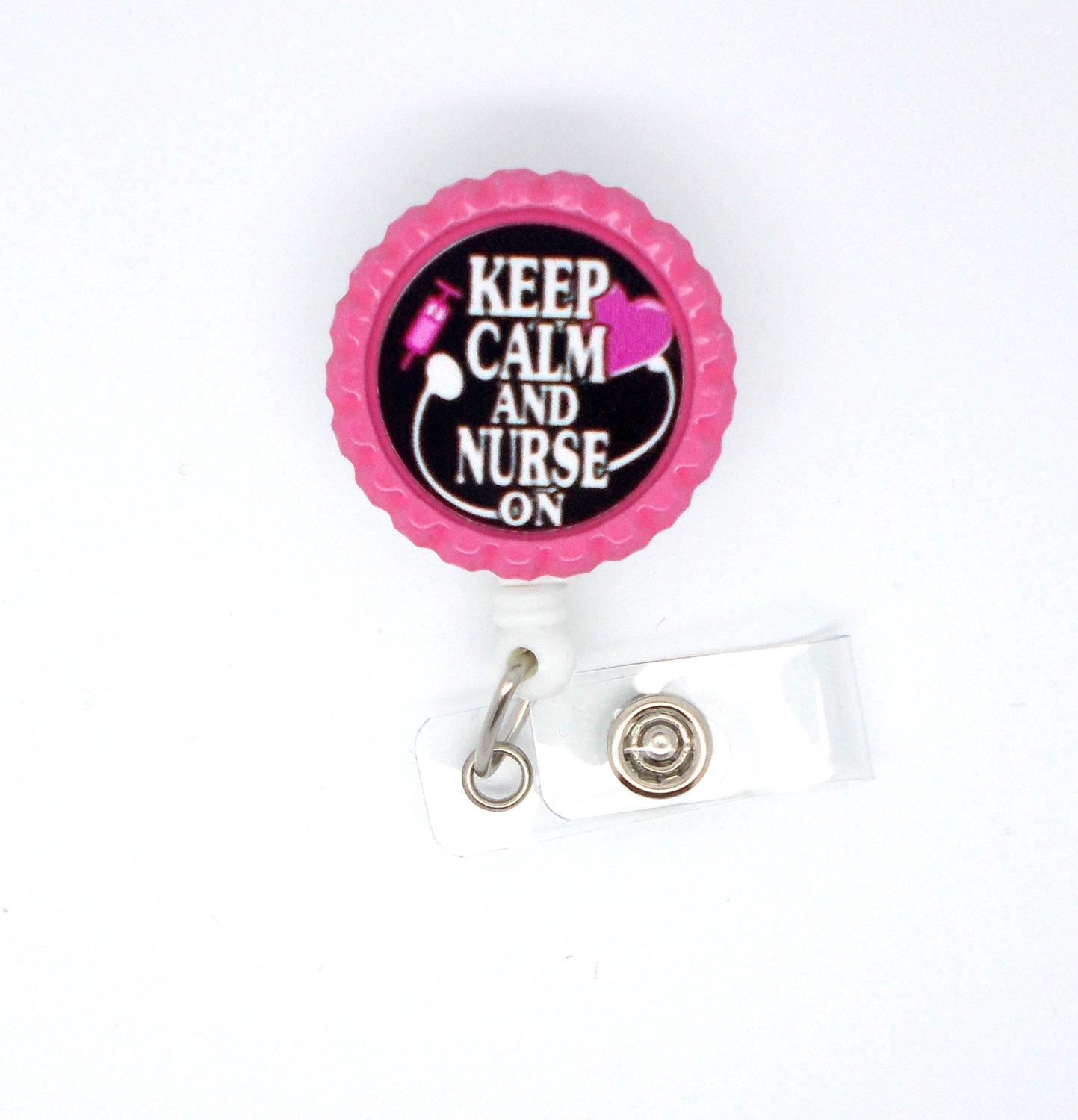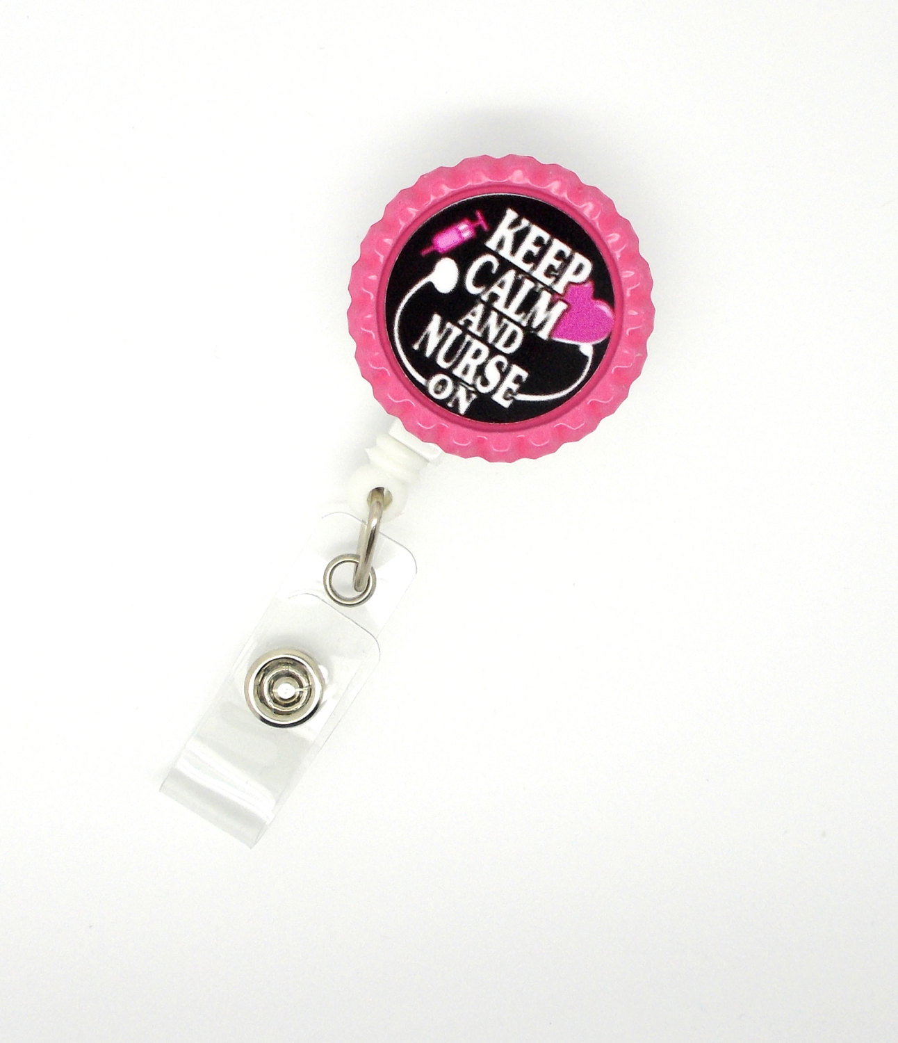 This badge reel features the phrase Keep Calm and Nurse On which is surrounded by a stethoscope and syringe. Graphic has pink accents and is glued to a pink bottle cap. Bottle cap is glued to a white, hard plastic badge reel.
