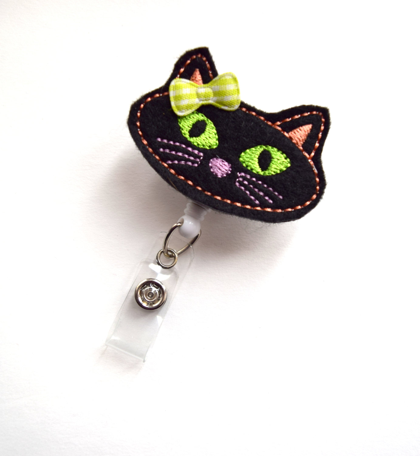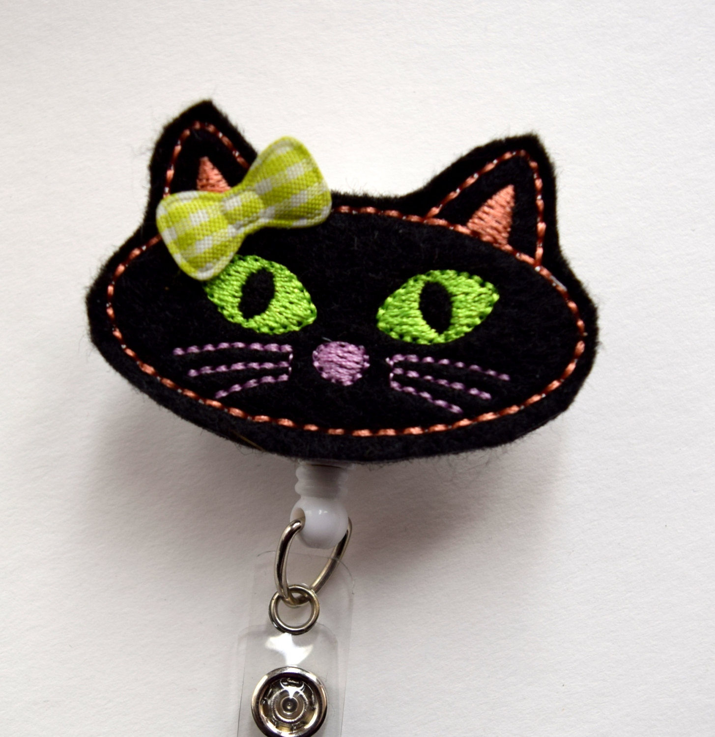 This retractable ID felt badge holder features a black cat felt applique and can be accented with a green and white gingham checked bow. Felt applique sits on a white, hard plastic badge reel.