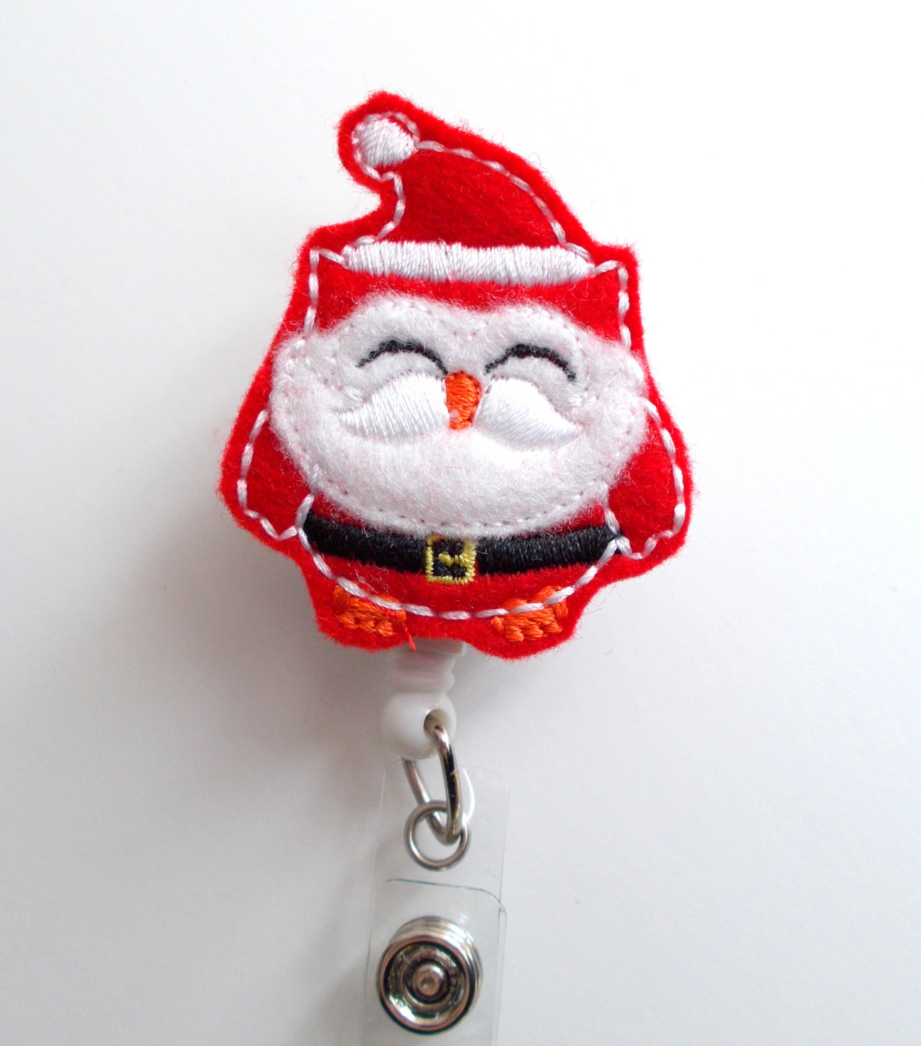 This retractable ID felt badge holder features a Santa Claus owl felt applique. Perfect for the holiday season.
