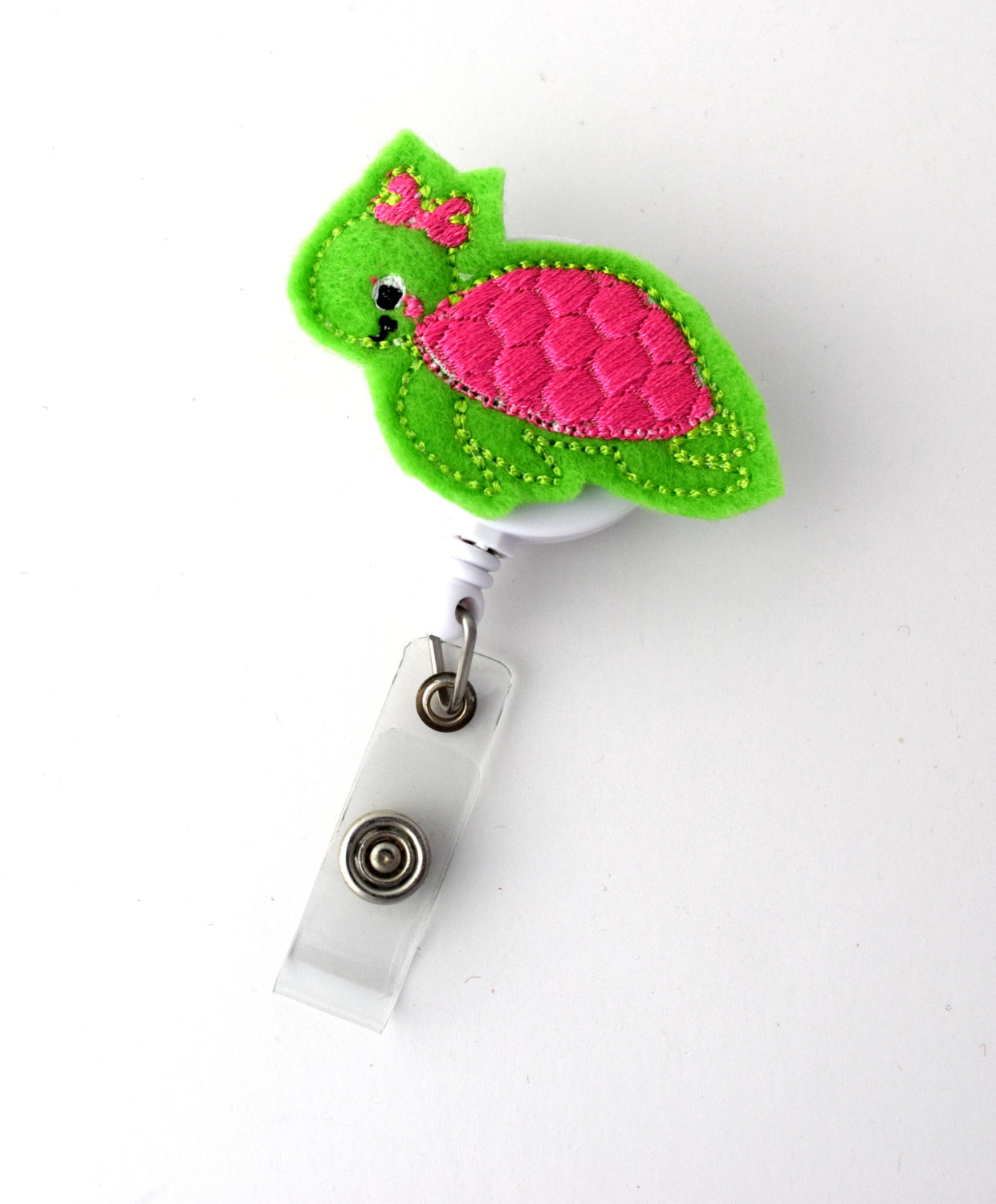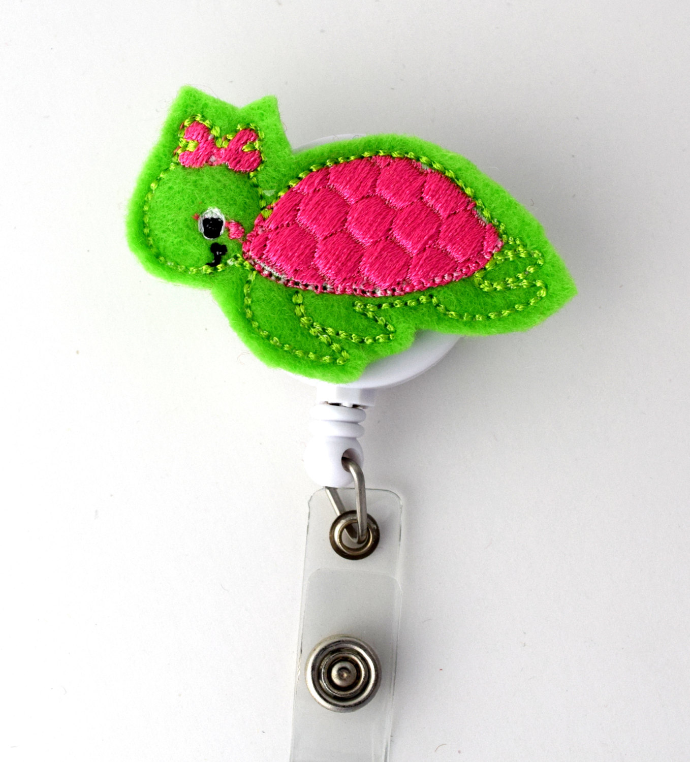 This retractable ID felt badge holder features a green and pink turtle felt applique. Sits on a sturdy plastic white badge reel.
