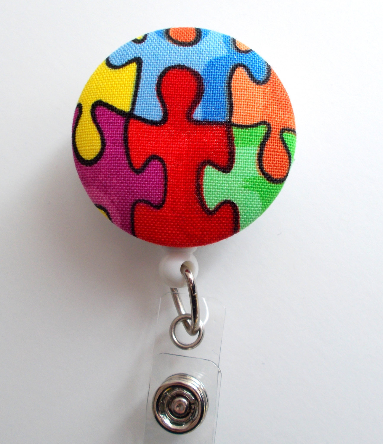 This ID badge holder features the Autism Awareness fabric pattern made out of a fabric covered button. Picture will vary somewhat from actual picture as this particular fabric features many different colors and shapes. Button is glued to a white, hard plastic badge reel.