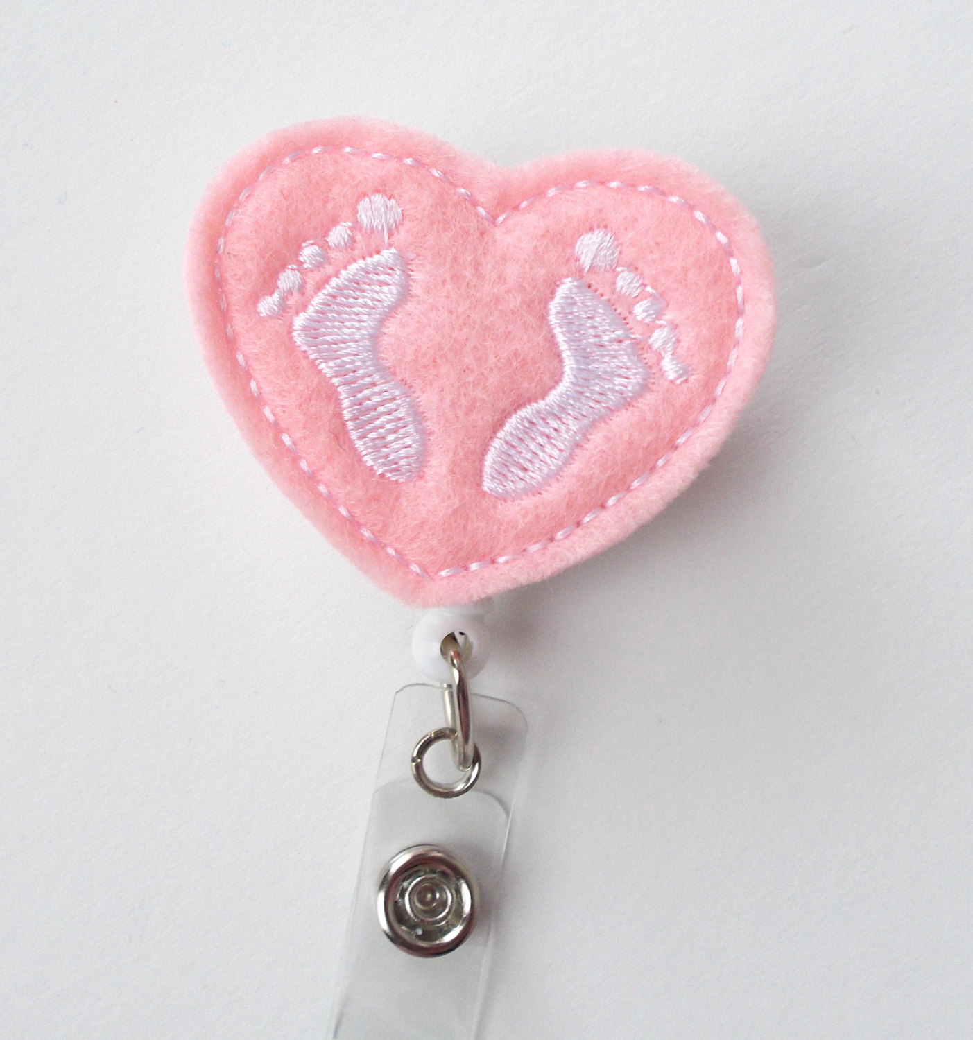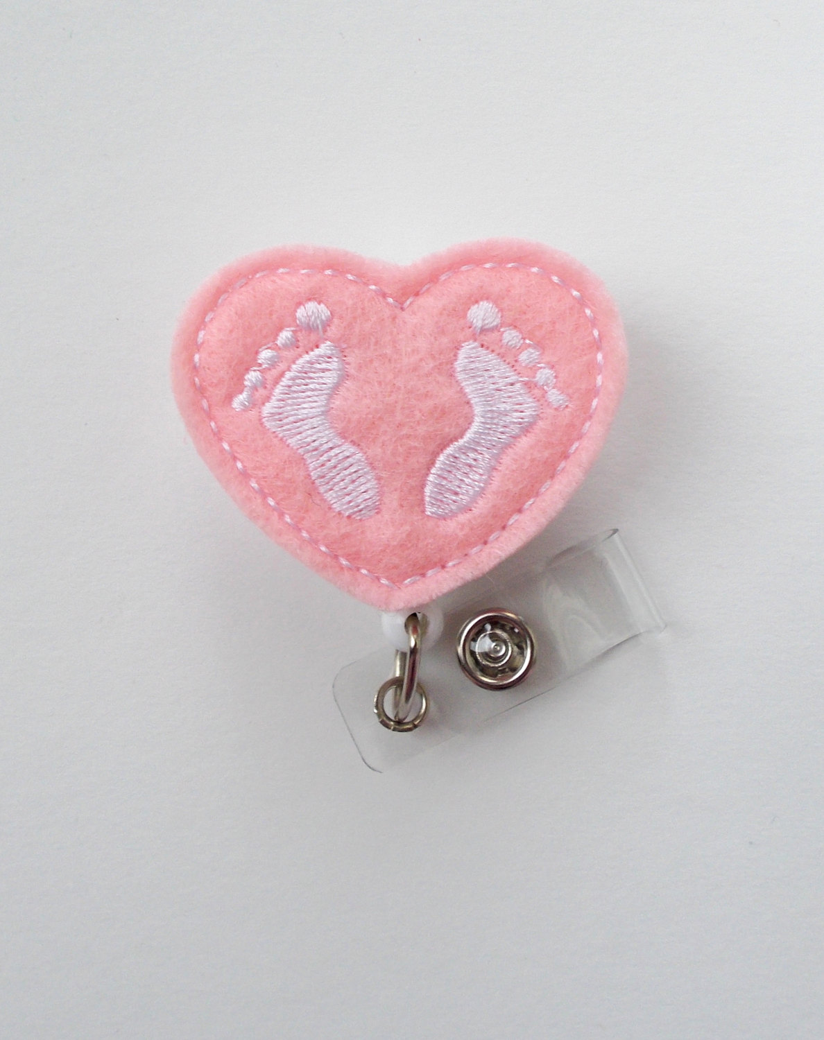 This retractable ID felt badge holder features a pink felt applique featuring baby feet (white) in the middle of the heart.