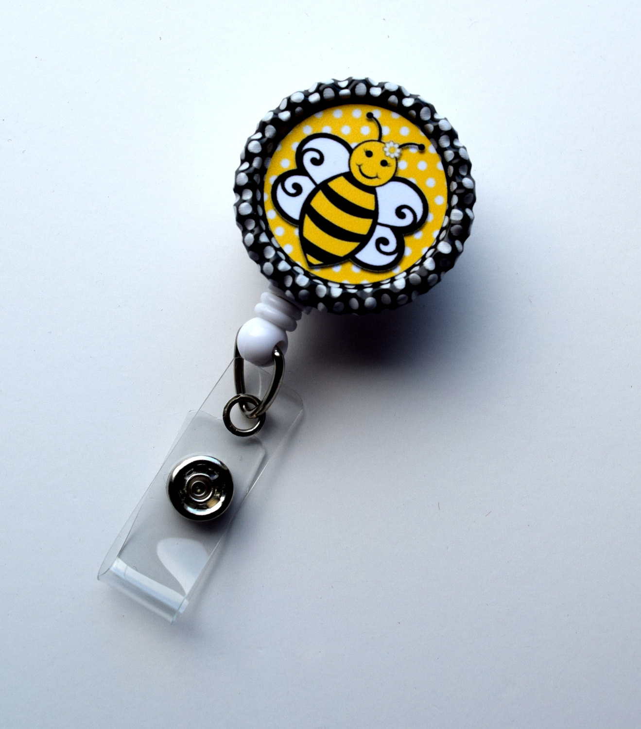This badge reel features a yellow bee on a yellow and white polka dot background. Sits on a black and white polka dot bottle cap. Graphic is sealed with an epoxy sealant. Sits on a sturdy white plastic badge reel.