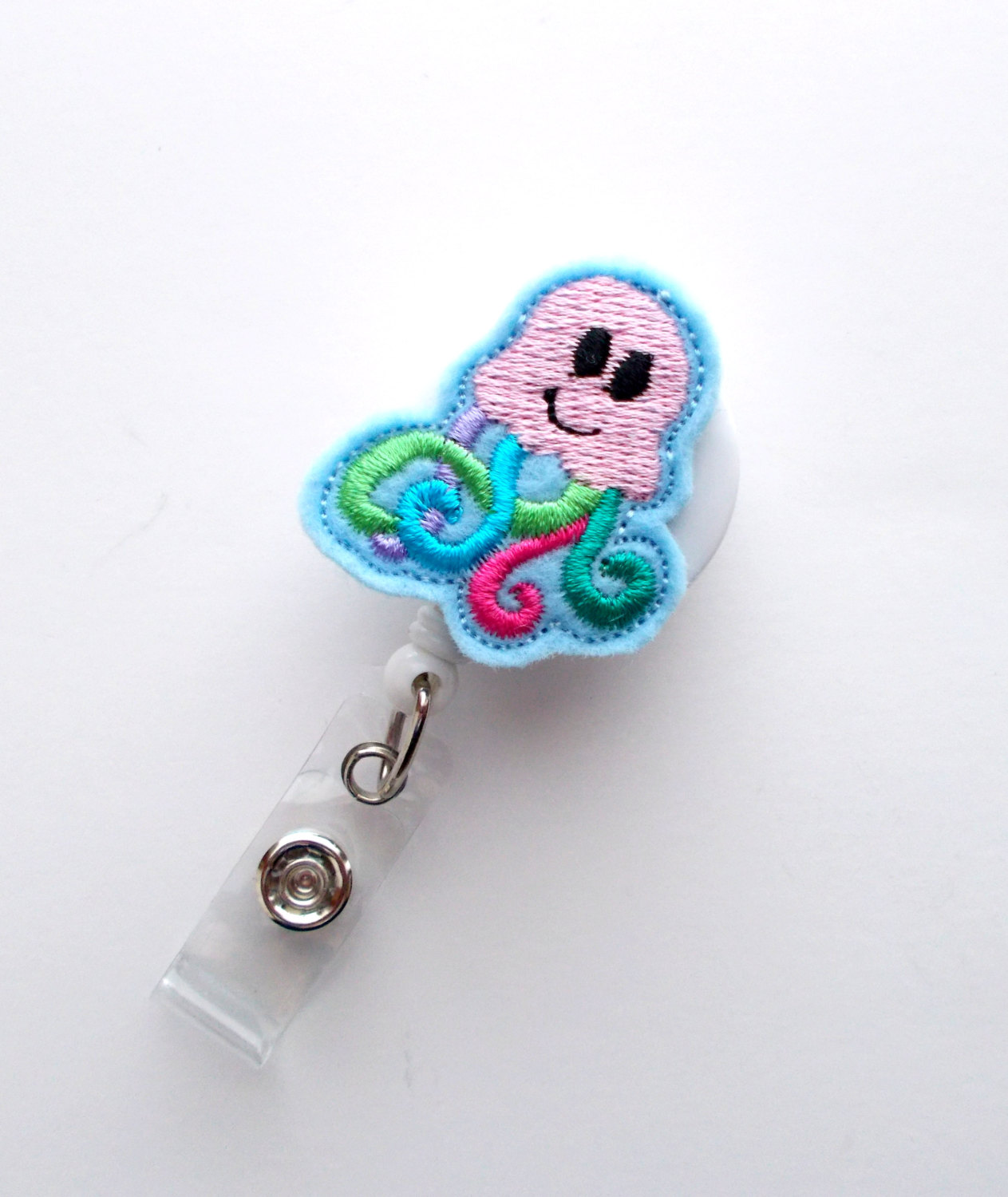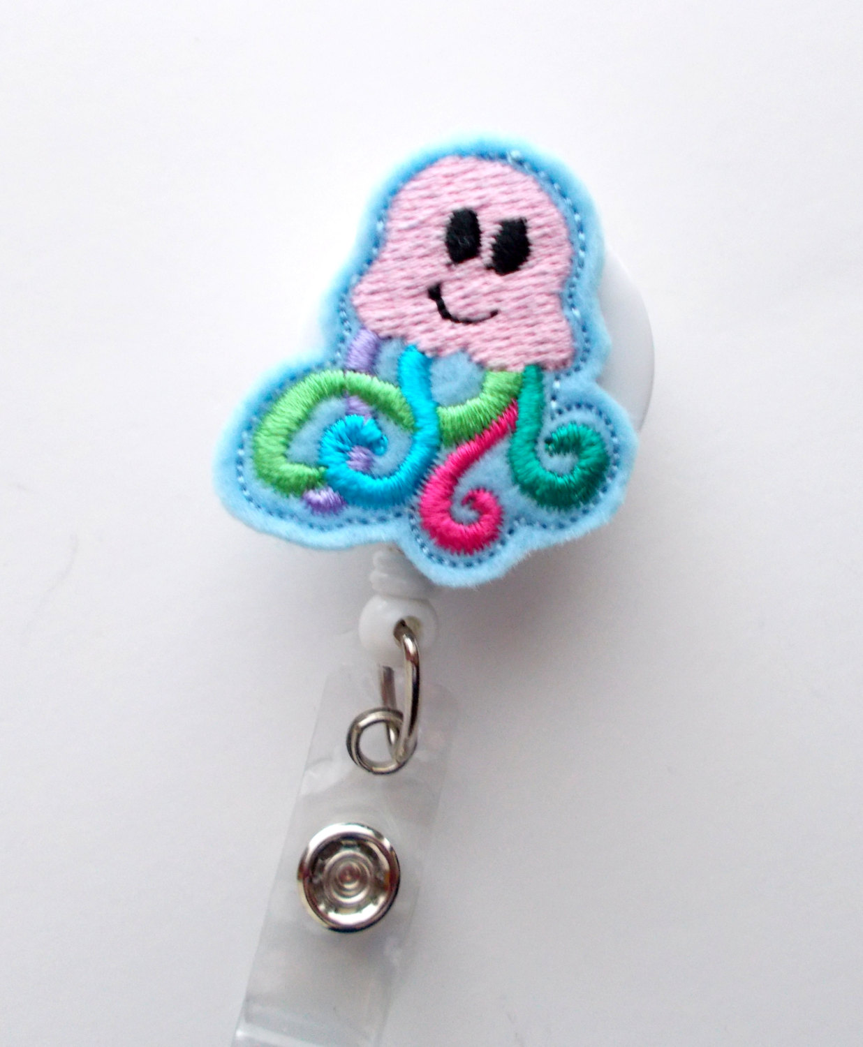 This retractable ID felt badge holder features a sweet jellyfish felt applique.