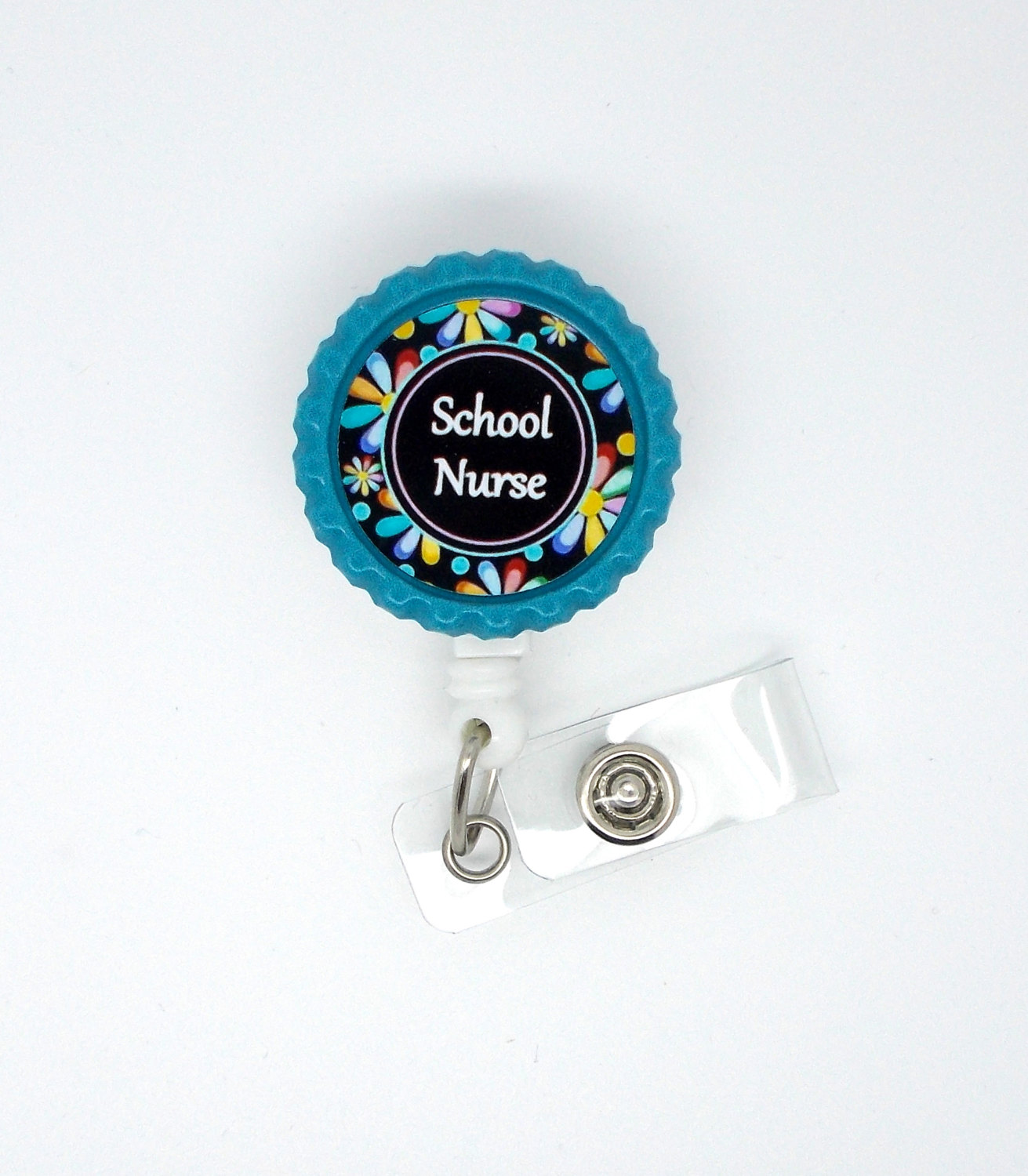 This graphic features a colorful circle of flowers with School Nurse imprinted on the graphic. Name will be be printed in white. Graphic is glued to a blue bottle cap. Bottle cap is glued to a white, hard plastic badge reel.