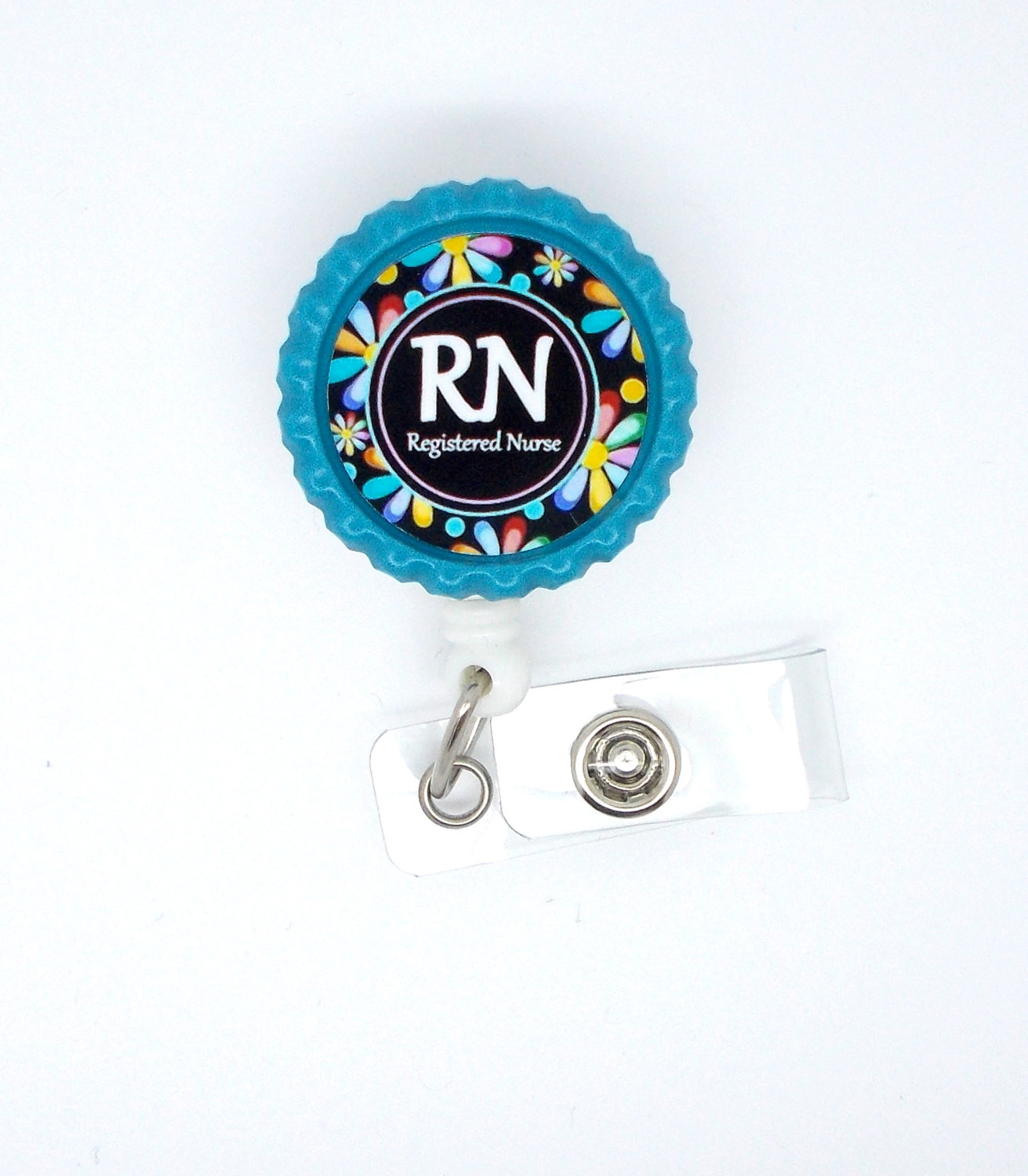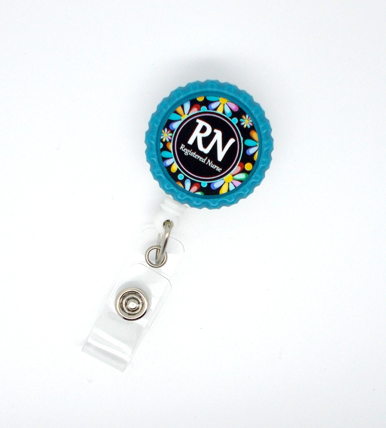 This graphic features a the initials RN which is surrounded by a colorful circle of flowers. Name will be be printed in white. Graphic is glued to a blue bottle cap. Bottle cap is glued to a white, hard plastic badge reel.