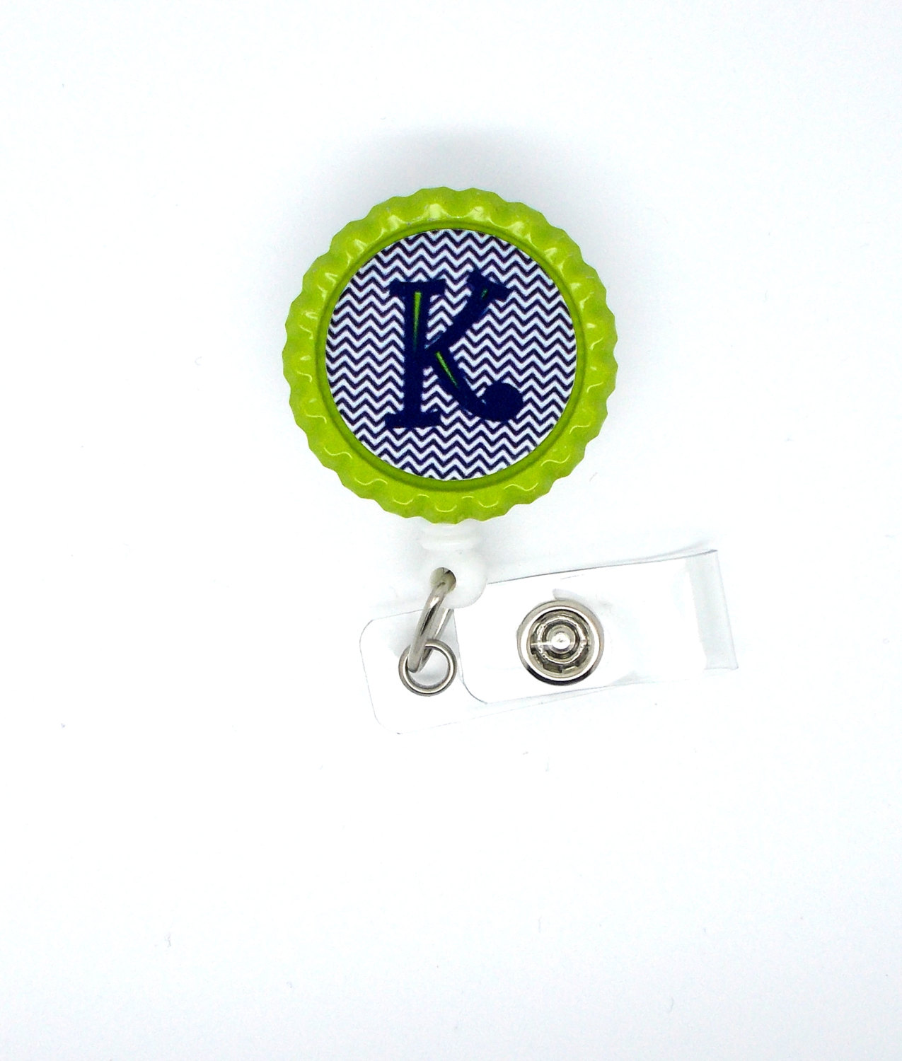 This is a personalized badge reel featuring a navy blue chevron background with a green initial of your choice. Image is sealed with an epoxy sealant. It is not waterproof. Graphic is glued to a green bottle cap. Bottle cap is glued to a white, hard plastic badge reel.