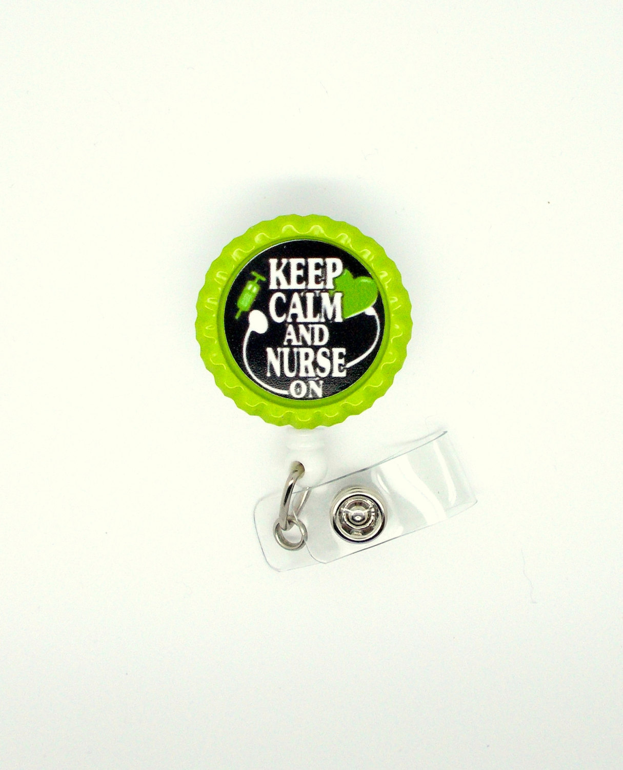 This badge reel features the phrase Keep Calm and Nurse On which is surrounded by a stethoscope and syringe. Graphic has green accents and is glued to a green bottle cap. Bottle cap is glued to a white, hard plastic badge reel.