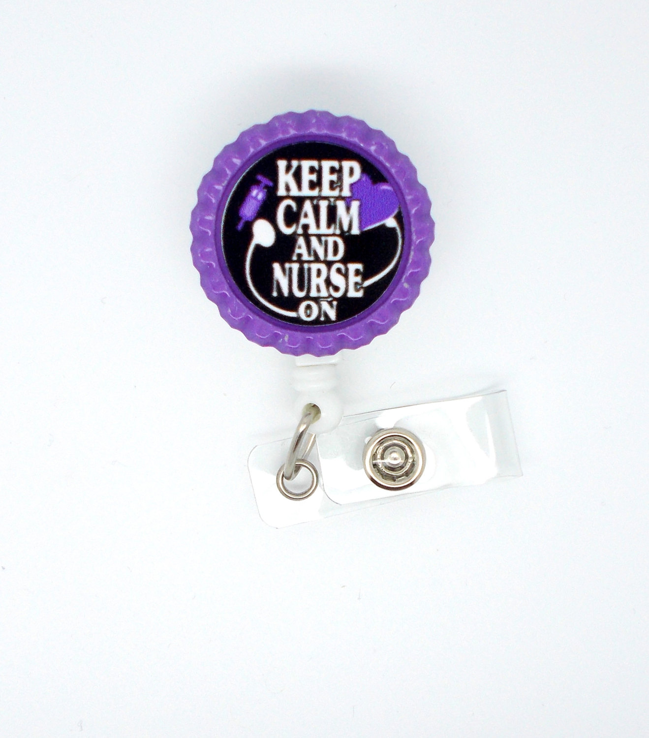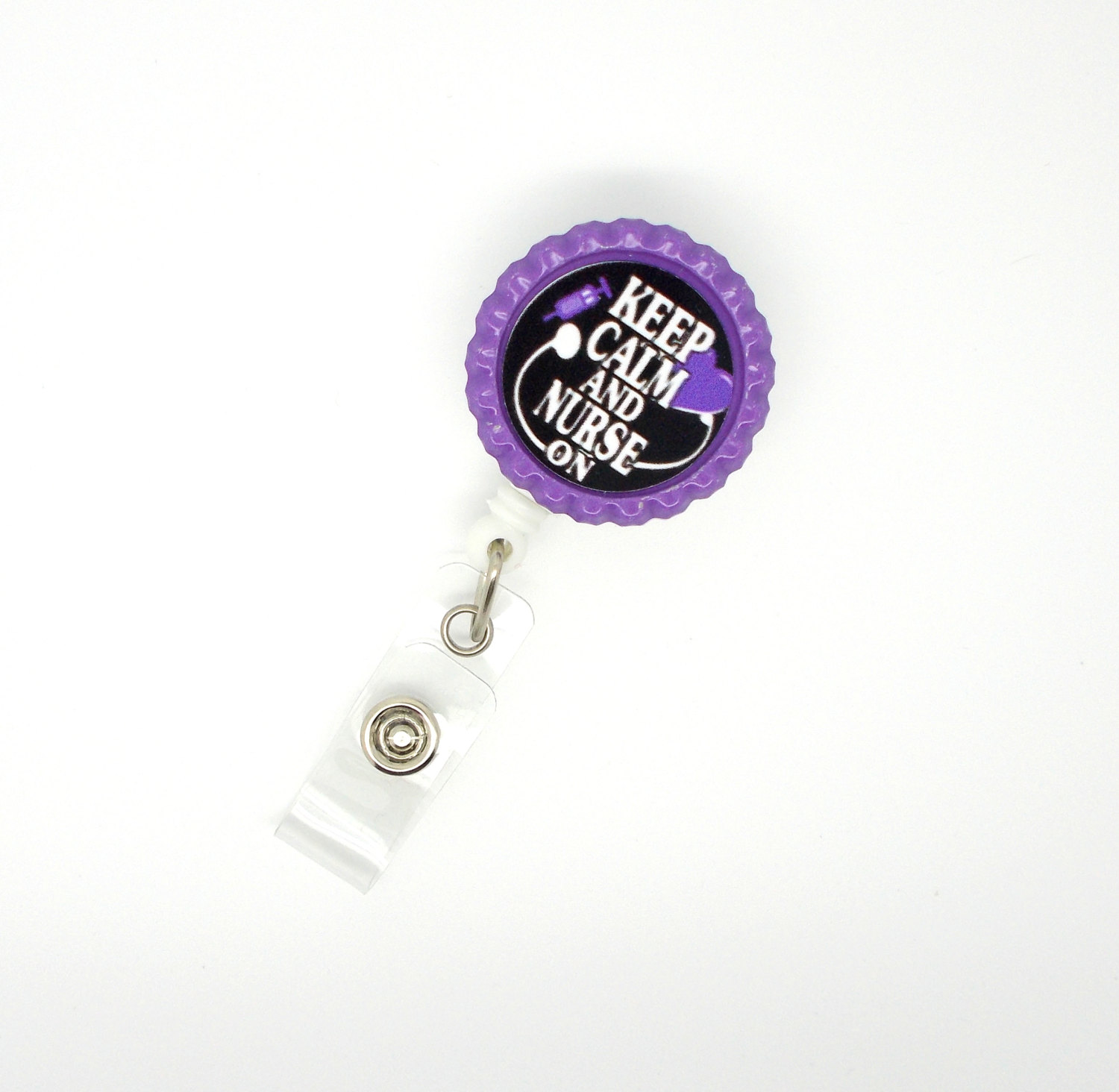 This badge reel features the phrase Keep Calm and Nurse On which is surrounded by a stethoscope and syringe. Graphic has purple accents and is glued to a purple bottle cap. Bottle cap is glued to a white, hard plastic badge reel.