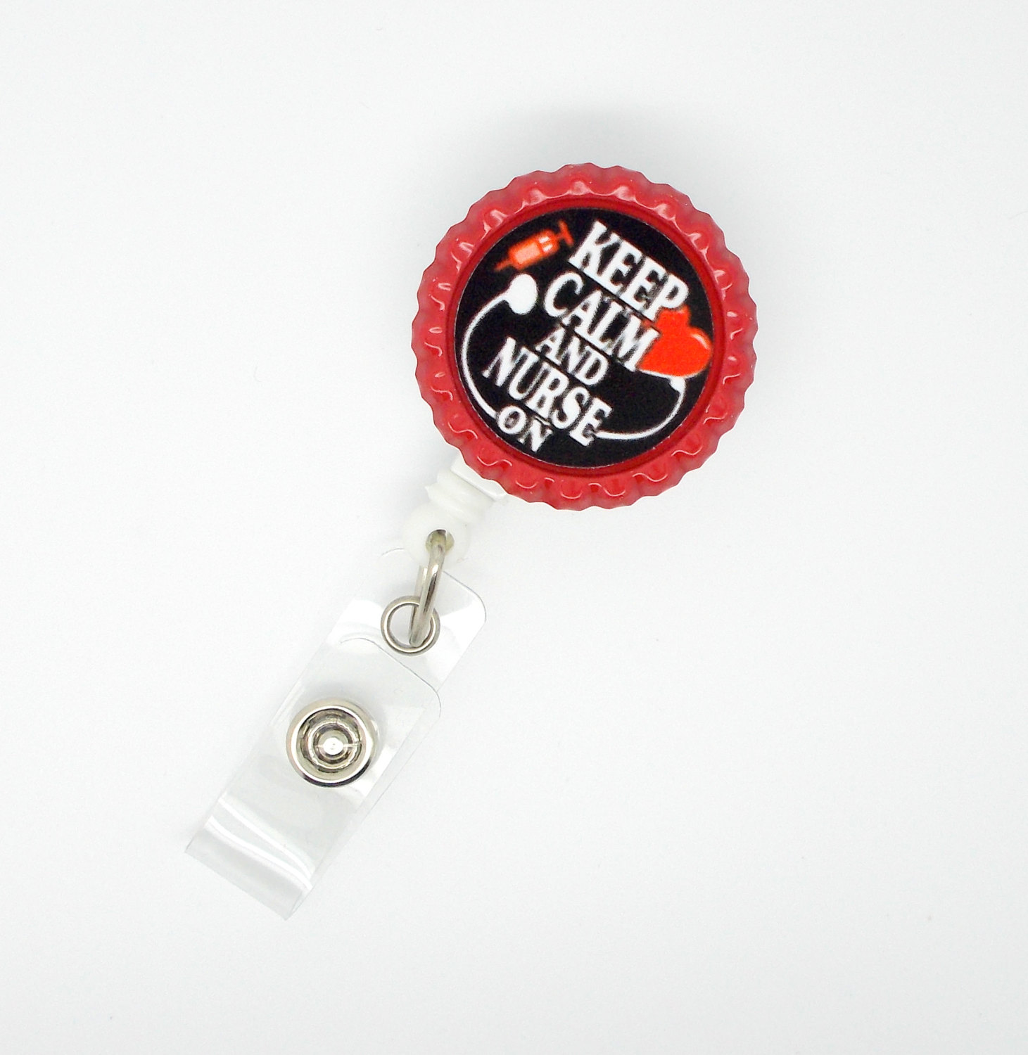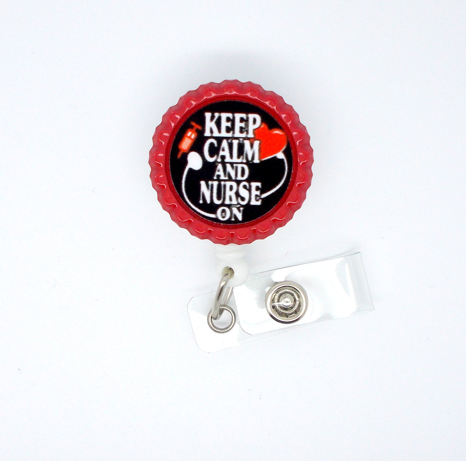 This badge reel features the phrase Keep Calm and Nurse On which is surrounded by a stethoscope and syringe. Graphic has red accents and is glued to a red bottle cap. Bottle cap is glued to a white, hard plastic badge reel.