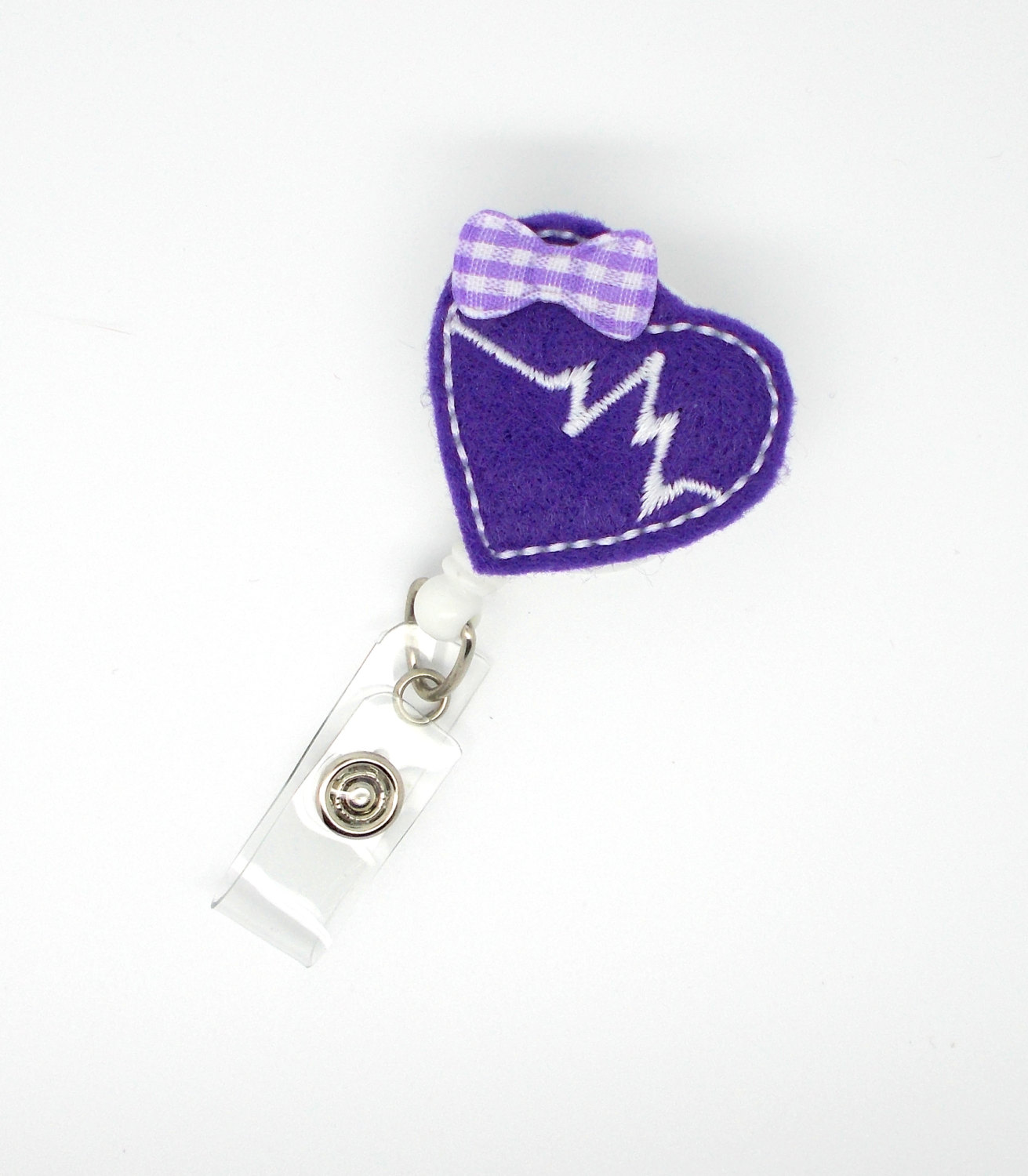This retractable ID felt badge holder features a beating heart purple felt applique. Felt applique can be accented with a purple and white gingham checked bow. Sits on a white, hard plastic badge reel.
