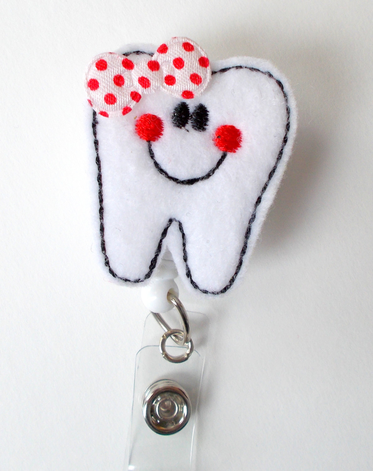 This retractable ID felt badge holder features a white tooth felt applique, accented with a red and white polka dot bow.