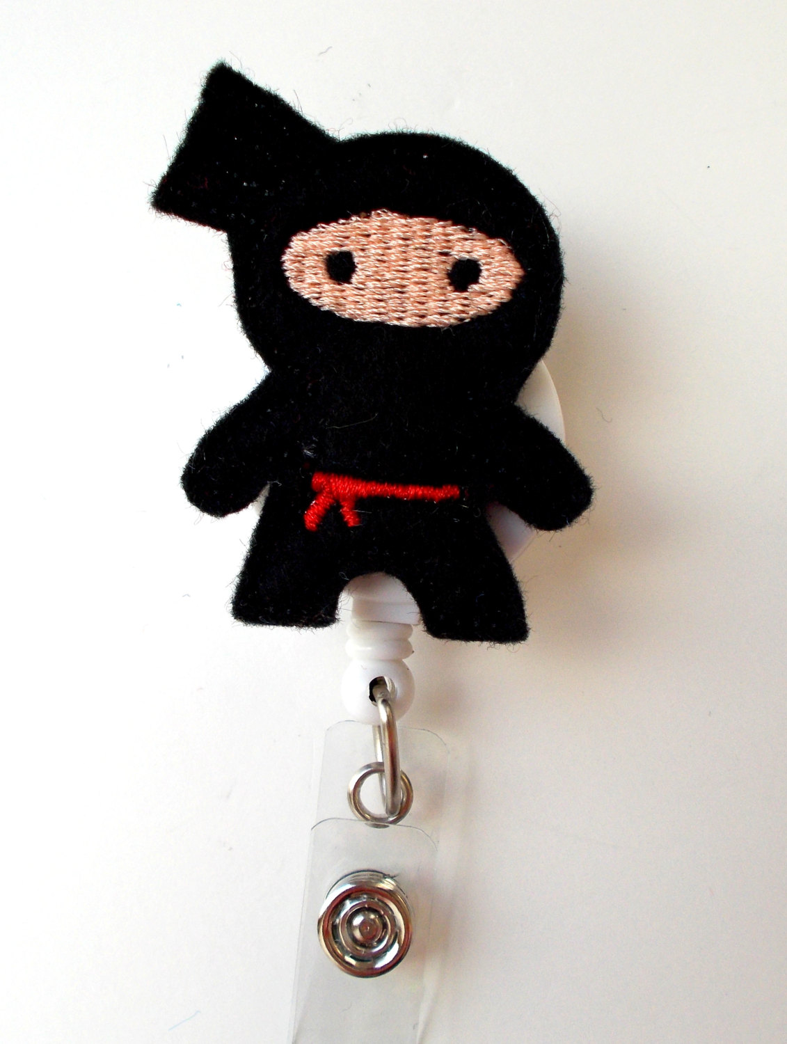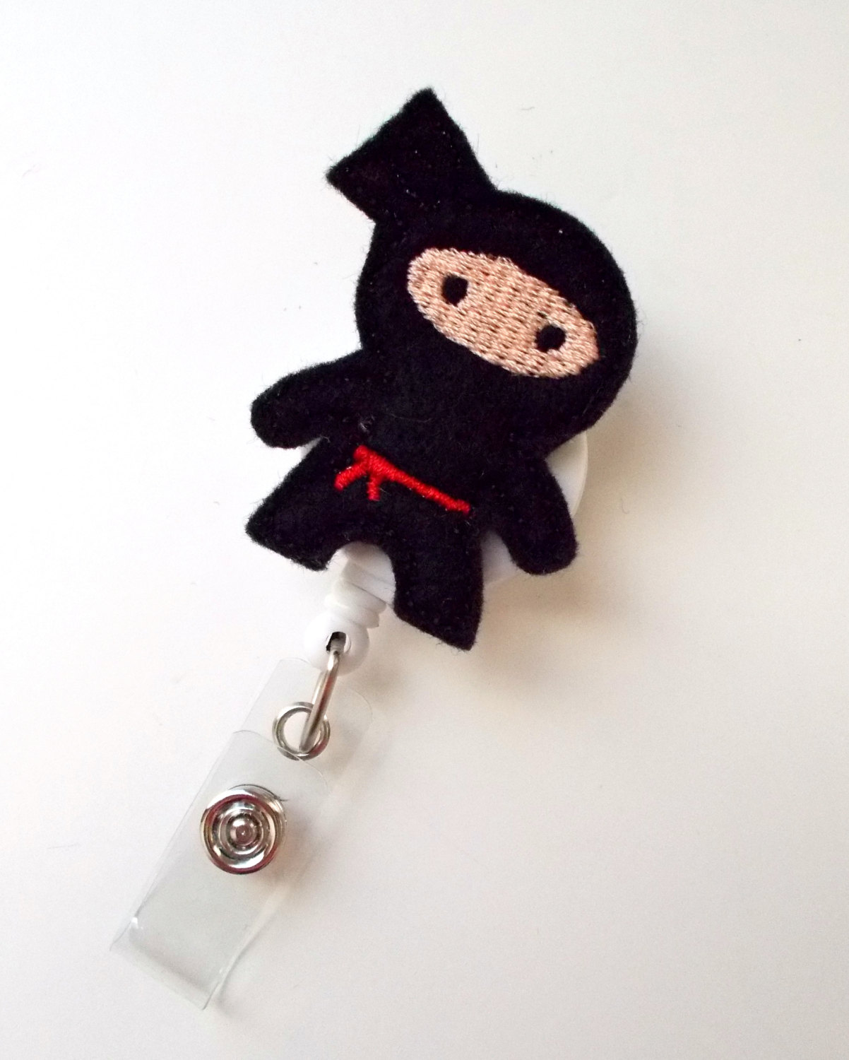 This retractable ID felt badge holder features a black ninja felt applique, accented with a red belt. Sits on a white badge reel.