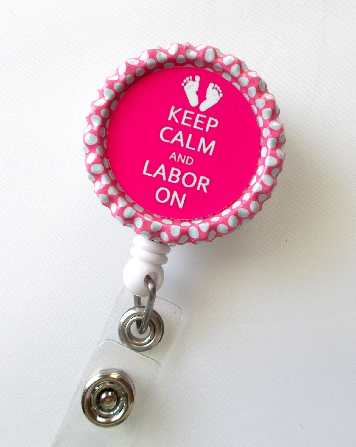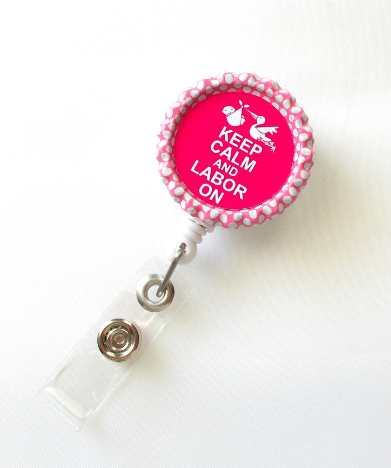 This ID Badge holder features Keep Calm and Labor On in a white font. Accented by a stork delivering a baby above the wording. Pink graphic sits on a pink and white polka dot bottle cap. Super cute and sure to brighten your day!