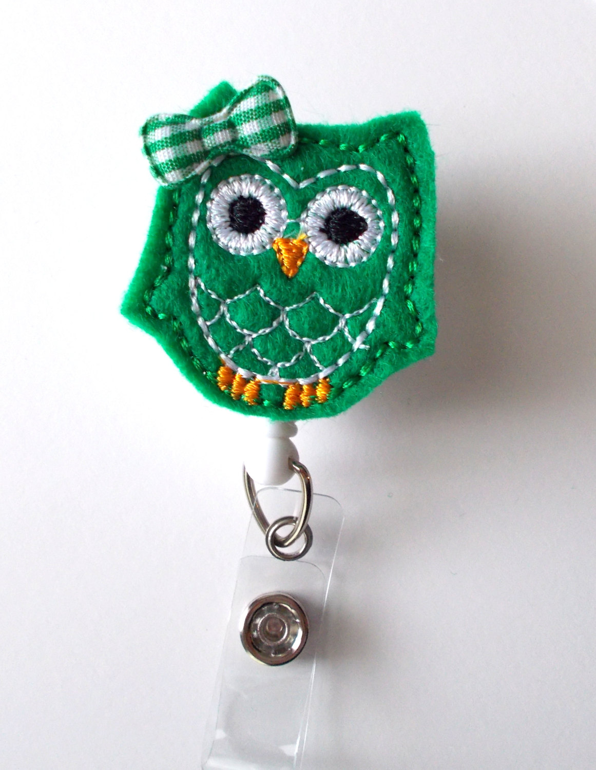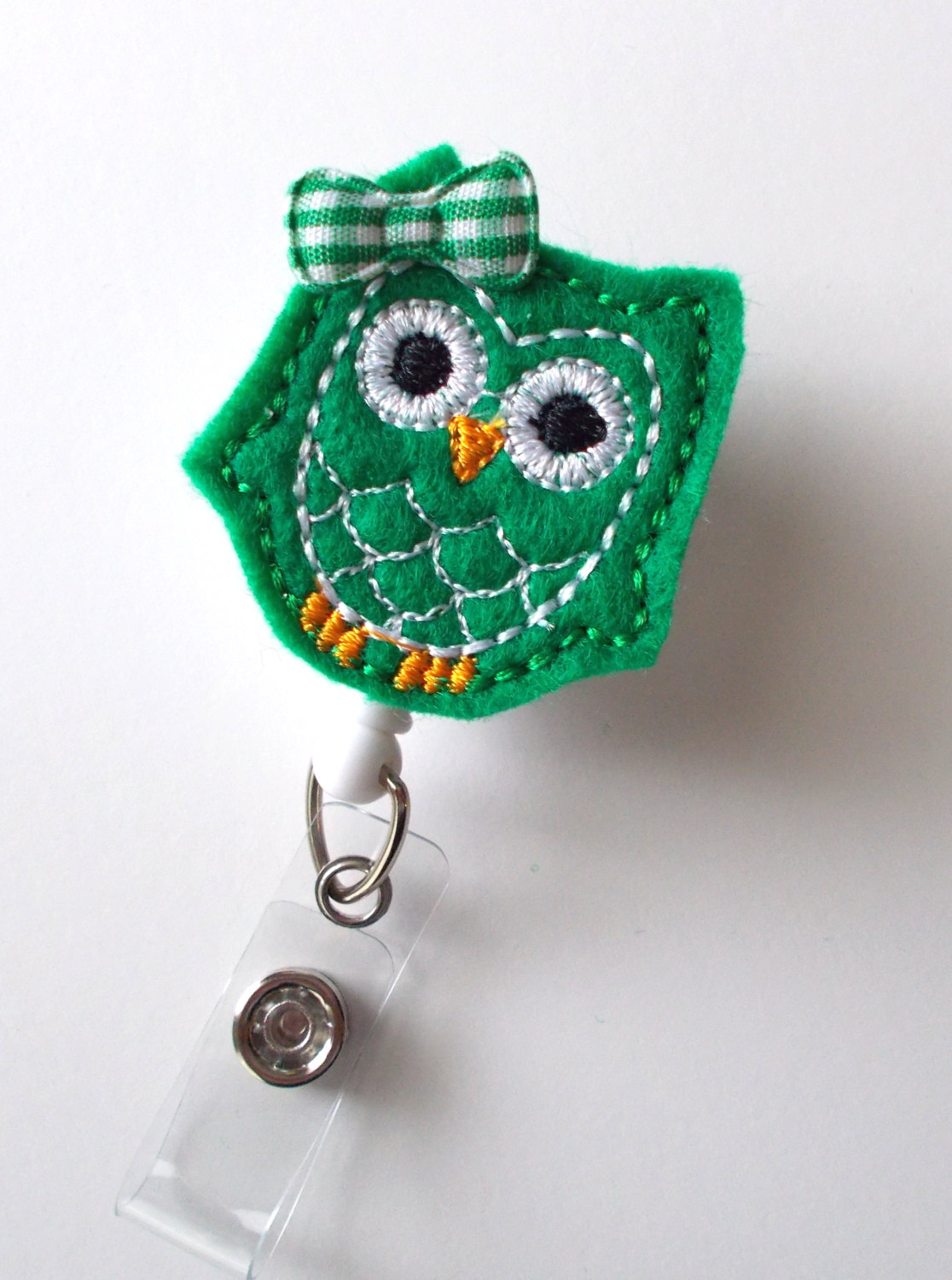 This retractable ID felt badge holder features a kelly green owl felt applique. Accented with a green and white gingham checked bow. Sits on a sturdy white plastic badge reel.