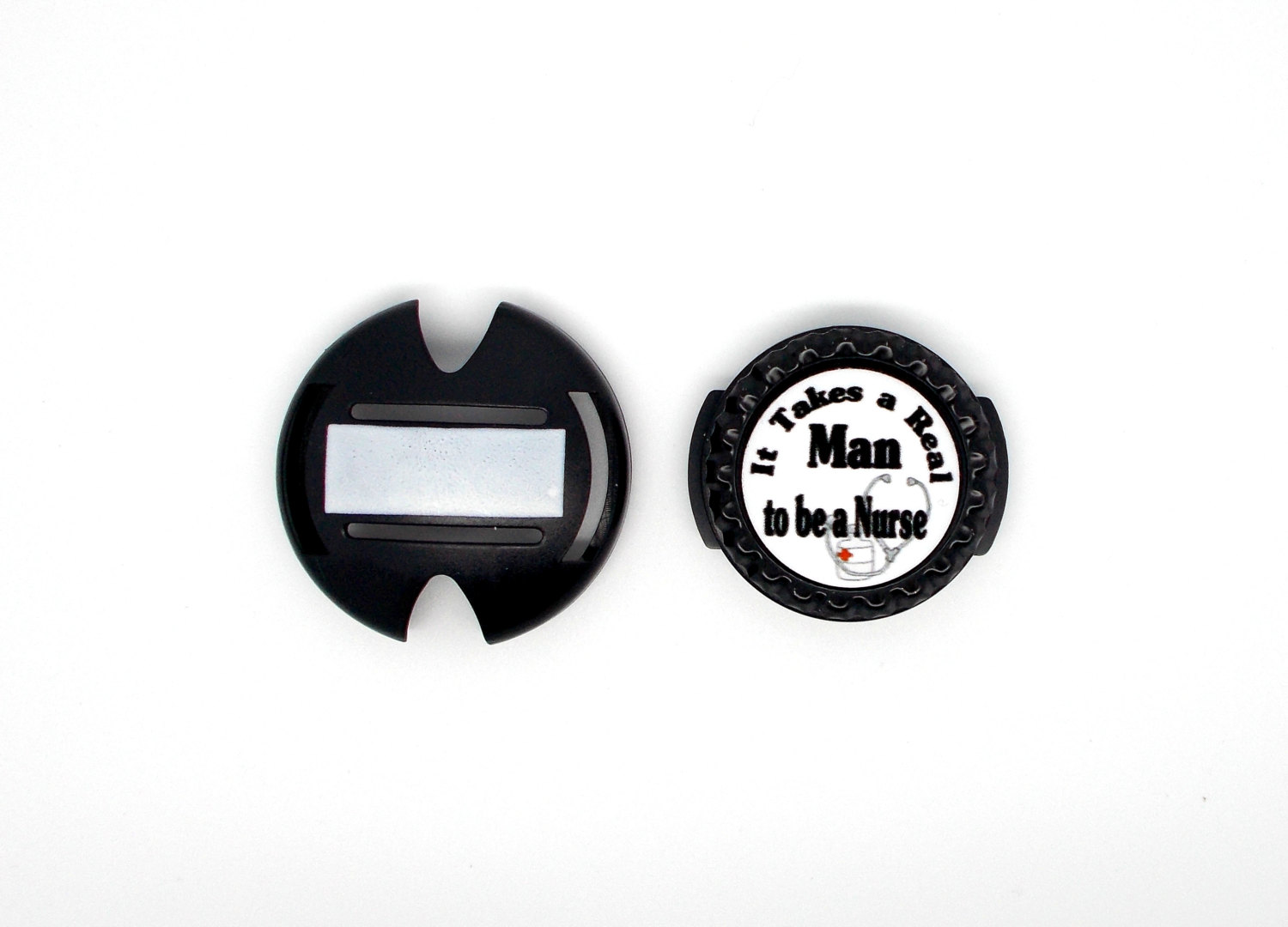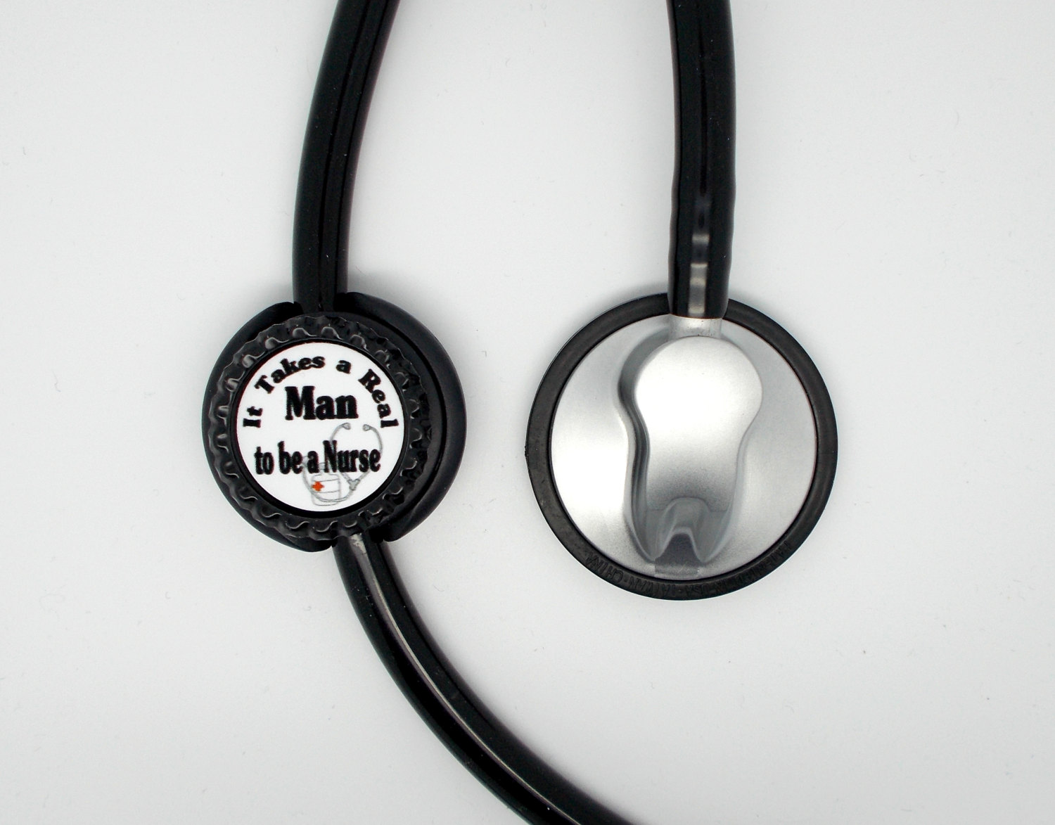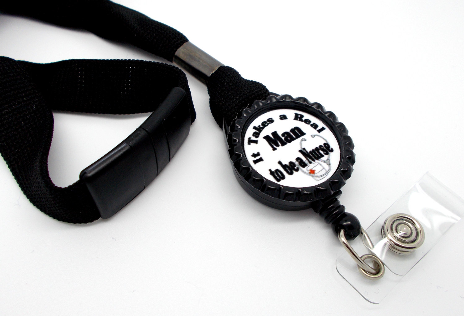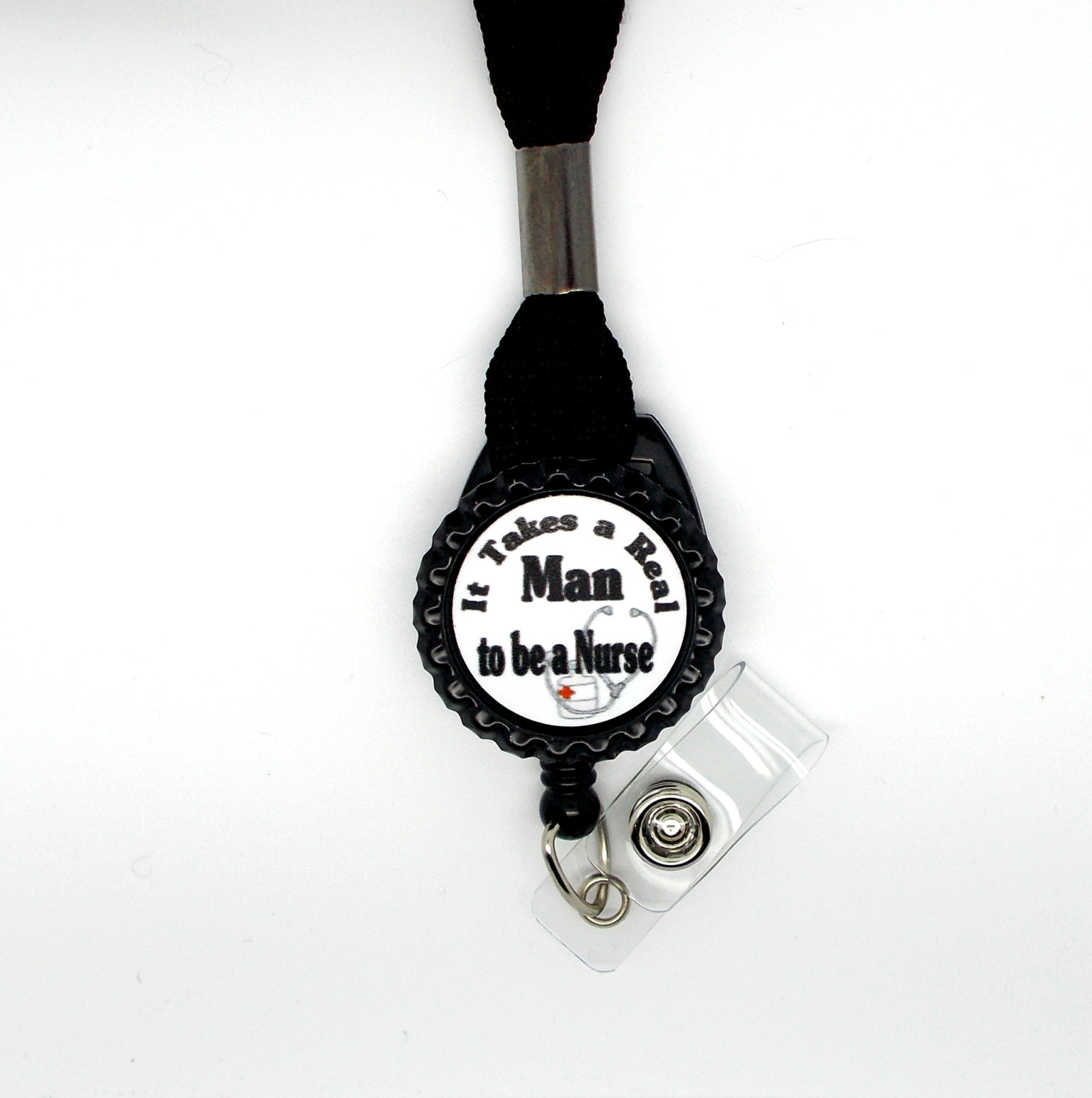 Your choice of a black lanyard or a stethoscope ID tag. This item features It Takes a Real Man to Be a Nurse in black and white. Graphic is sealed with an epoxy sealant and is glued to a black bottle cap. Bottle cap will be glued to your choice of a black lanyard or a stethoscope ID tag.