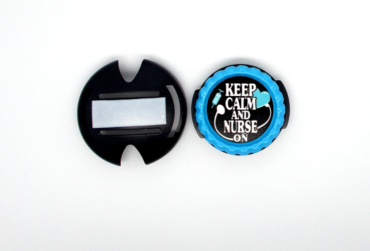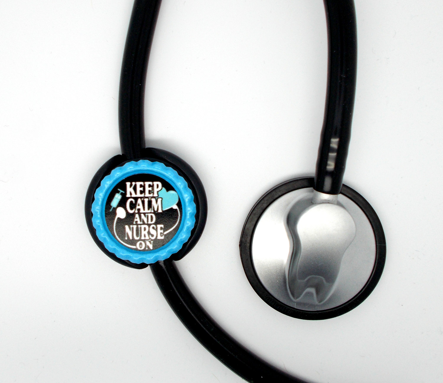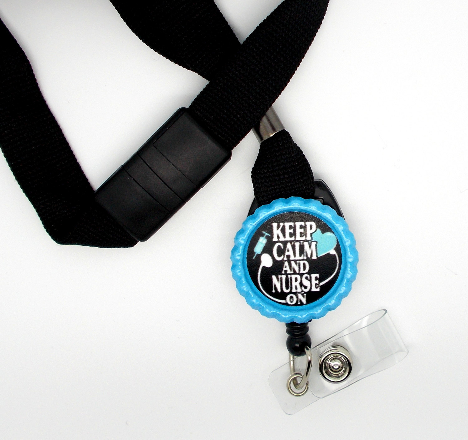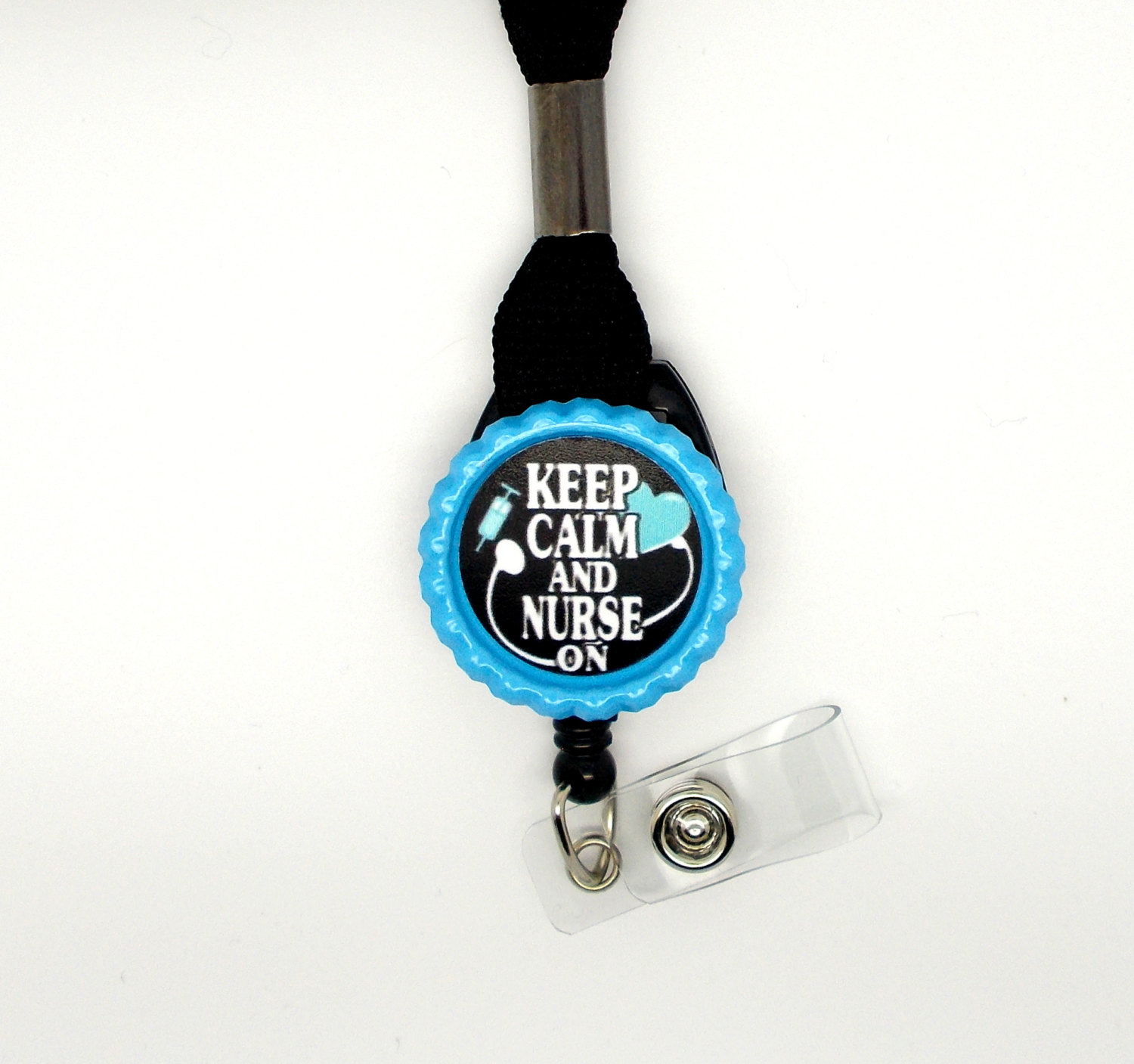 Your choice of a black lanyard or a stethoscope ID tag. This item features Keep Calm and Nurse On in blue. Graphic is sealed with an epoxy sealant and is glued to a blue bottle cap. Bottle cap will be glued to your choice of a black lanyard or a stethoscope ID tag.