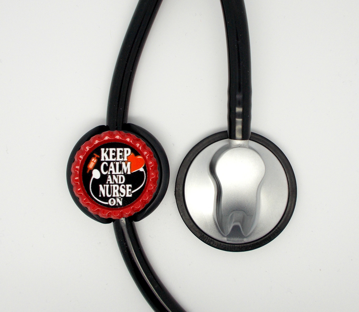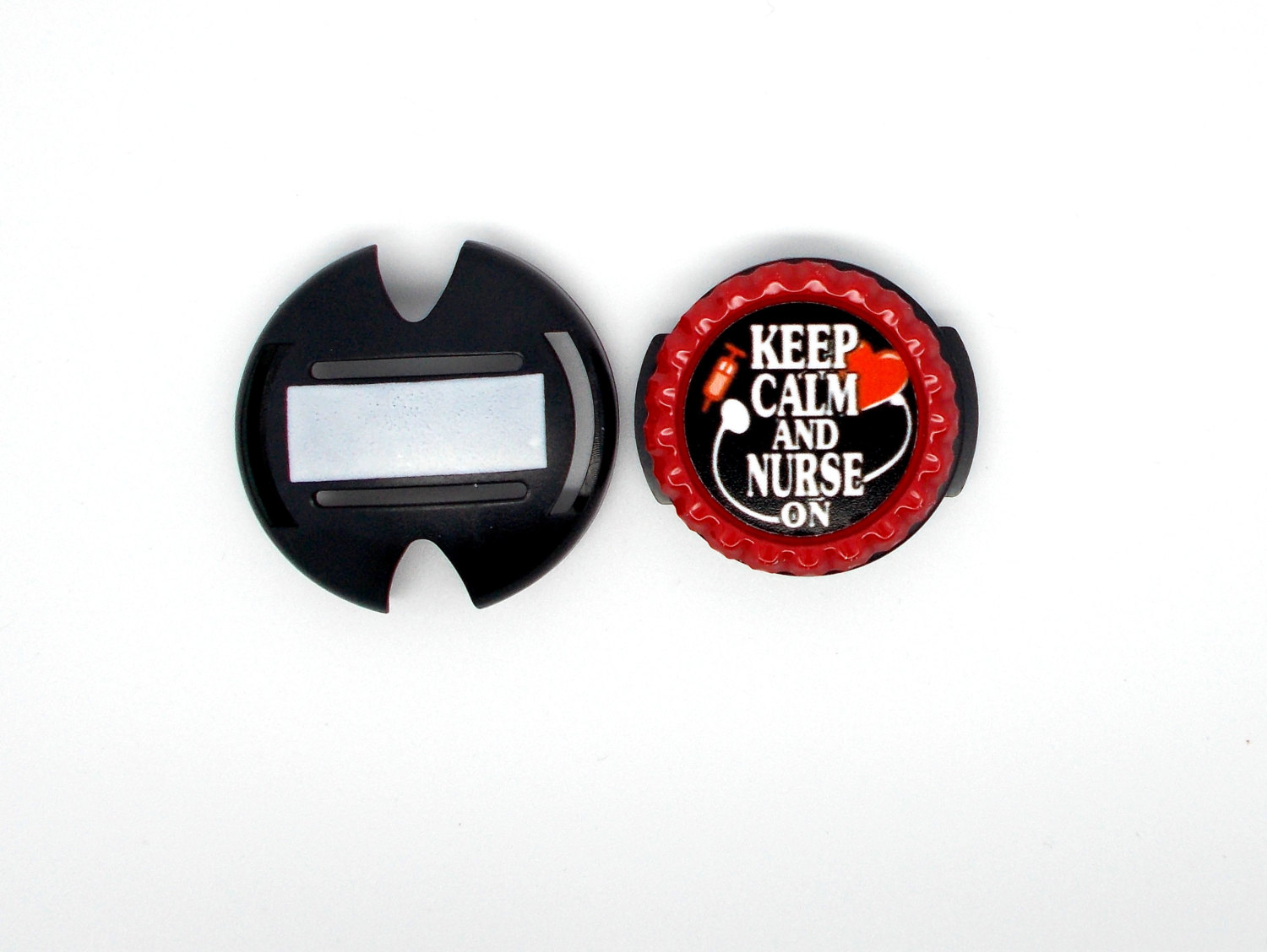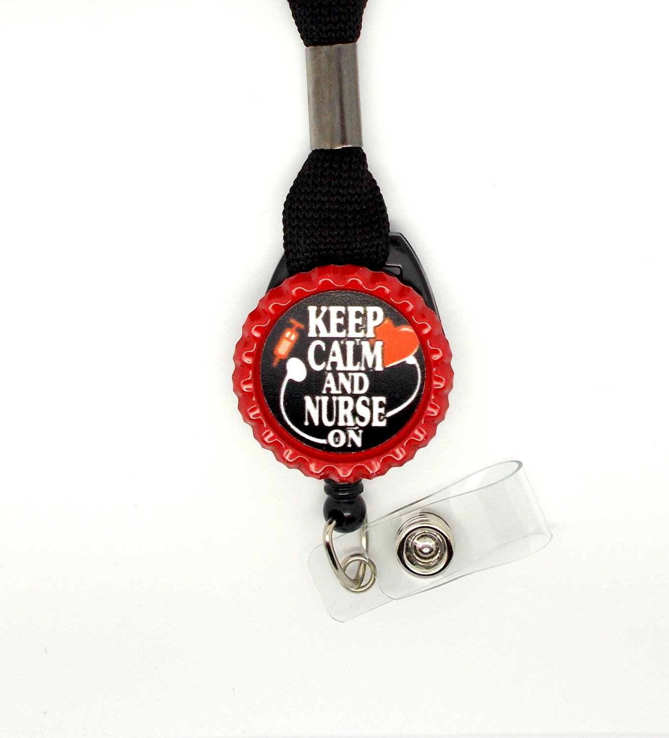 Your choice of a black lanyard or a stethoscope ID tag. This item features Keep Calm and Nurse On in red. Graphic is sealed with an epoxy sealant and is glued to a red bottle cap. Bottle cap will be glued to your choice of a black lanyard or a stethoscope ID tag.