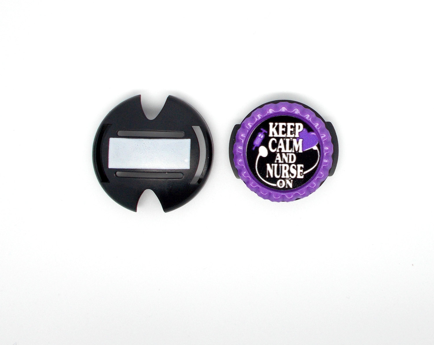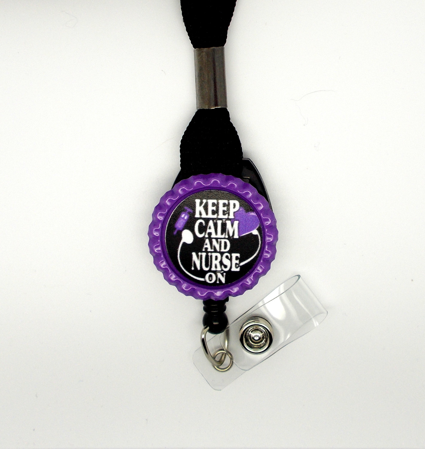 Your choice of a black lanyard or a stethoscope ID tag. This item features Keep Calm and Nurse On in purple. Graphic is sealed with an epoxy sealant and is glued to a purple bottle cap. Bottle cap will be glued to your choice of a black lanyard or a stethoscope ID tag.
