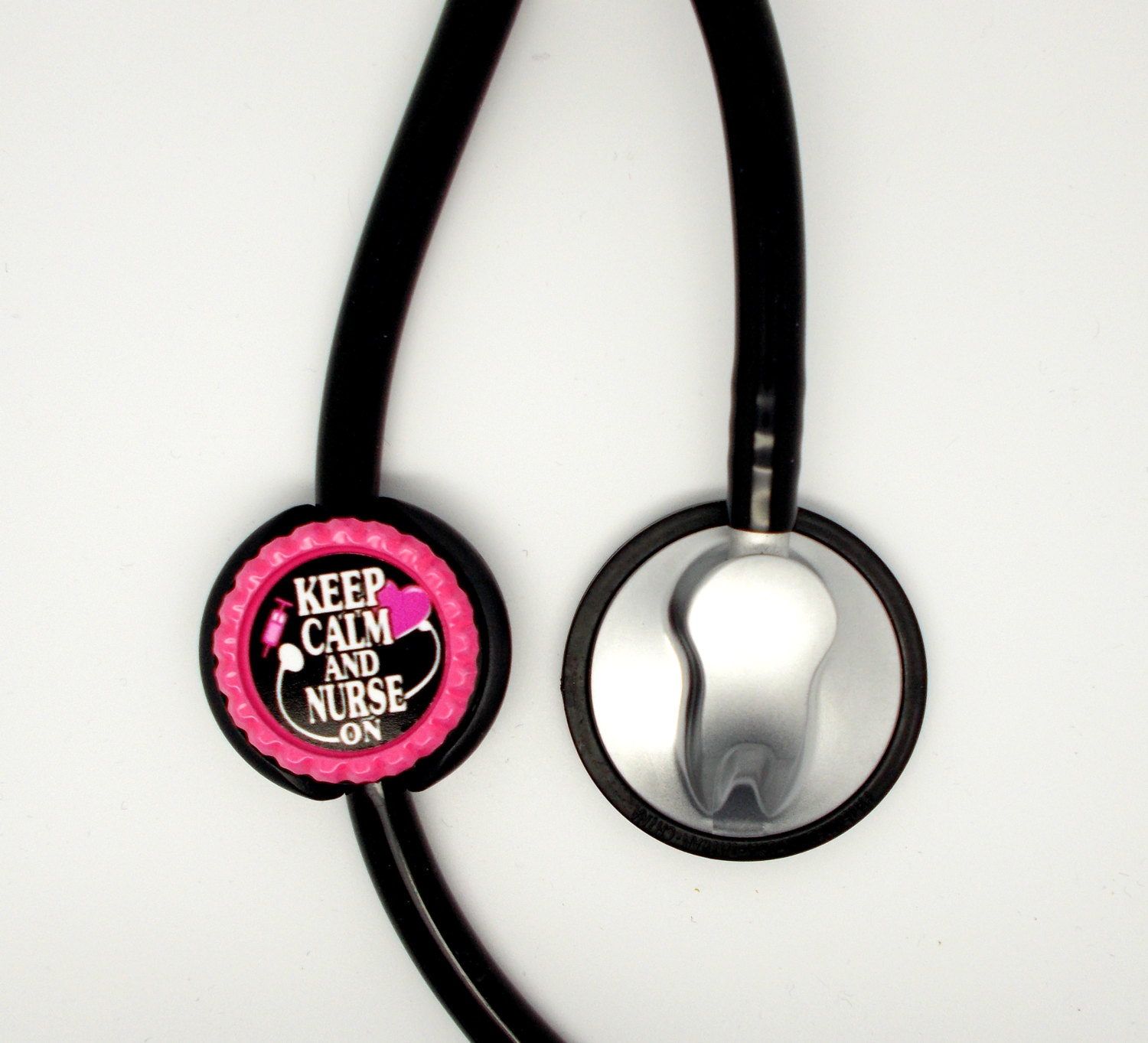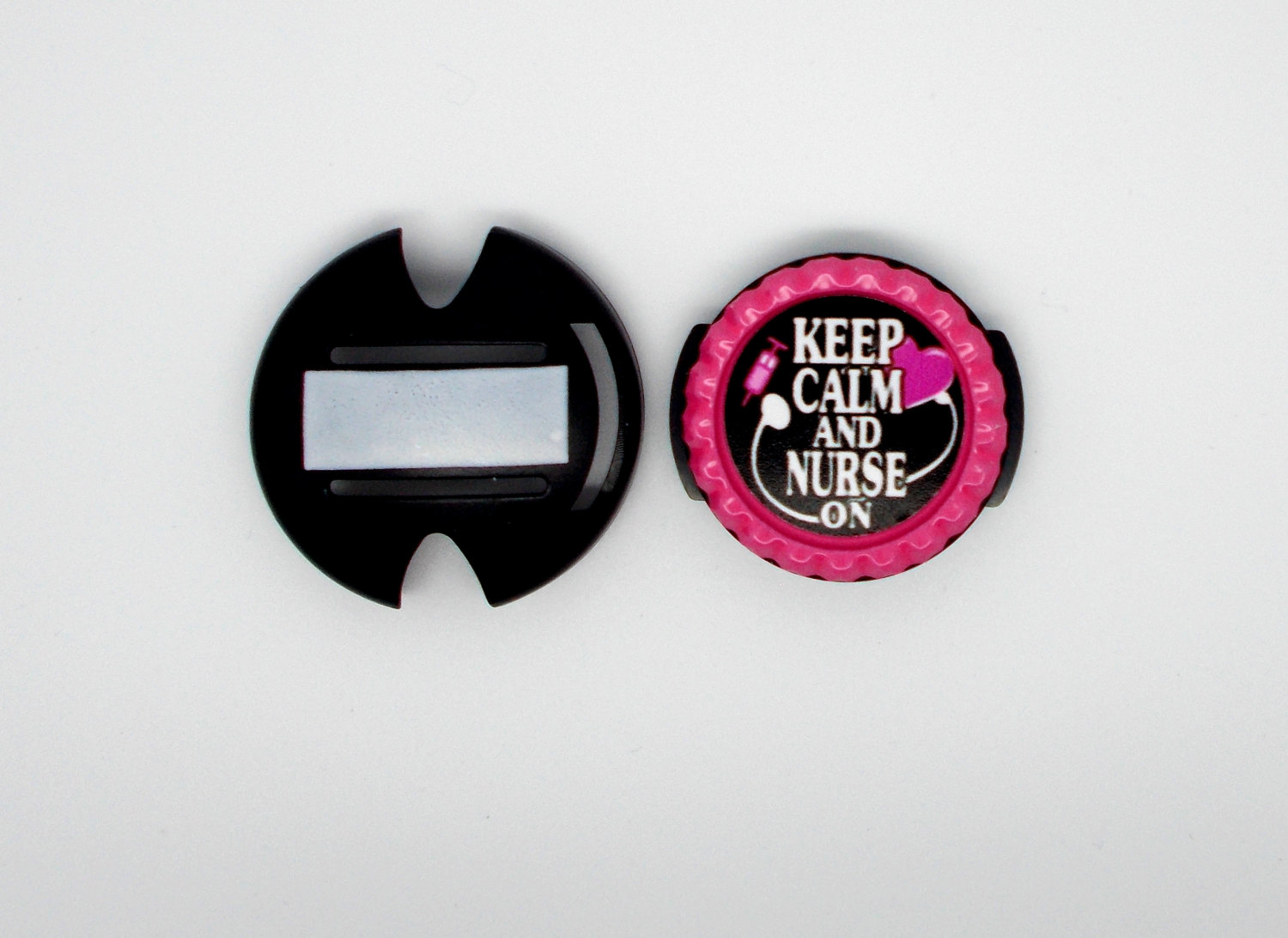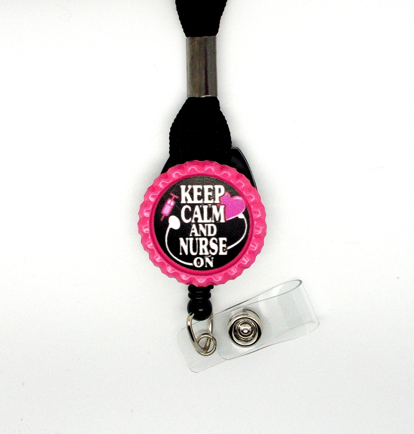 Your choice of a black lanyard or a stethoscope ID tag. This item features Keep Calm and Nurse On in pink. Graphic is sealed with an epoxy sealant and is glued to a pink bottle cap. Bottle cap will be glued to your choice of a black lanyard or a stethoscope ID tag.