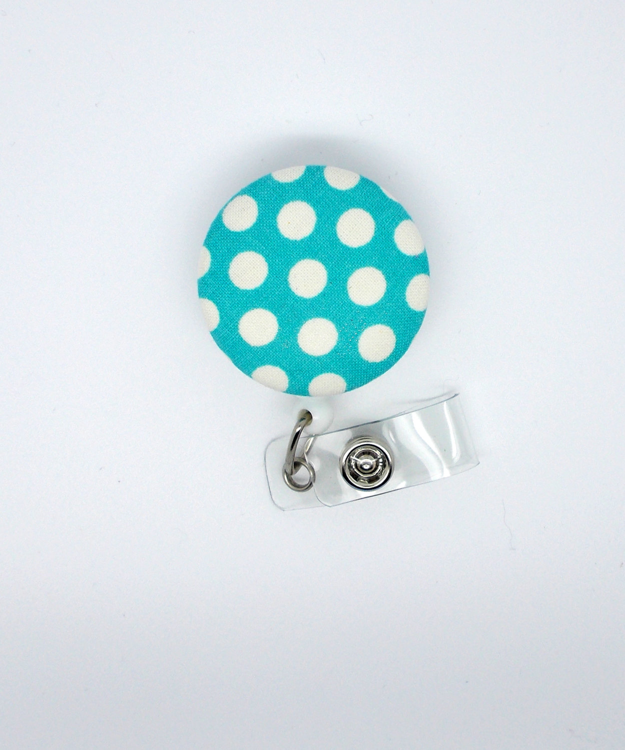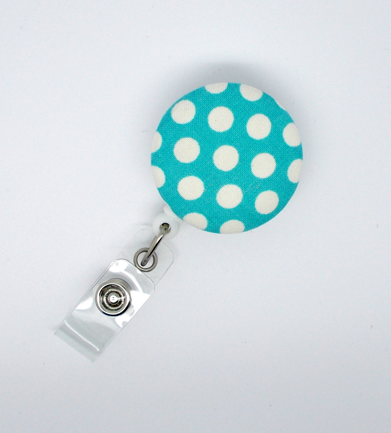 This fabric covered button ID badge reel features an aqua and white polka dot fabric covered button. Sits on a white, hard plastic badge reel.