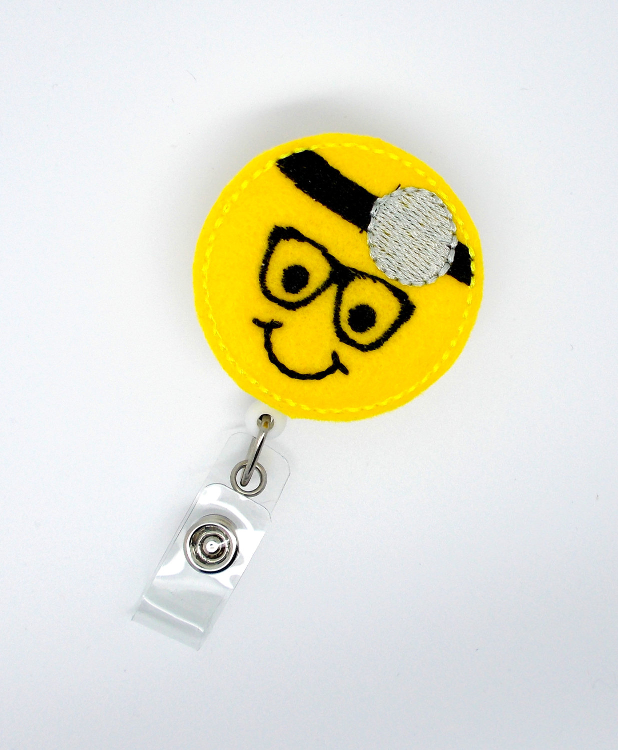 This retractable ID felt badge holder features a yellow smiley face with glasses and is accented with a head mirror. Sits on a white, hard plastic badge reel.