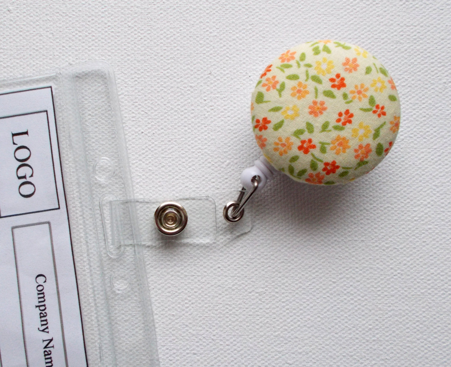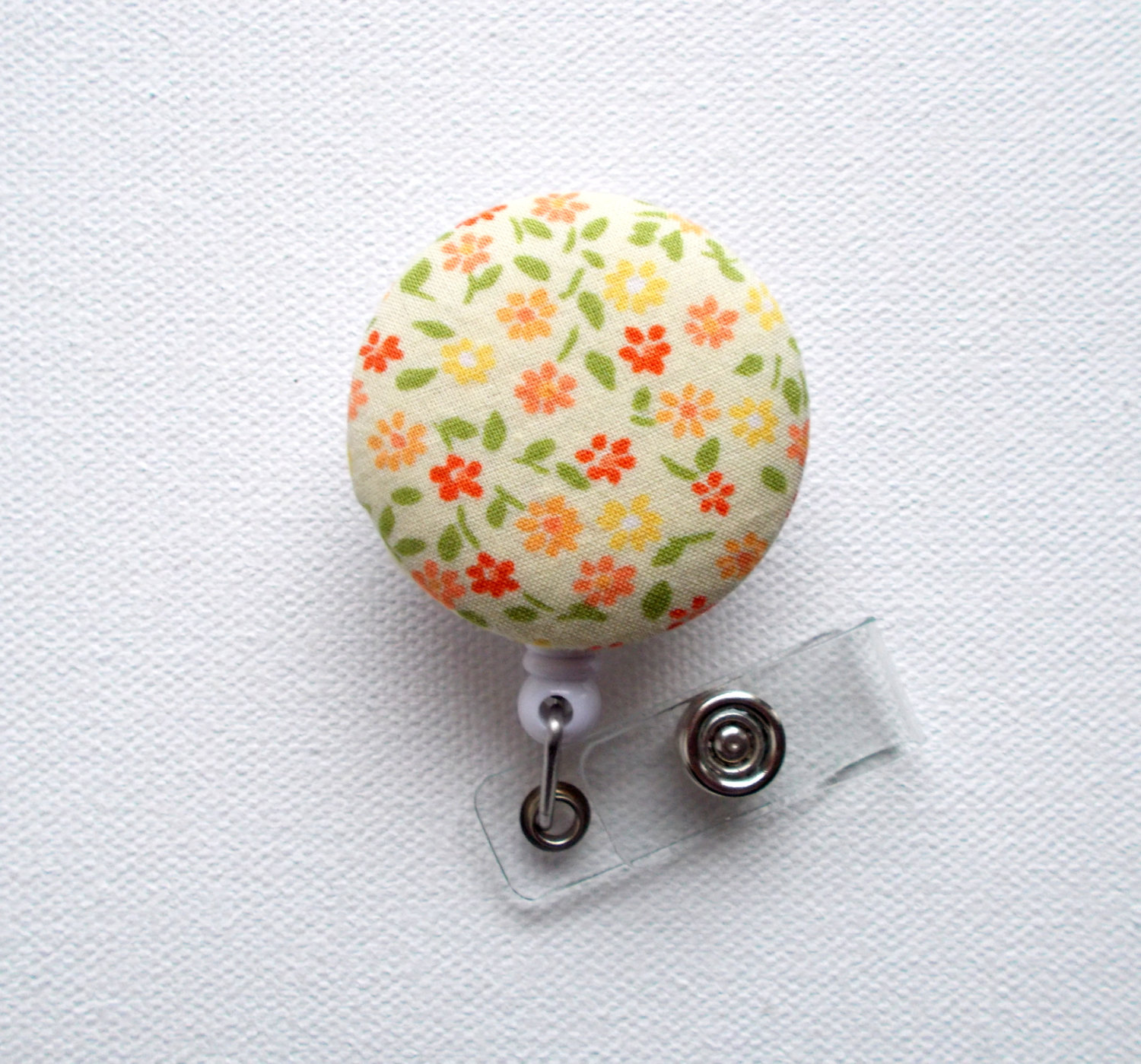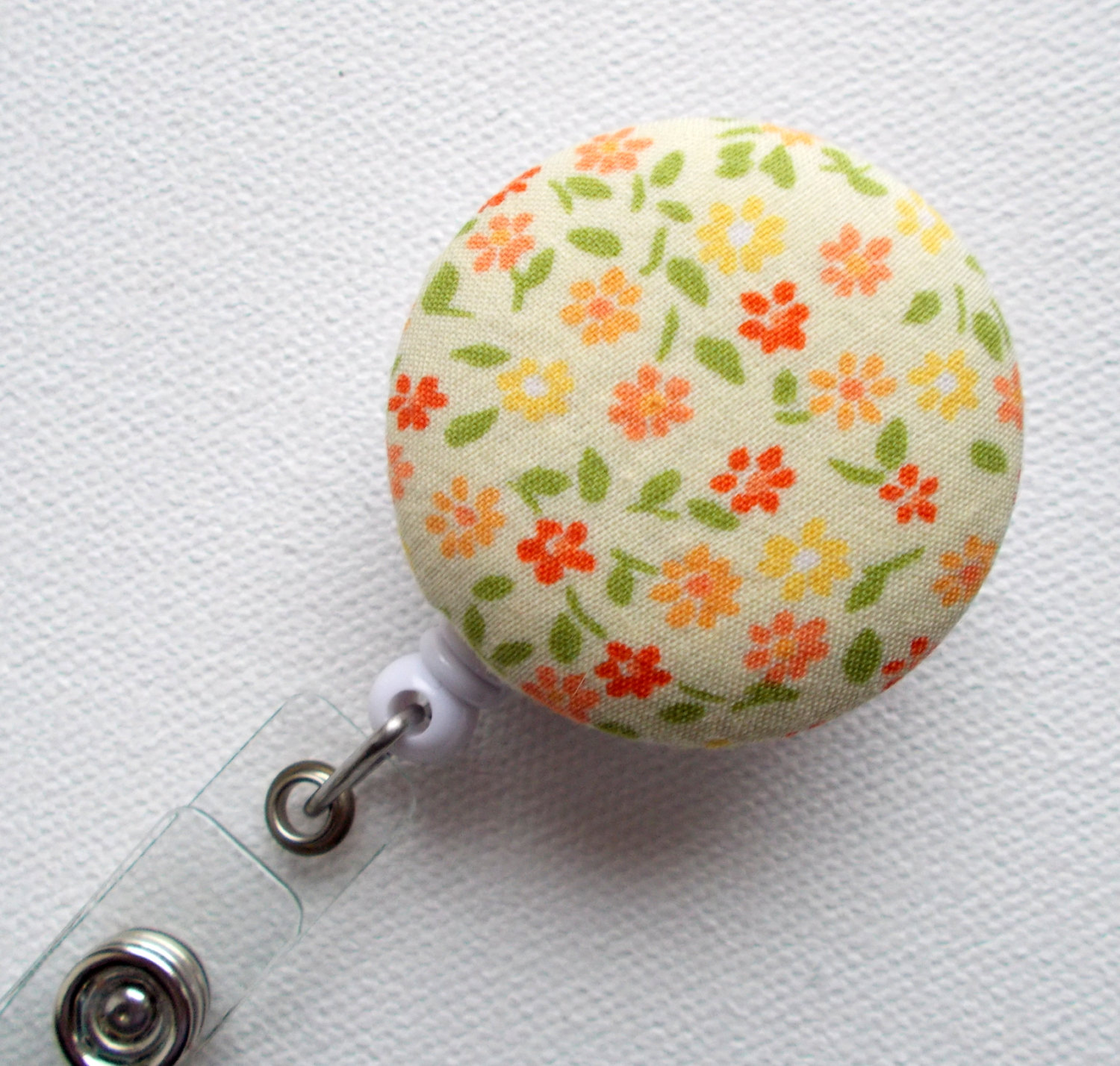 This adorable retractable ID badge reel was handmade from my fabric covered buttons. It features yellow and orange flowers. This badge was handmade from upcycled fabric. Fabric covered button sets on a white retractable ID badge reel.