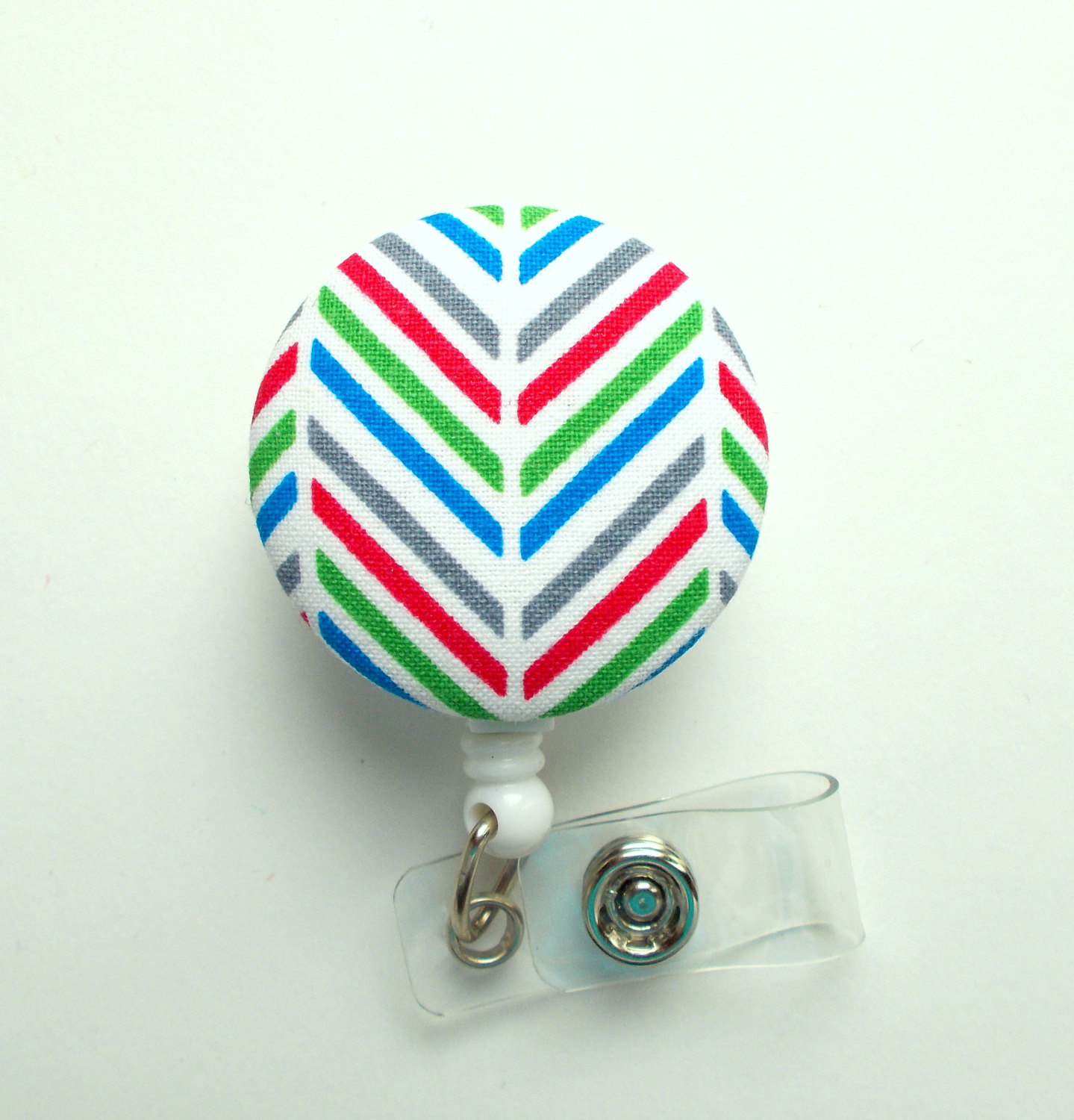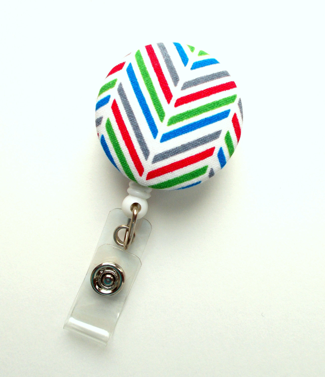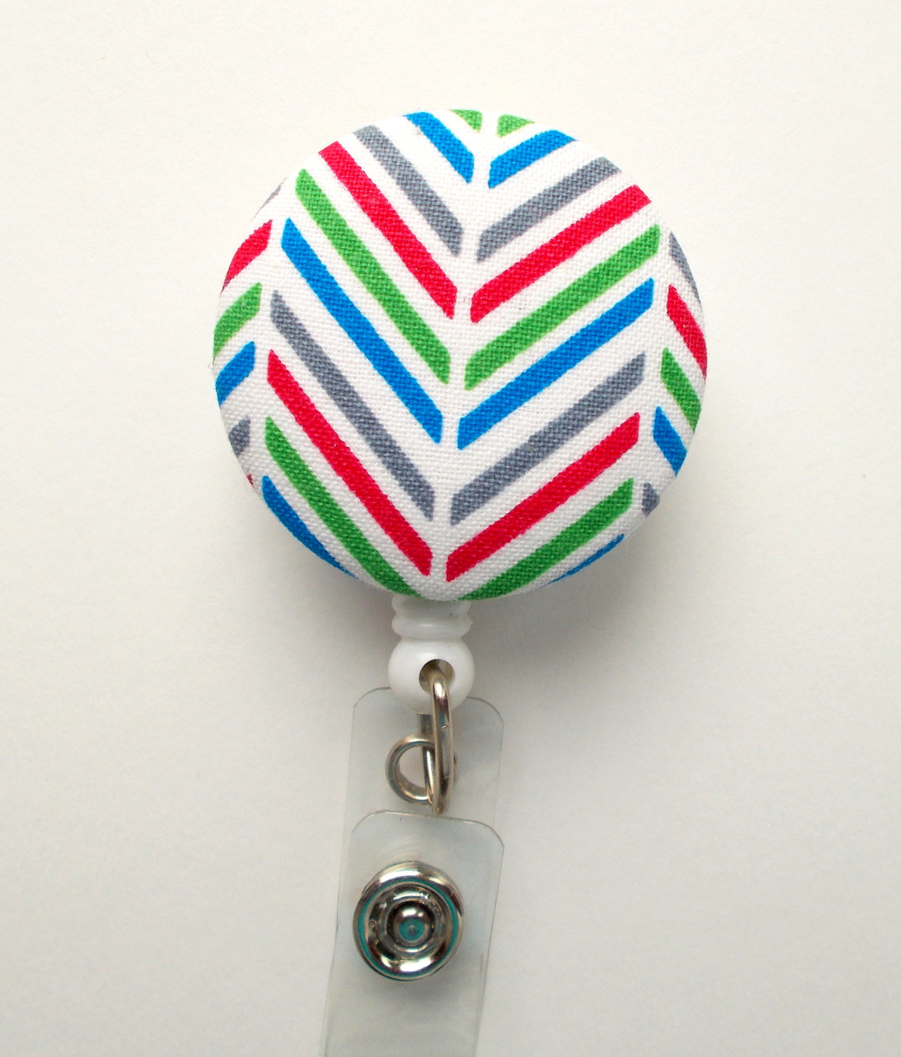 This ID badge reel features a mini Chevron stripe design in red, white, green, gray and blue fabric covered button. Button sits on a white, hard plastic badge reel.