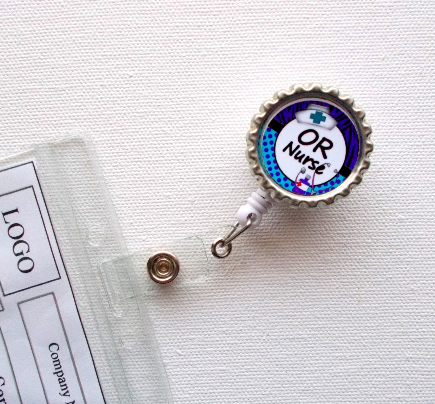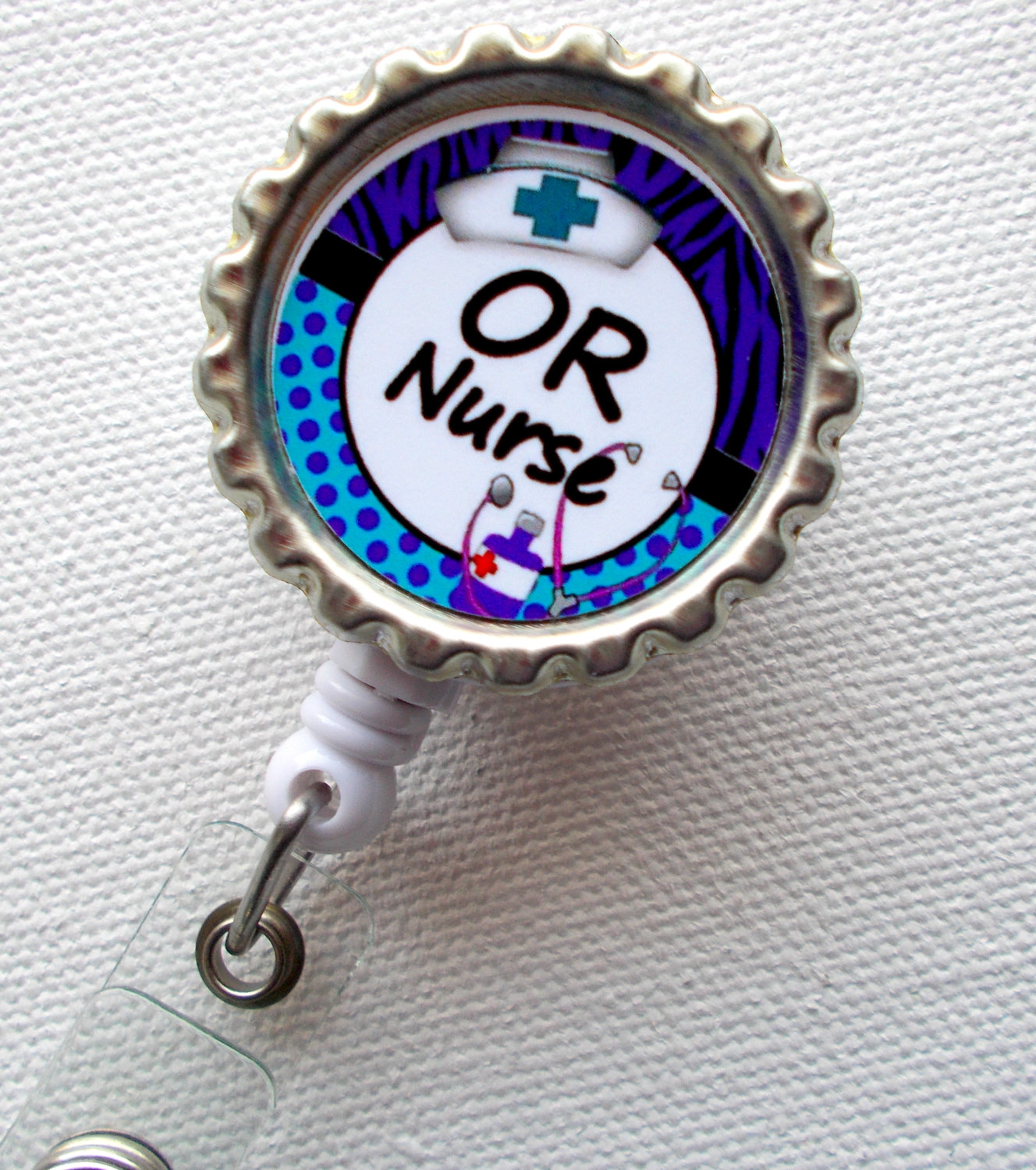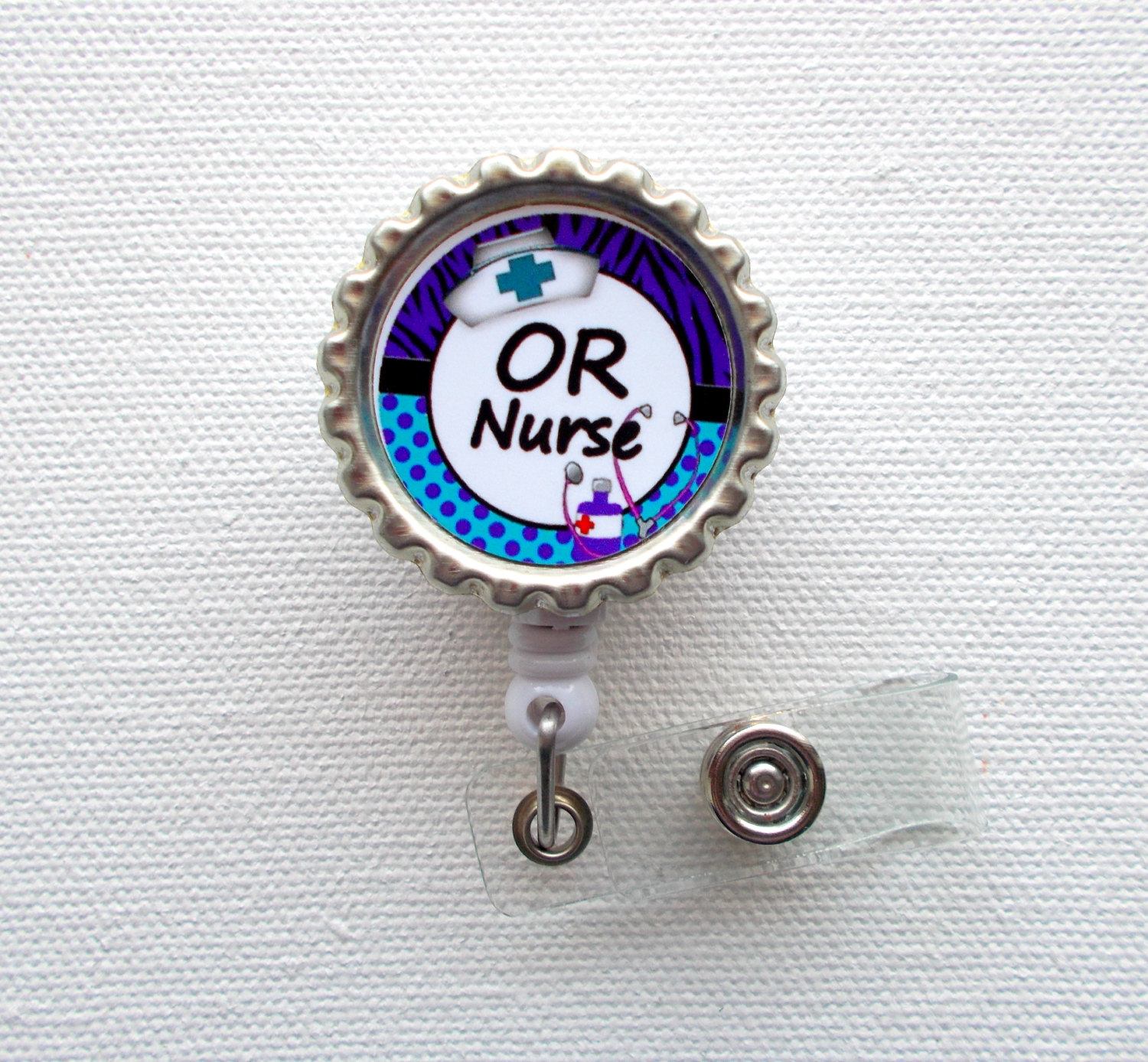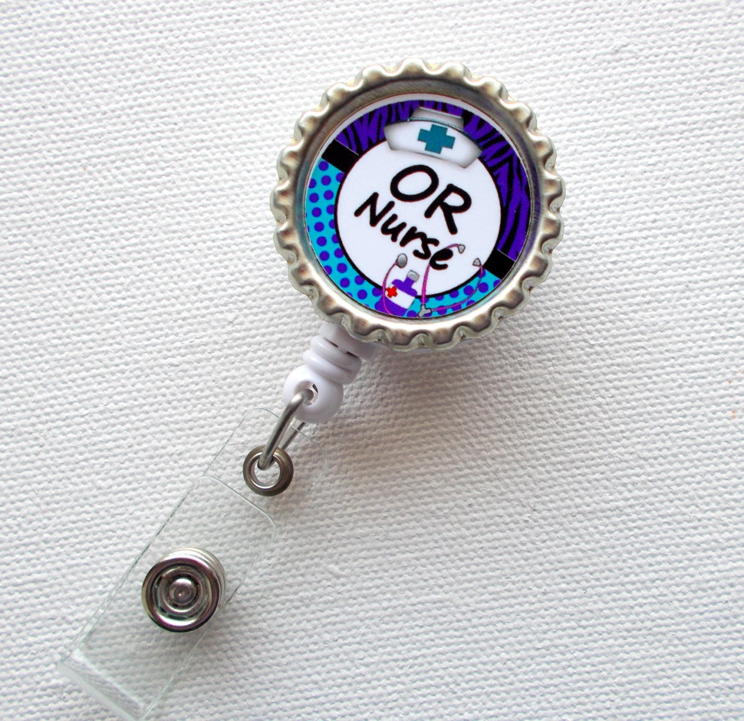 OR Nurse ID Badge holder set on a silver bottle cap. Super cute and sure to brighten your day!