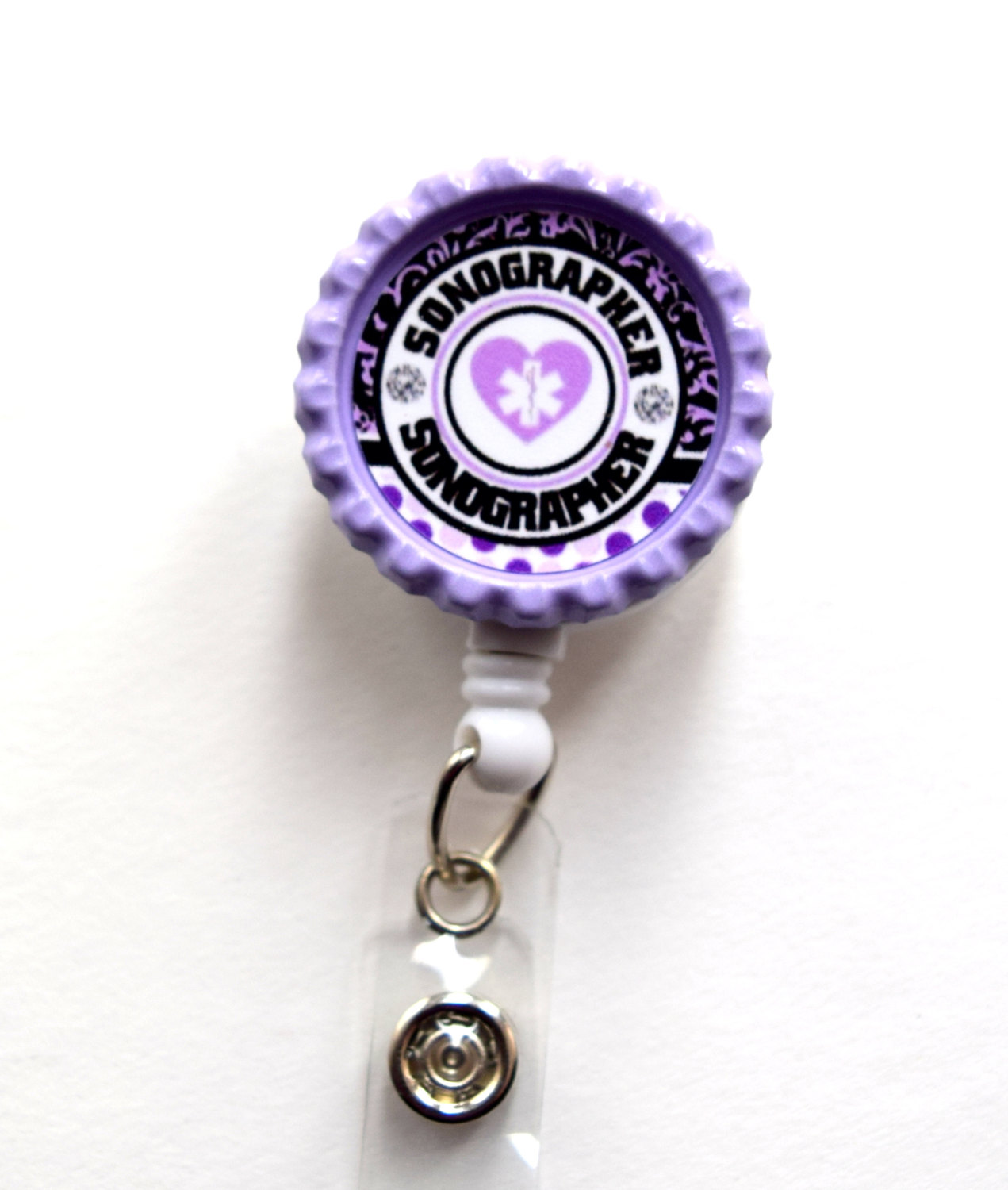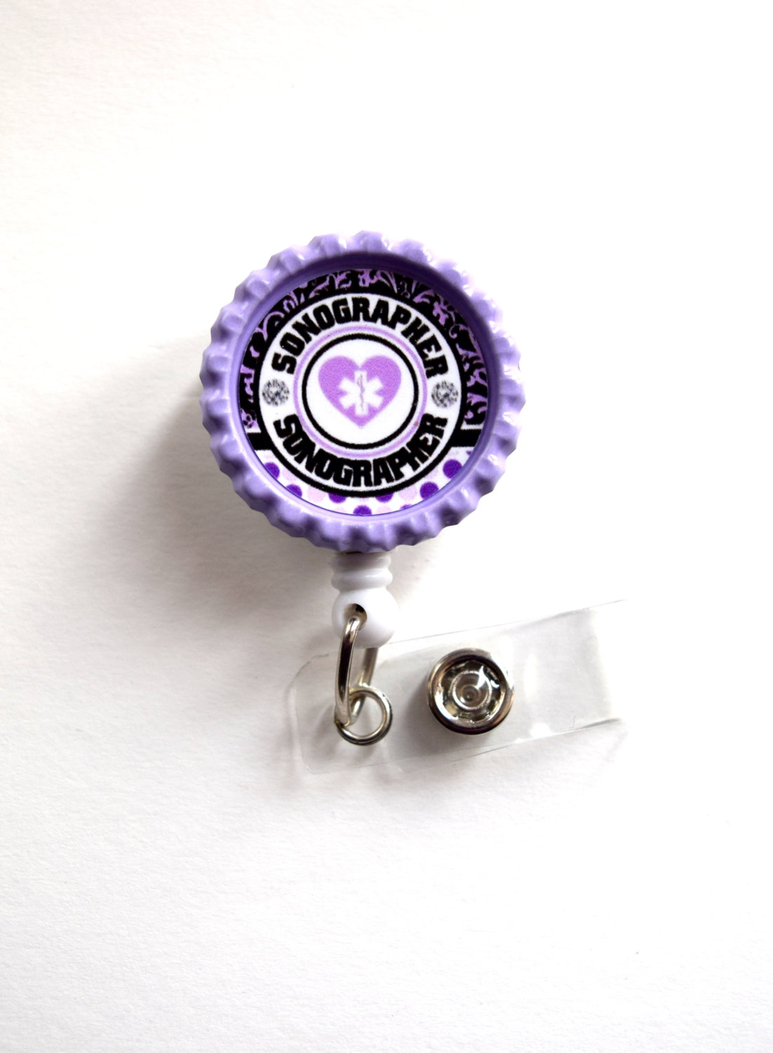 This badge reel is perfect for the ultrasound technician. Graphic is sealed with an epoxy sealant. It can be wiped clean but it is not waterproof. Graphic is glued to a lavender bottle cap. Sits on a white, hard plastic badge reel.