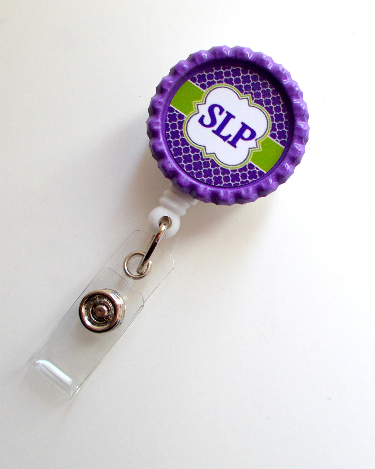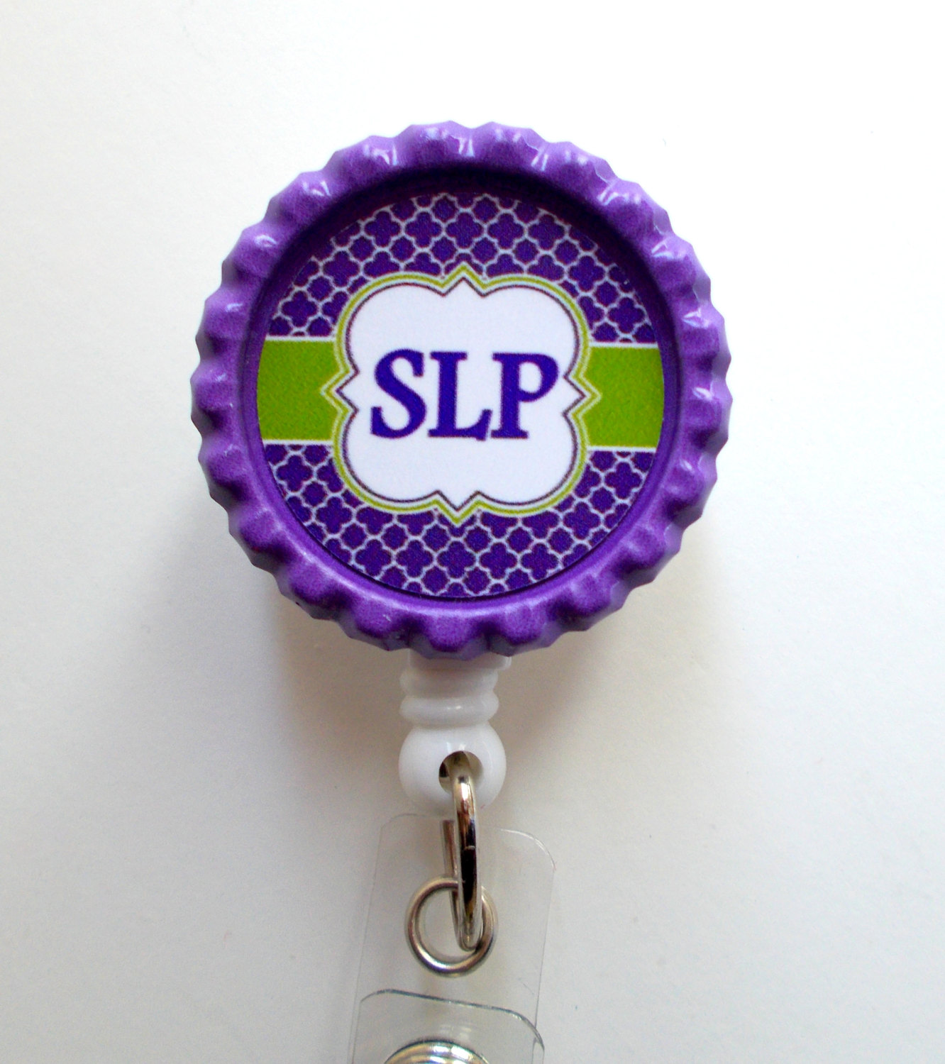 This badge features the initial SLP surrounded by a purple and green pattern. Sits on a white, hard plastic badge reel. If you need another initial or prefer your name/initial just leave me a message in the message box at checkout.
