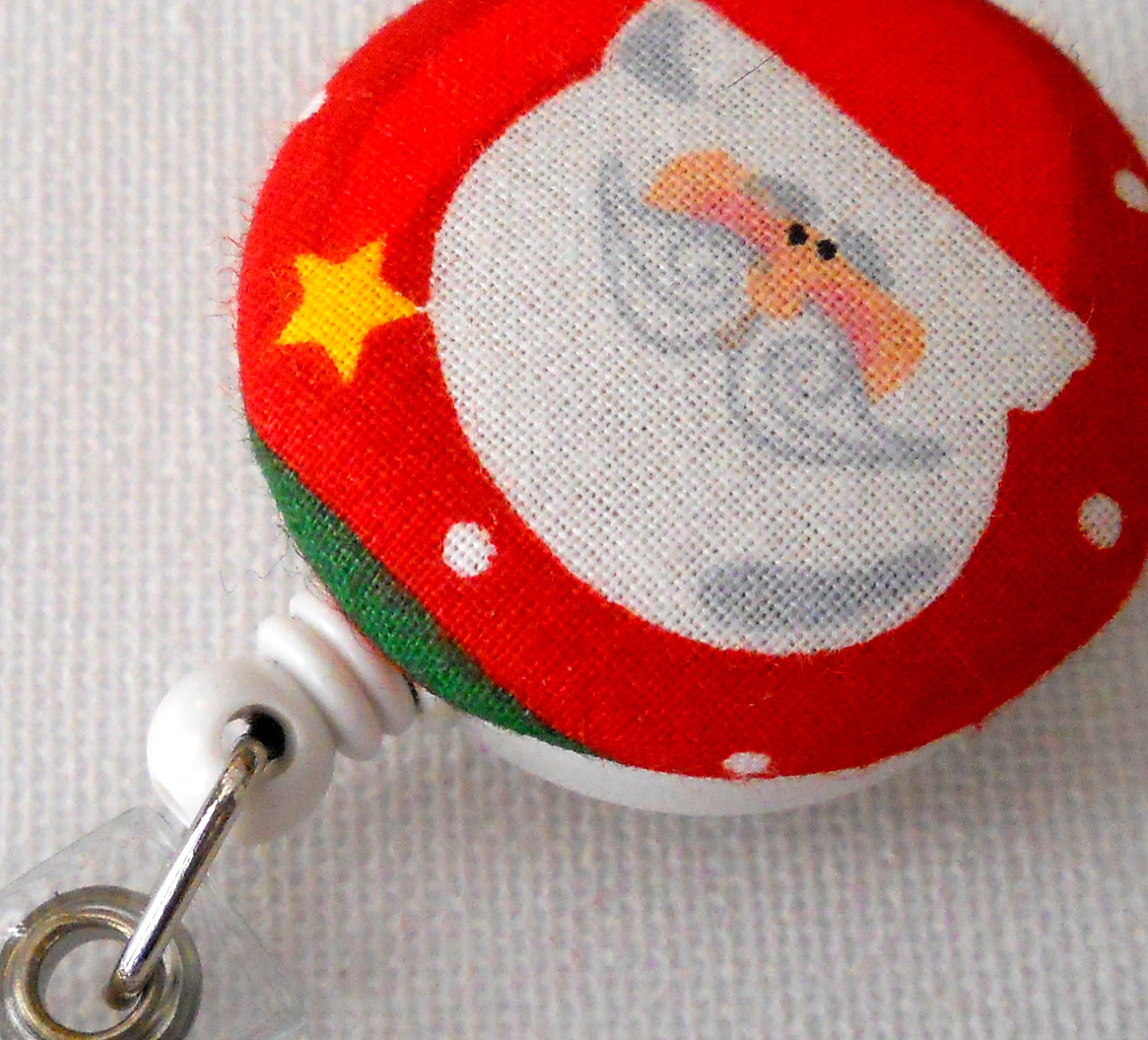 This adorable retractable ID badge reel was handmade from my fabric covered buttons. It features a sweet Santa Claus face on red fabric. Sits on a white hard plastic badge reel.