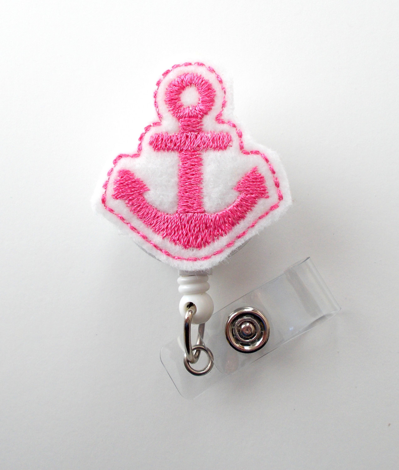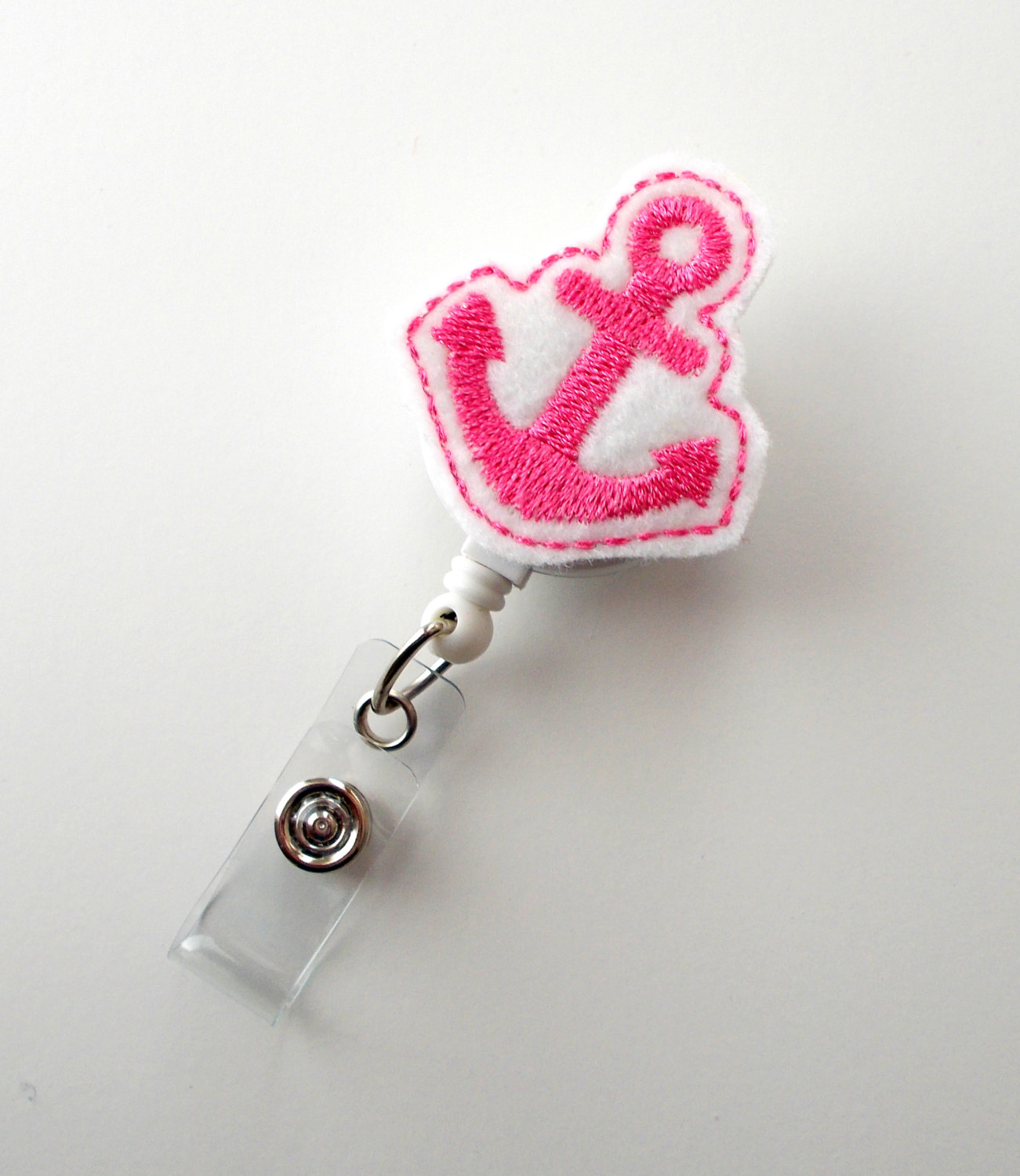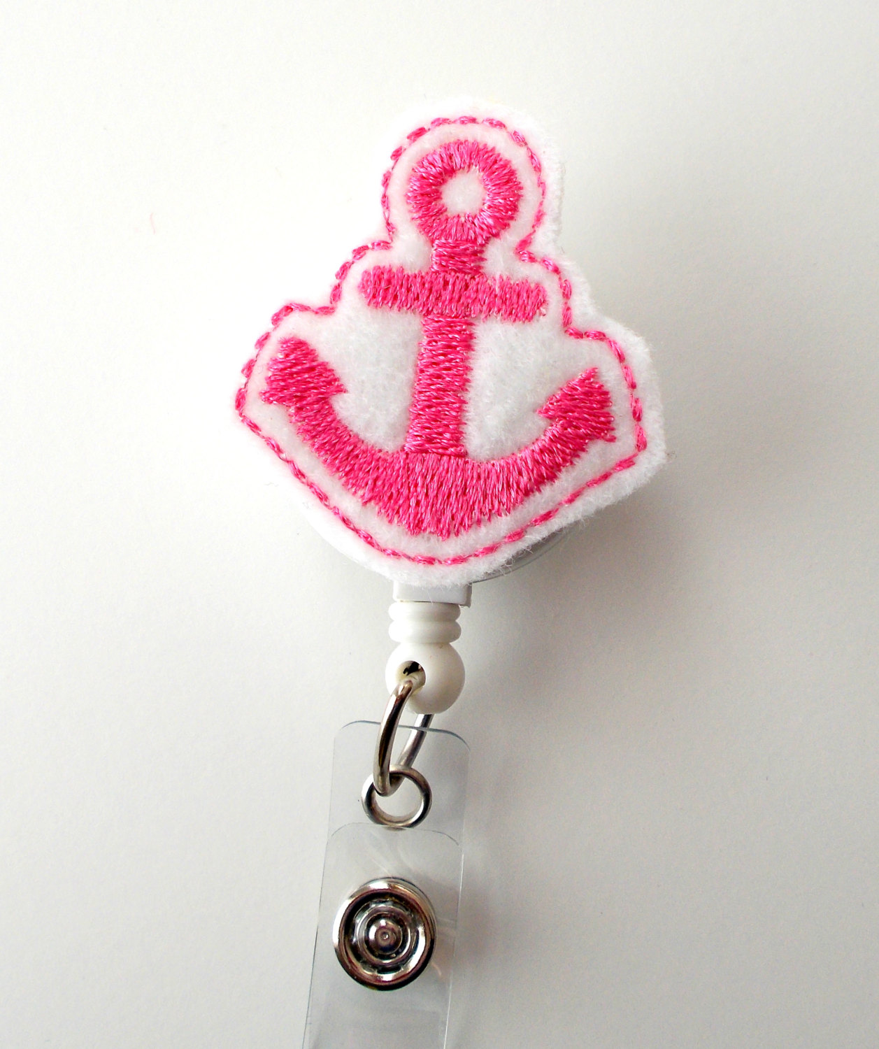 This retractable ID felt badge holder features a pink and white anchor felt applique. Sits on a white hard plastic badge reel.