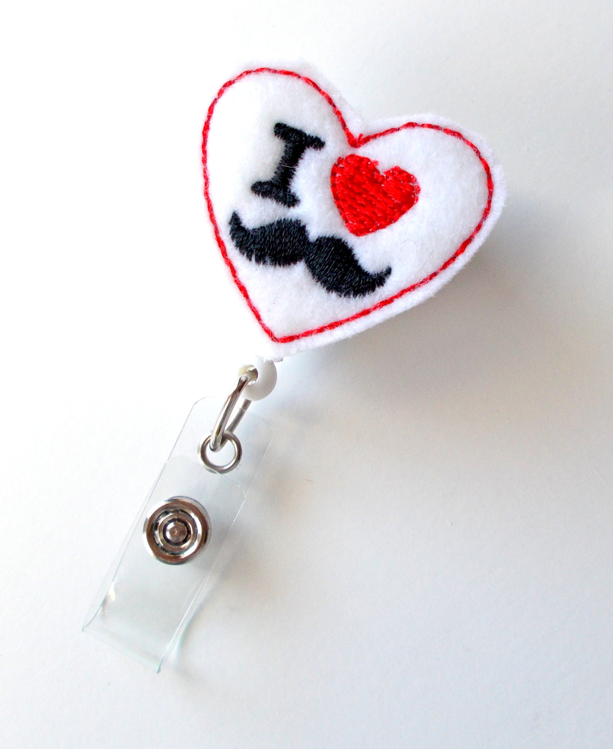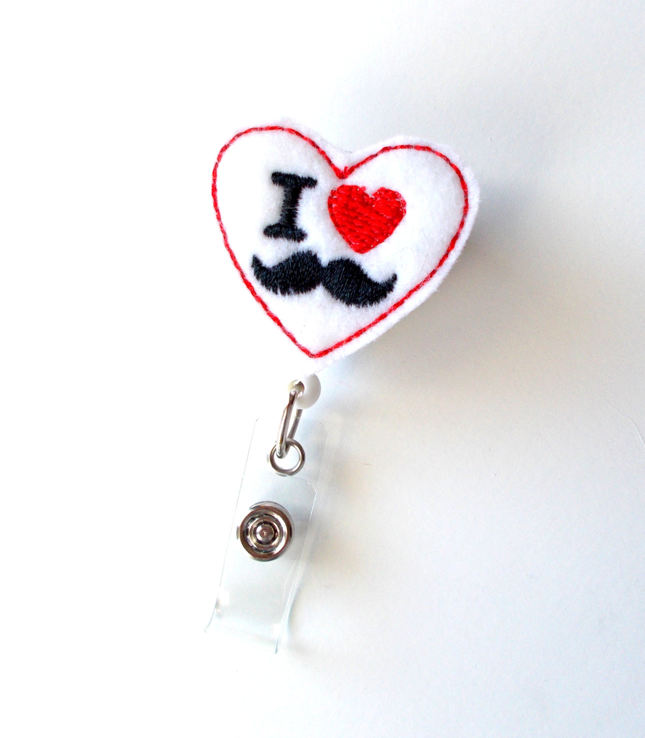 This retractable ID felt badge holder features an I Love Mustache heart felt applique. Sits on a sturdy white badge reel.