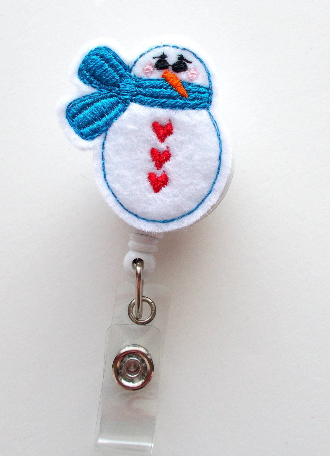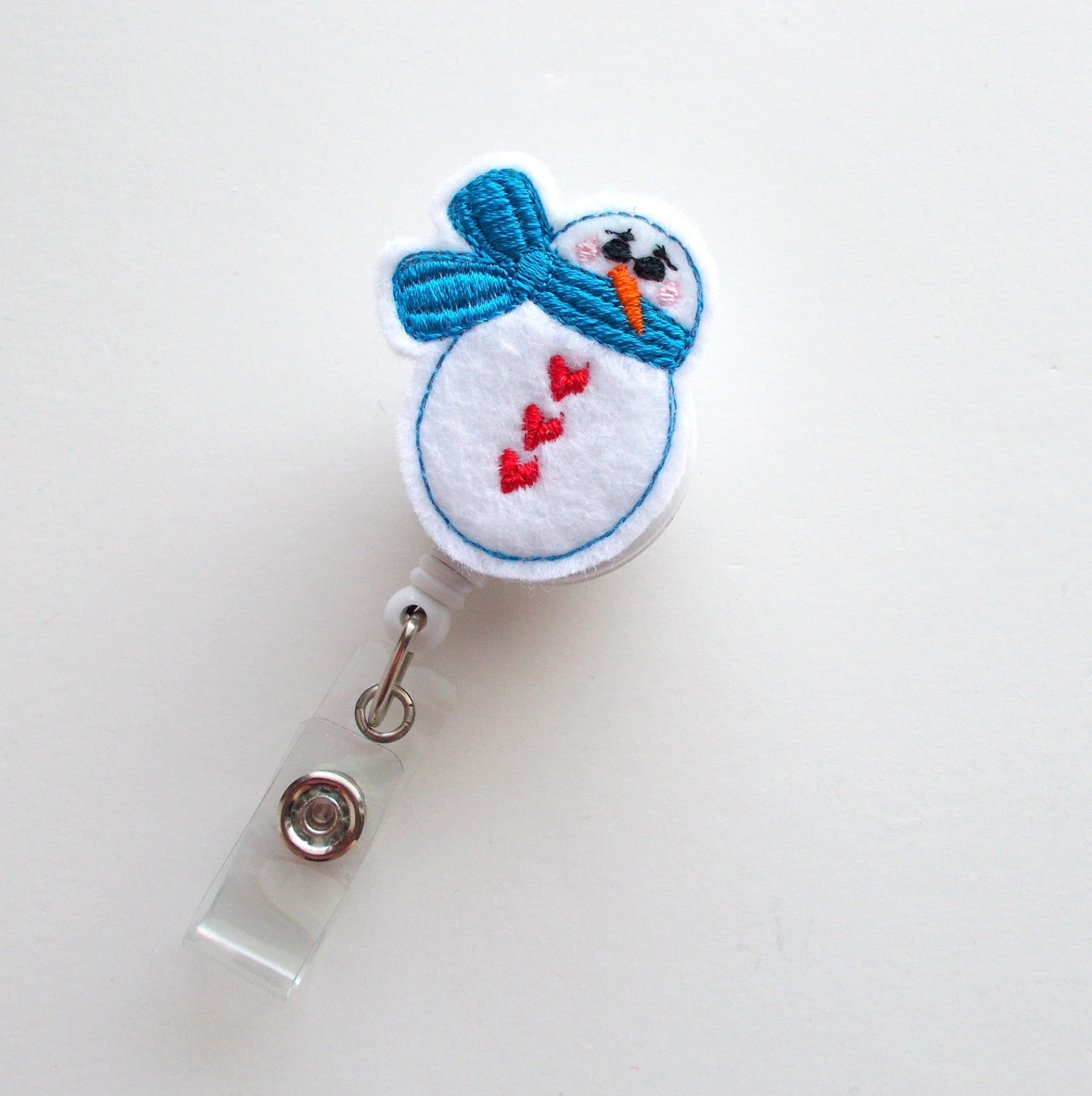 This retractable ID felt badge holder features a snowman felt applique, accented with a blue scarf and red heart buttons. Perfect for the holiday and winter seasons.
