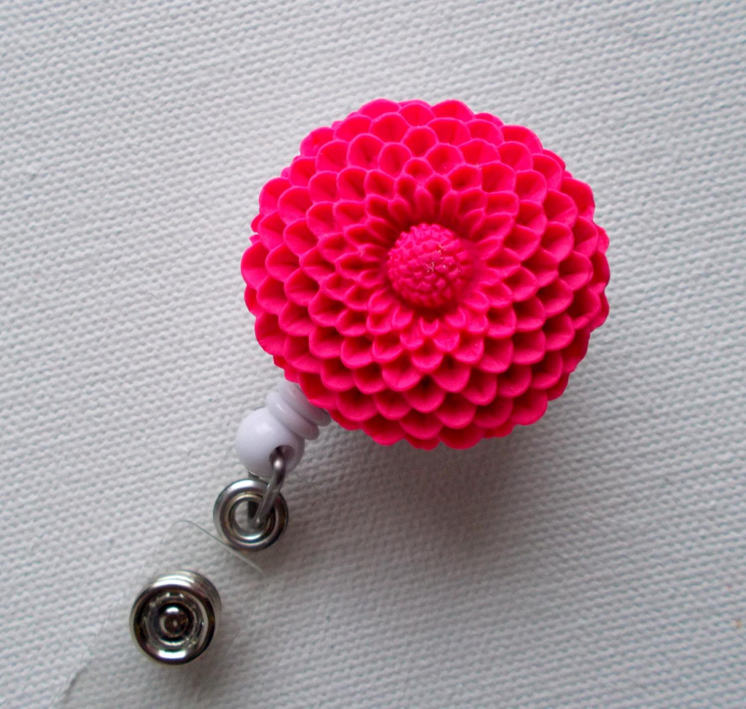 This name badge holder features a candy pink Pom Pom flower made from polymer clay.