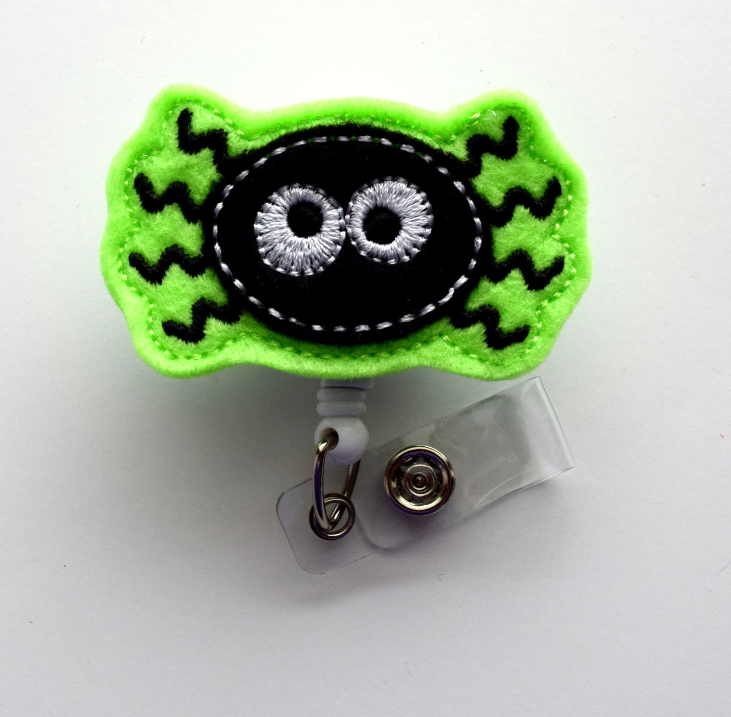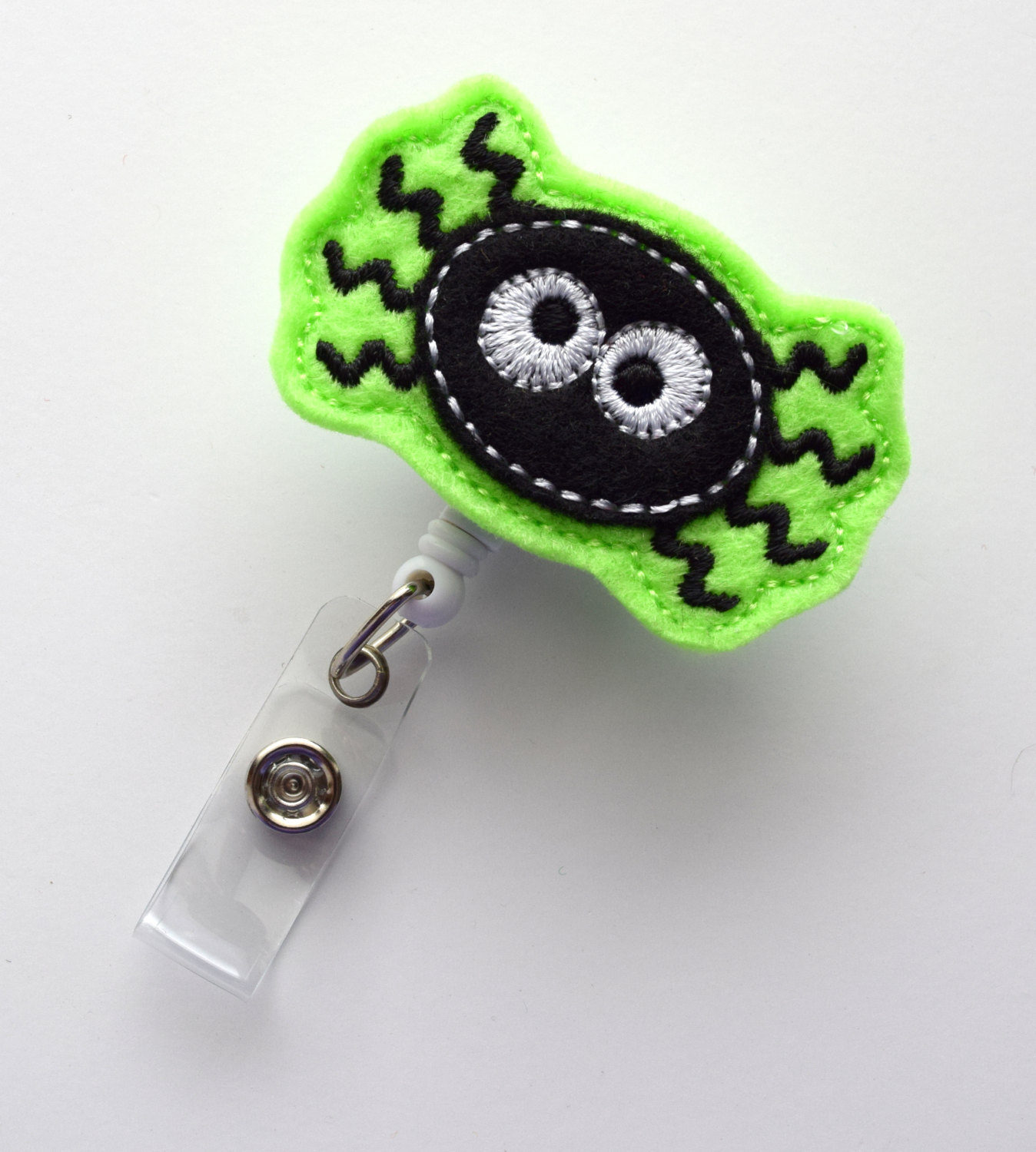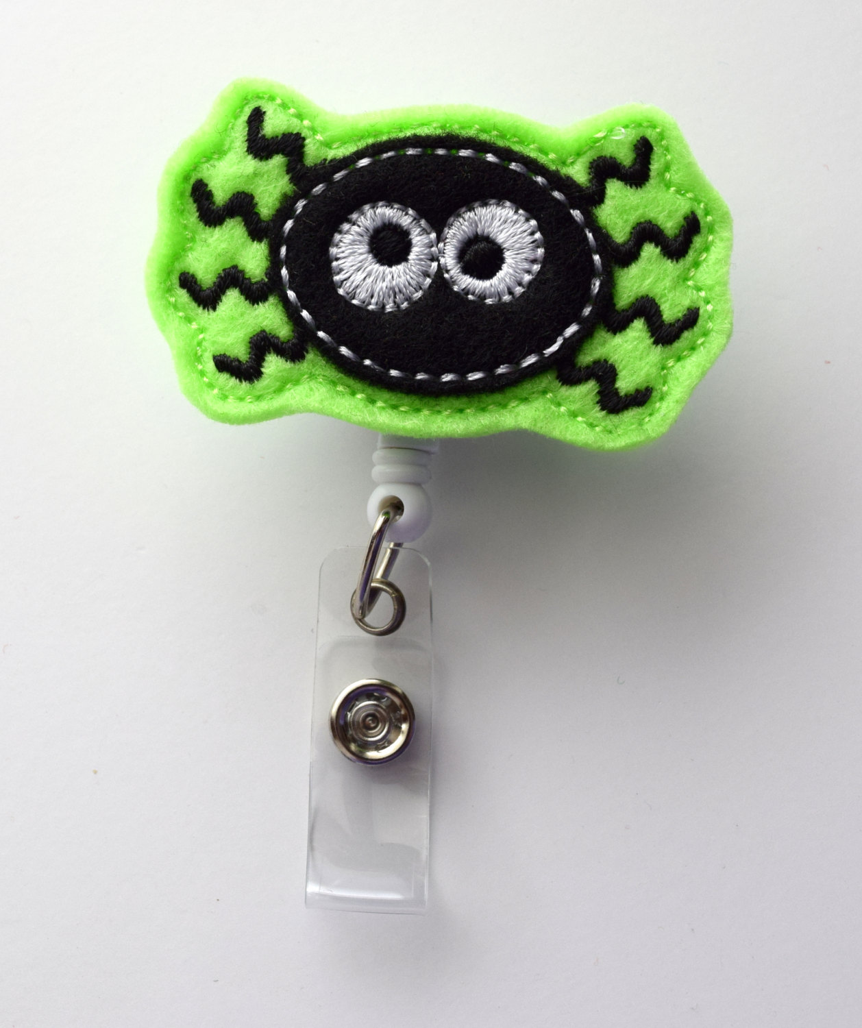 This retractable ID felt badge holder features a black and green spider felt applique. Sits on a sturdy white plastic badge reel.