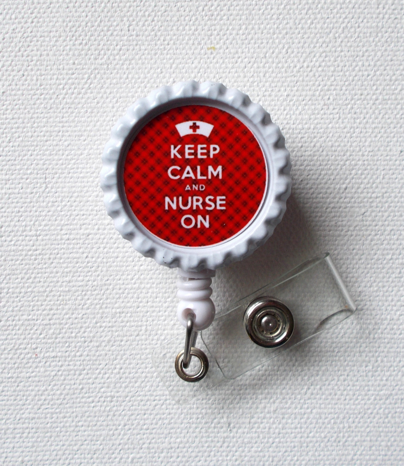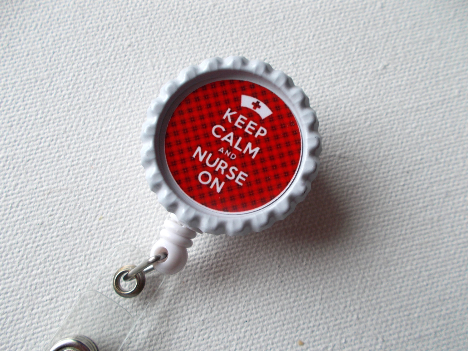 Keep Calm and Nurse On is the perfect badge holder for any nurse. Background is a tartan red and burgundy. Graphic sets on a white bottle cap. Graphic is sealed with an epoxy sealant. You may wipe the graphic with a damp cloth to clean it but it is not waterproof.