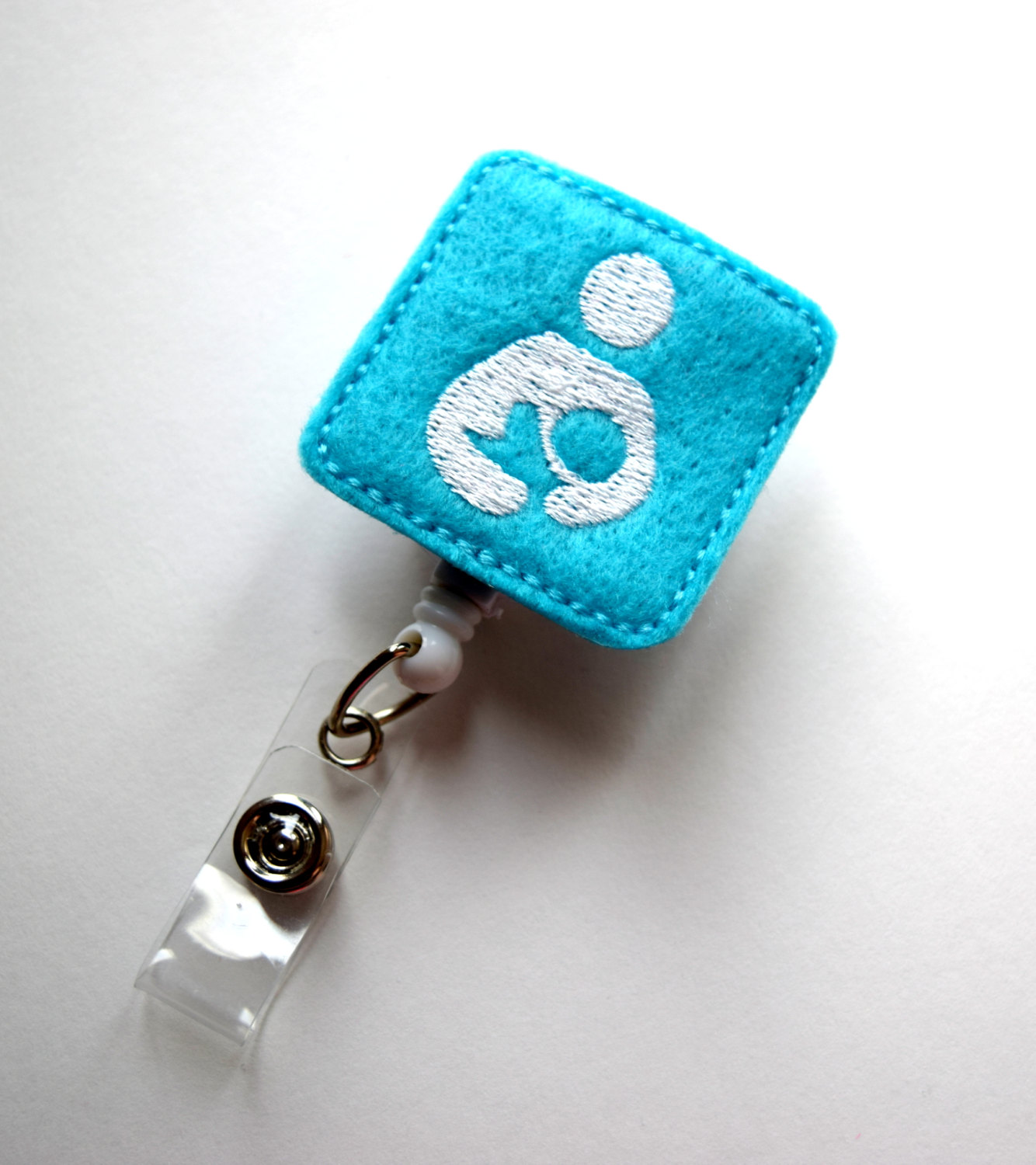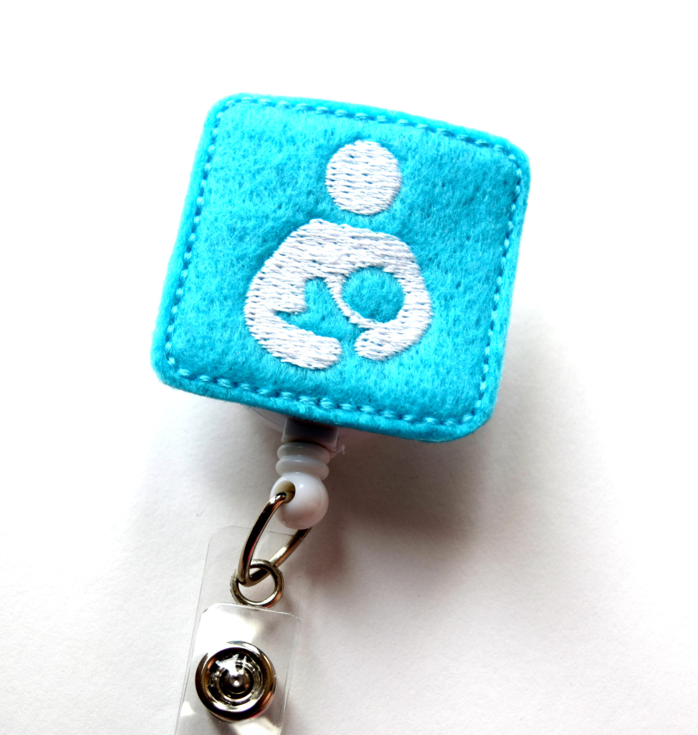 This retractable ID felt badge holder features a blue lactation specialist felt applique, Sits on a white, hard plastic badge reel.