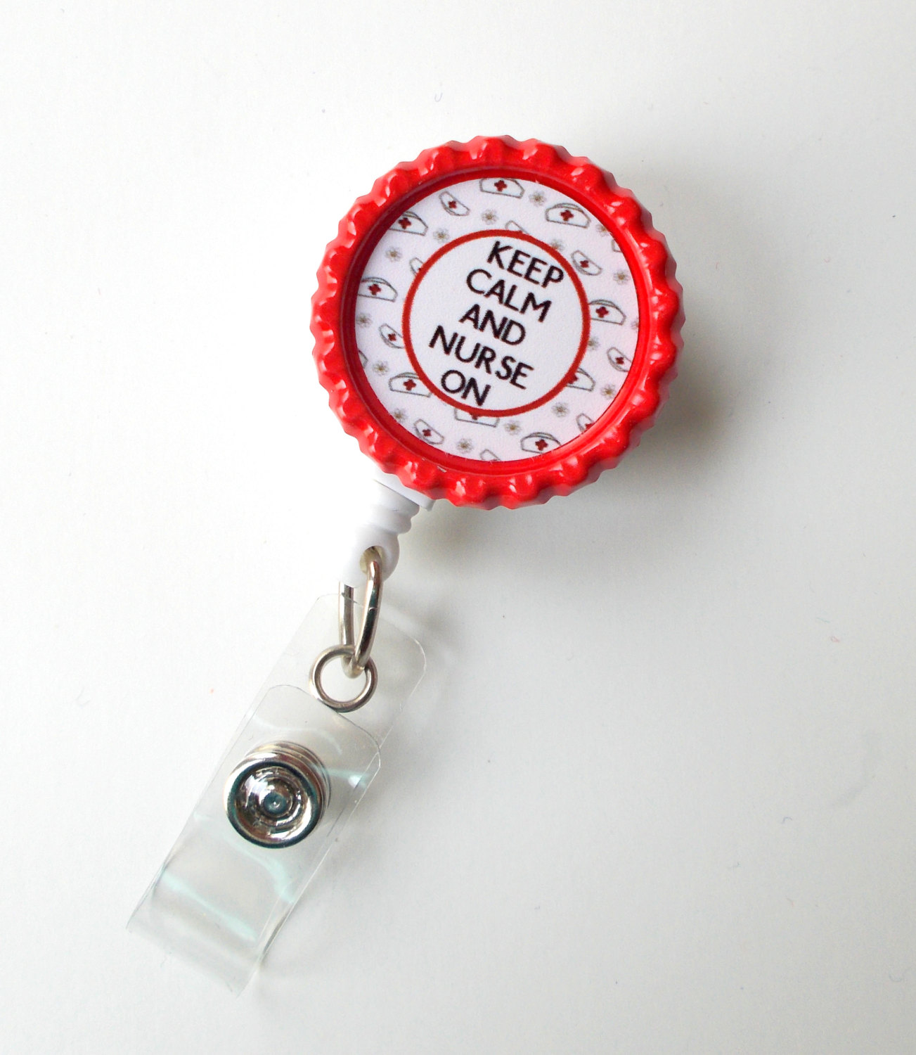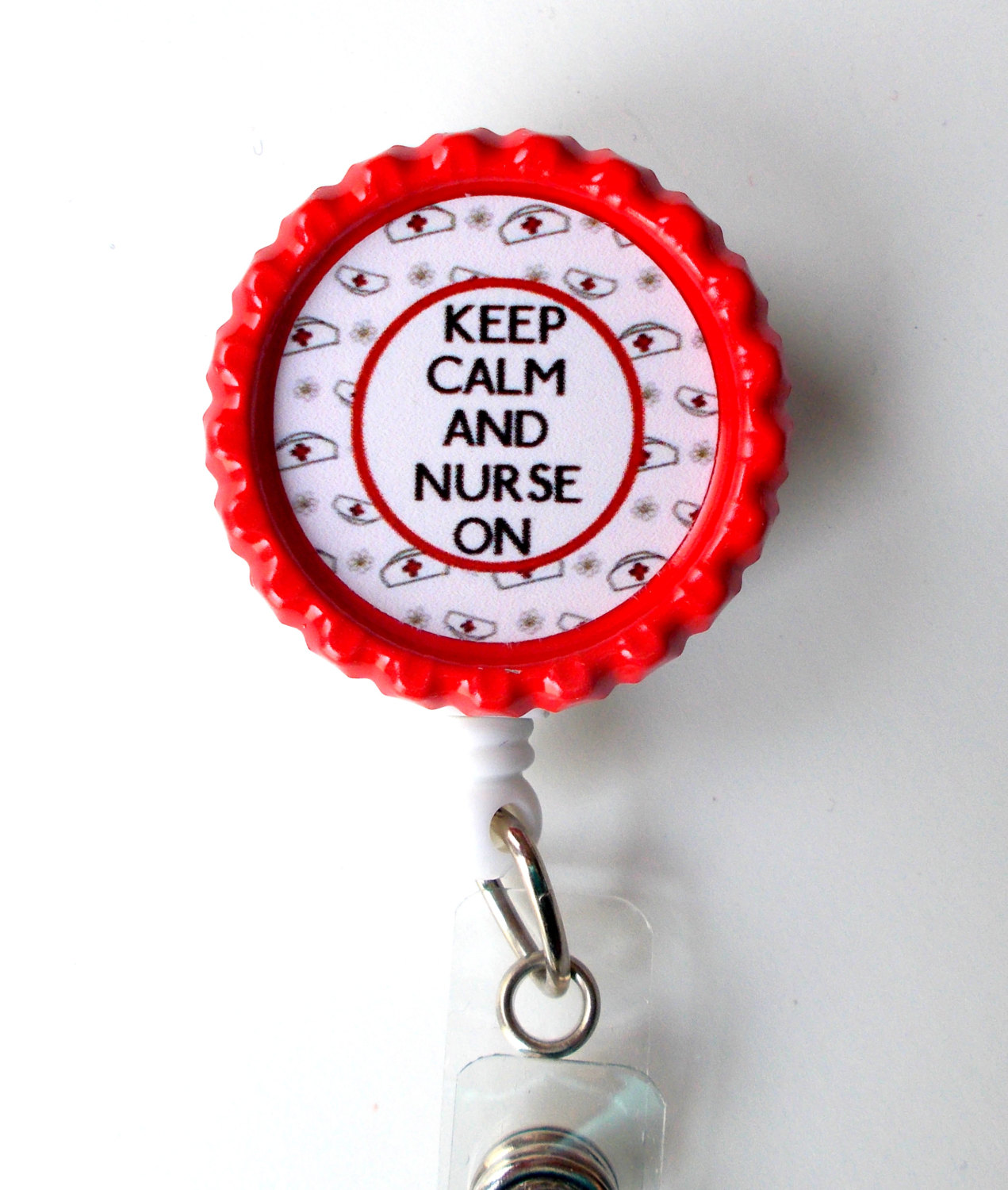 This ID Badge holder features the phrase Keep and Nurse On in red and white. The background is miniature nursing caps scattered throughout the design. Sets on a red bottle cap. White badge reel is made from a sturdy white plastic.