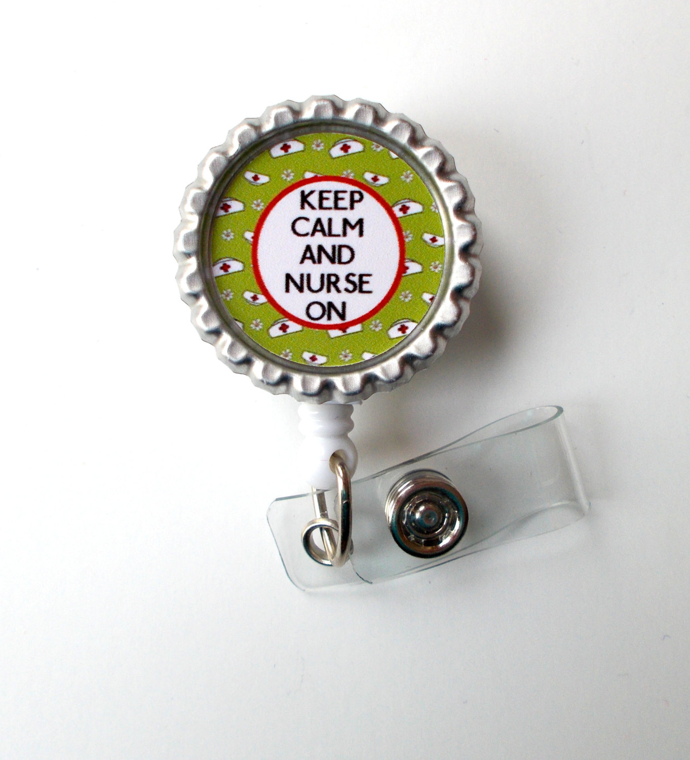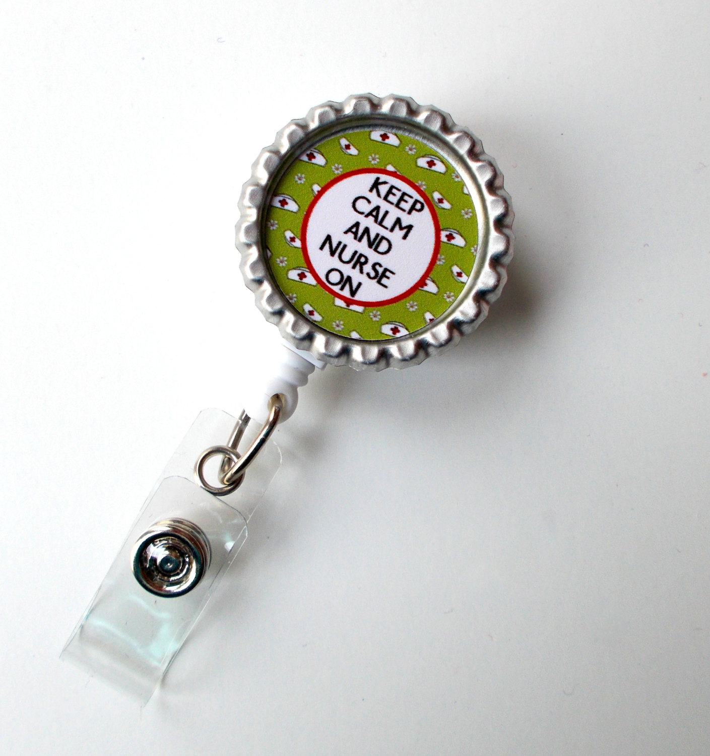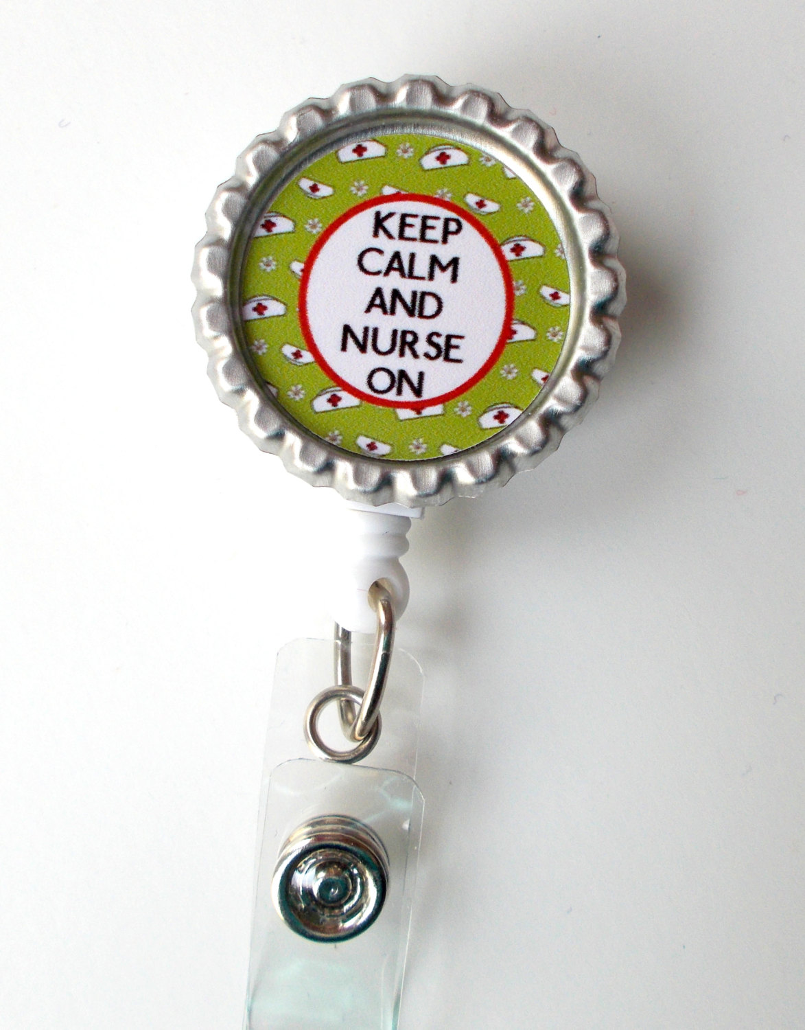 This ID Badge holder features the phrase Keep and Nurse On in olive green. The background is miniature nursing caps scattered throughout the design. Sets on a silver bottle cap. White badge reel is made from a sturdy white plastic.