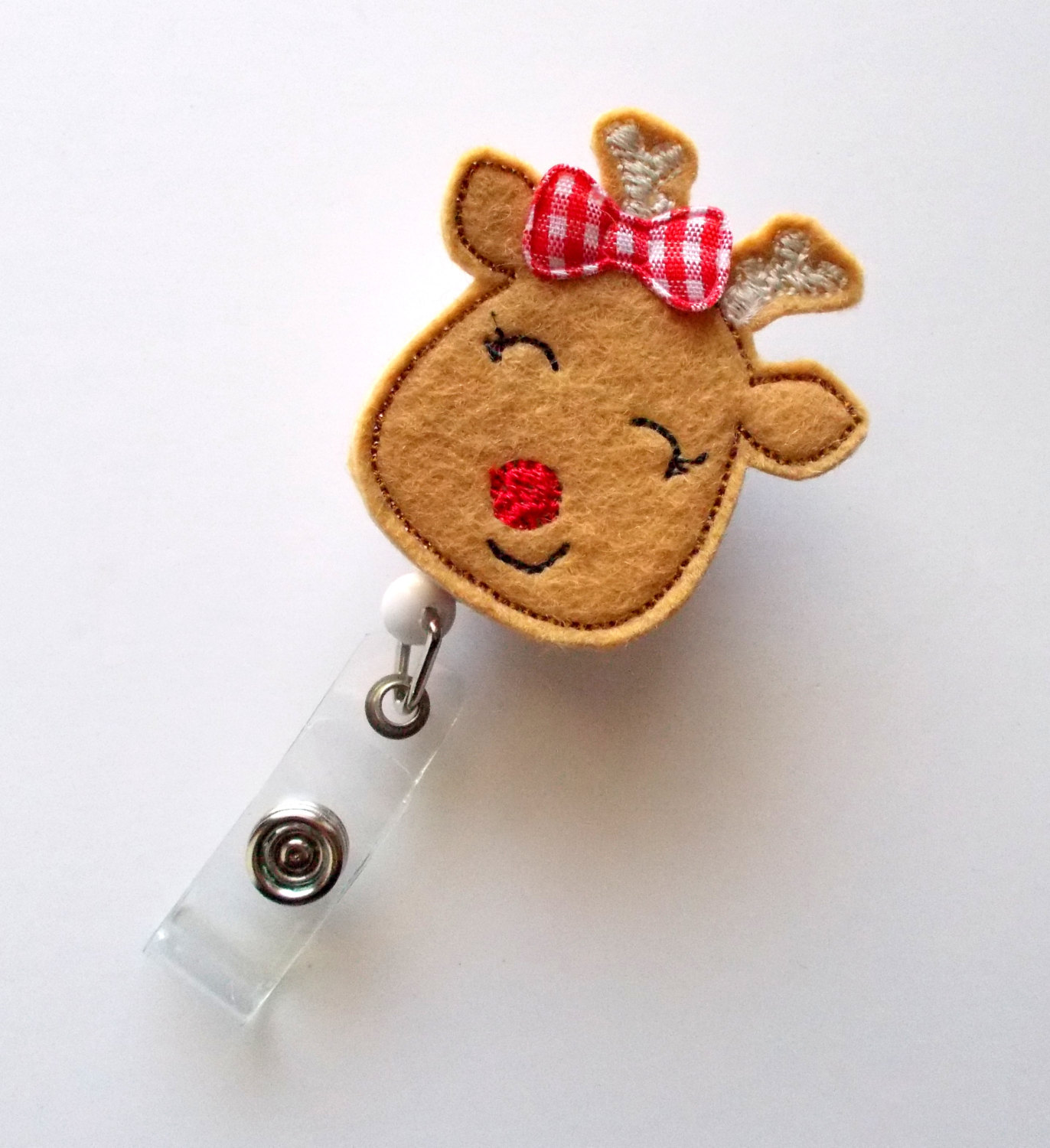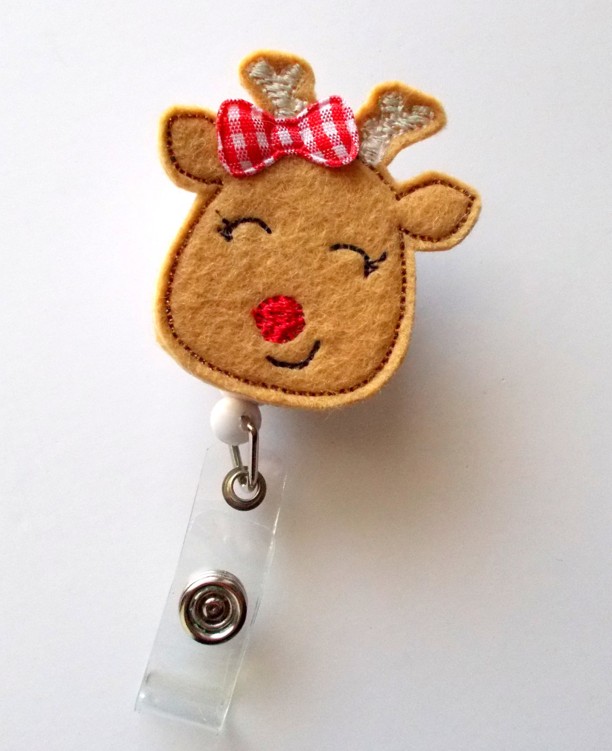 This retractable ID felt badge holder features a reindeer felt applique, accented with a red and white gingham checked bow.