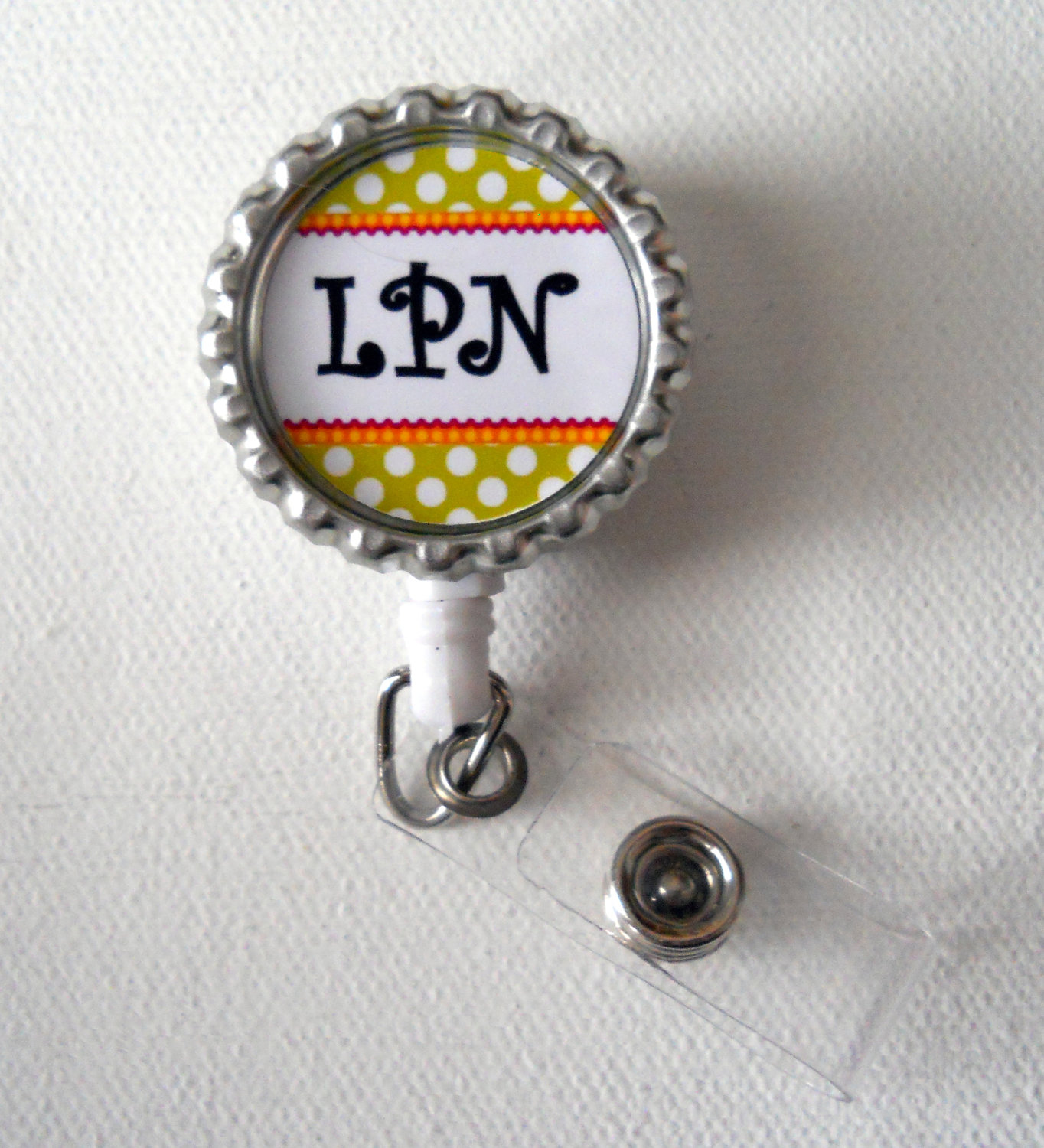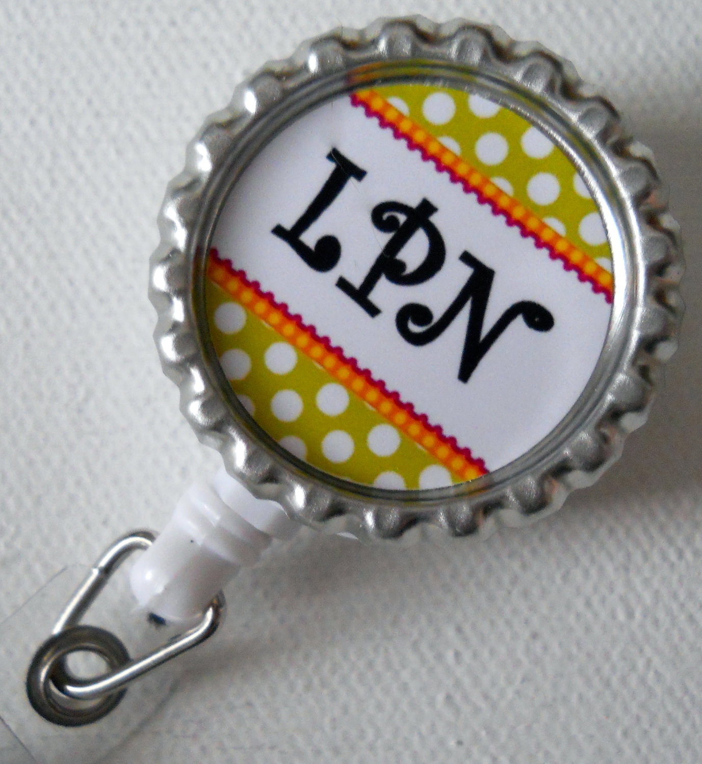 This bottle cap badge reel features the initials LPN. Need RN, CNA, a personalized name or other initials just let me know and I can customize it just for you. See the 4th picture in this listing for a sample of colors available.