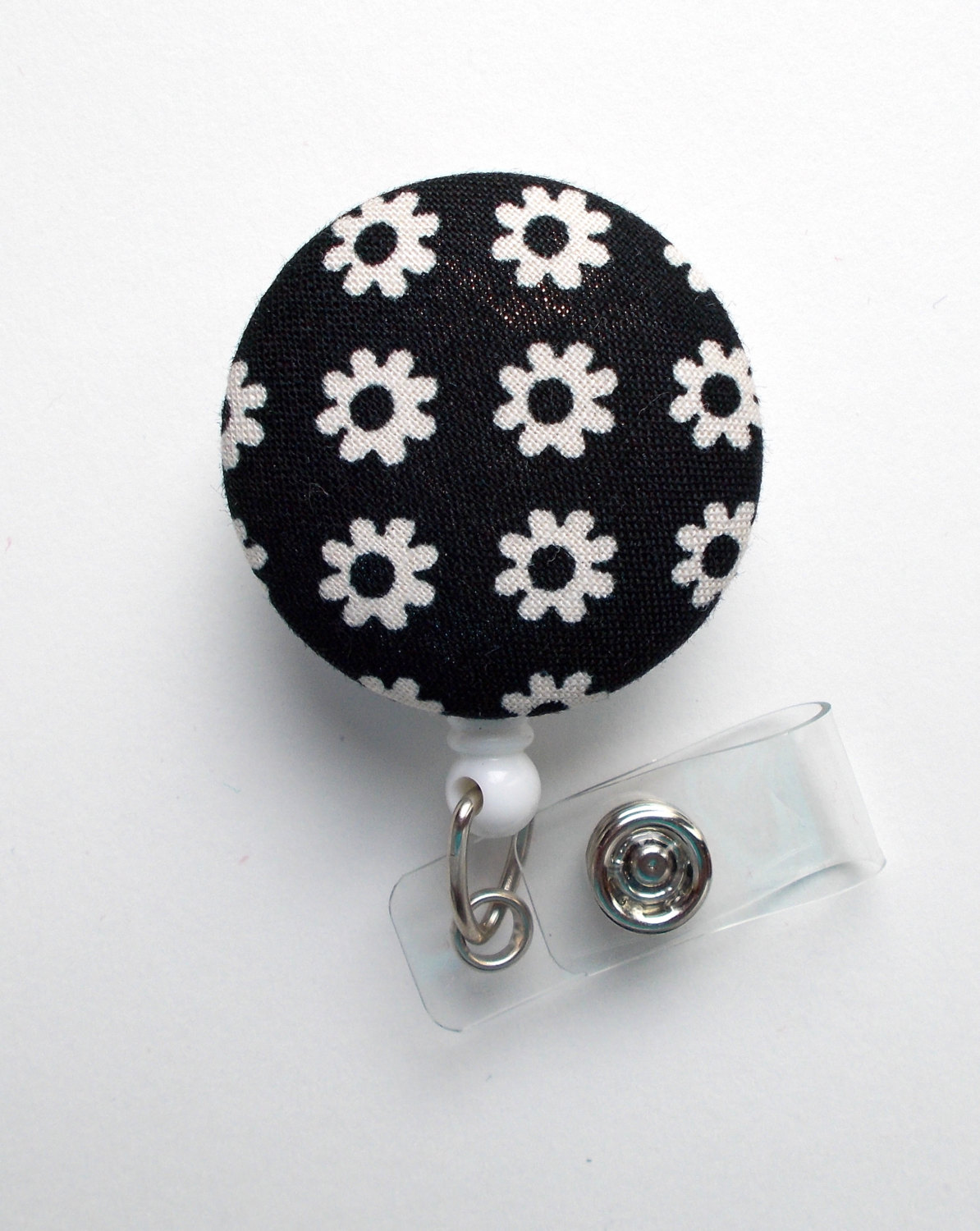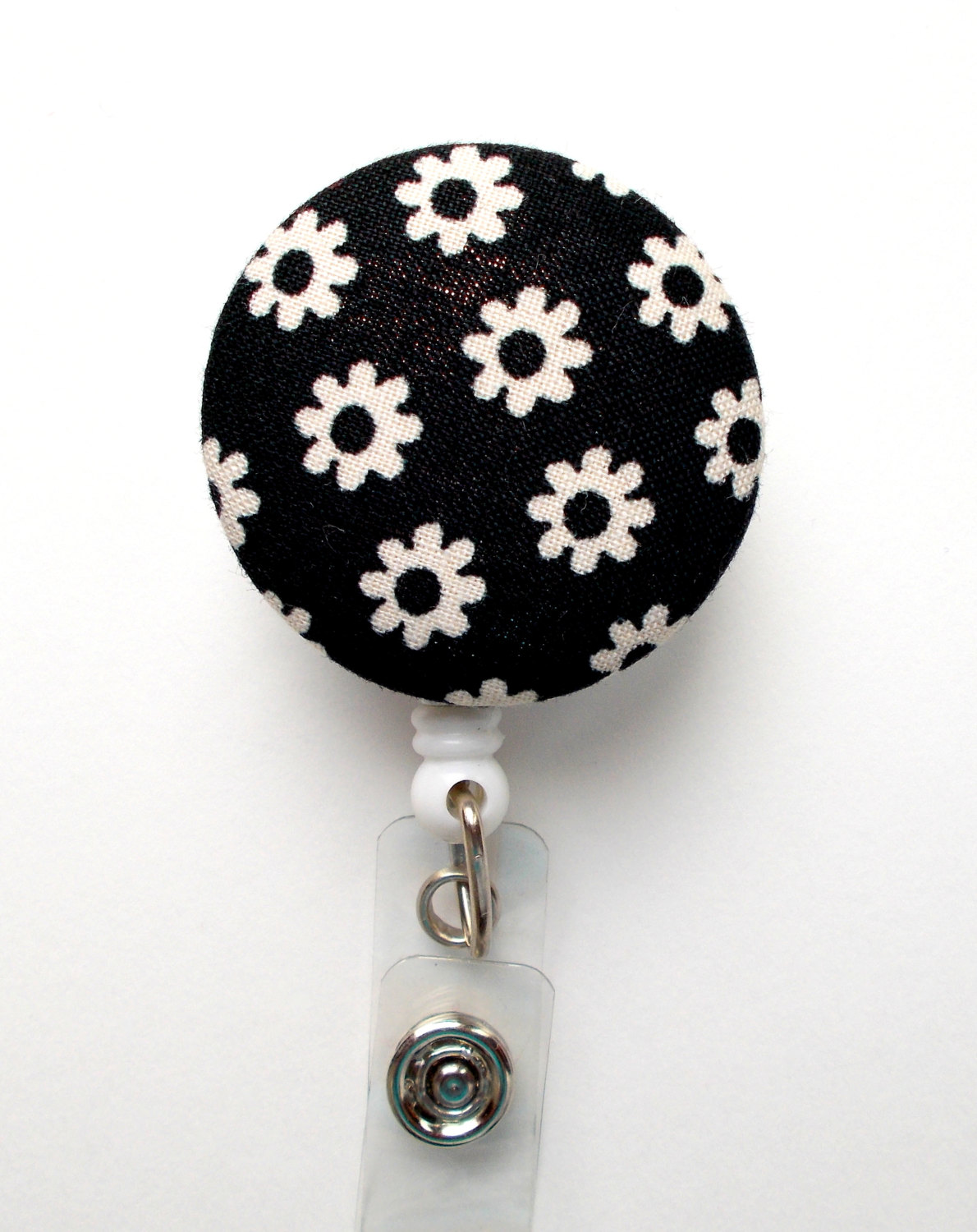 This ID badge reel features a white and black daisy fabric covered button. Button sits on a white, hard plastic badge reel.